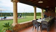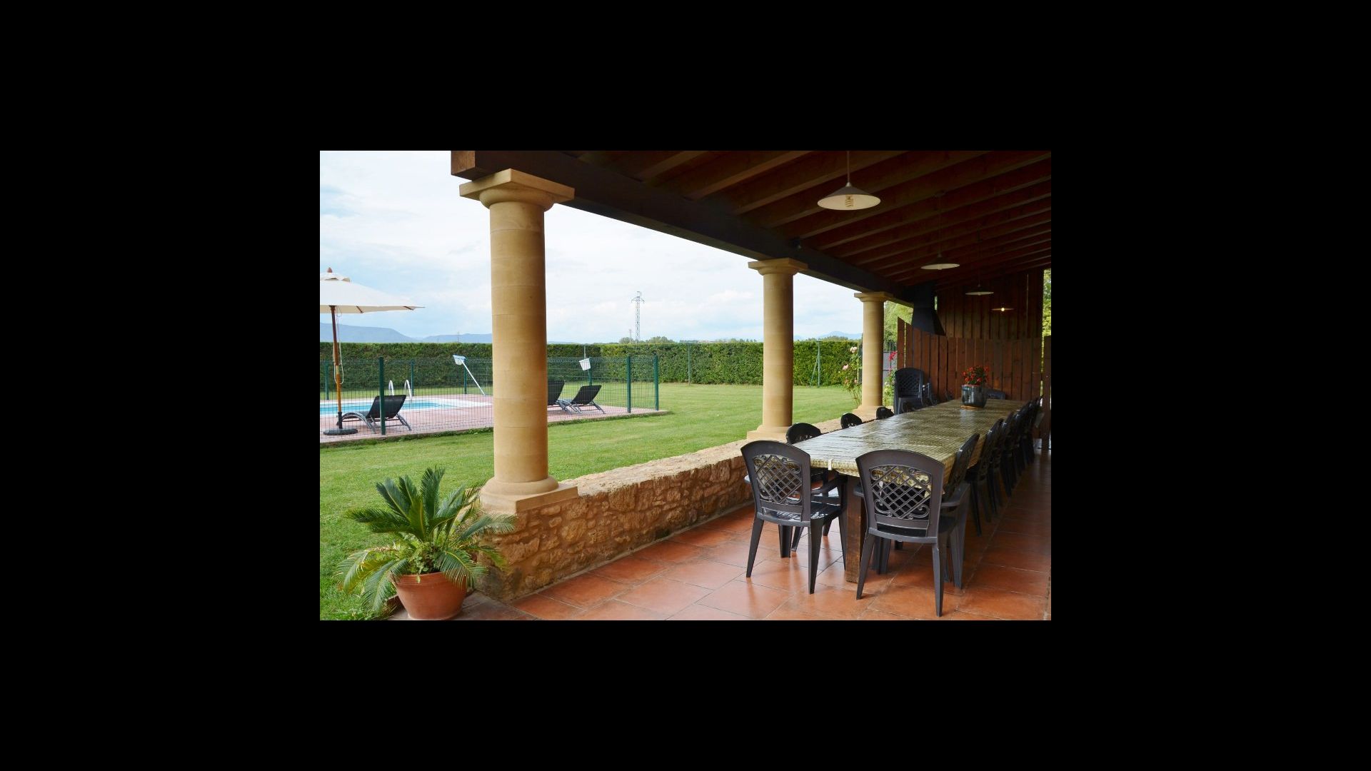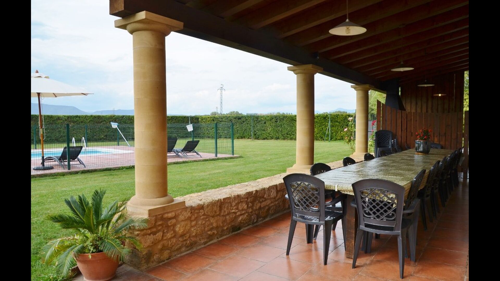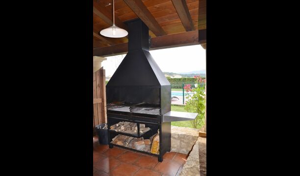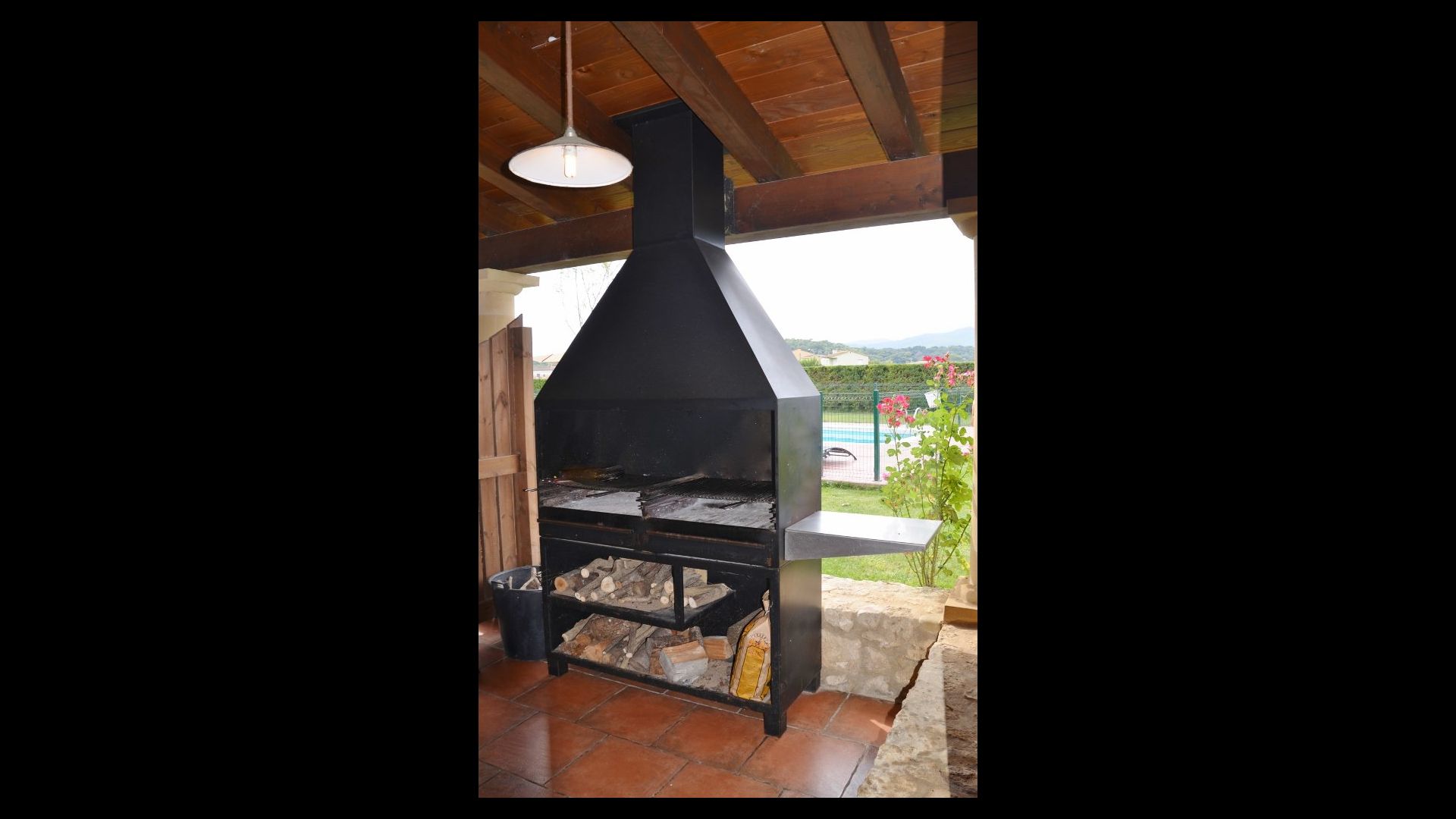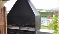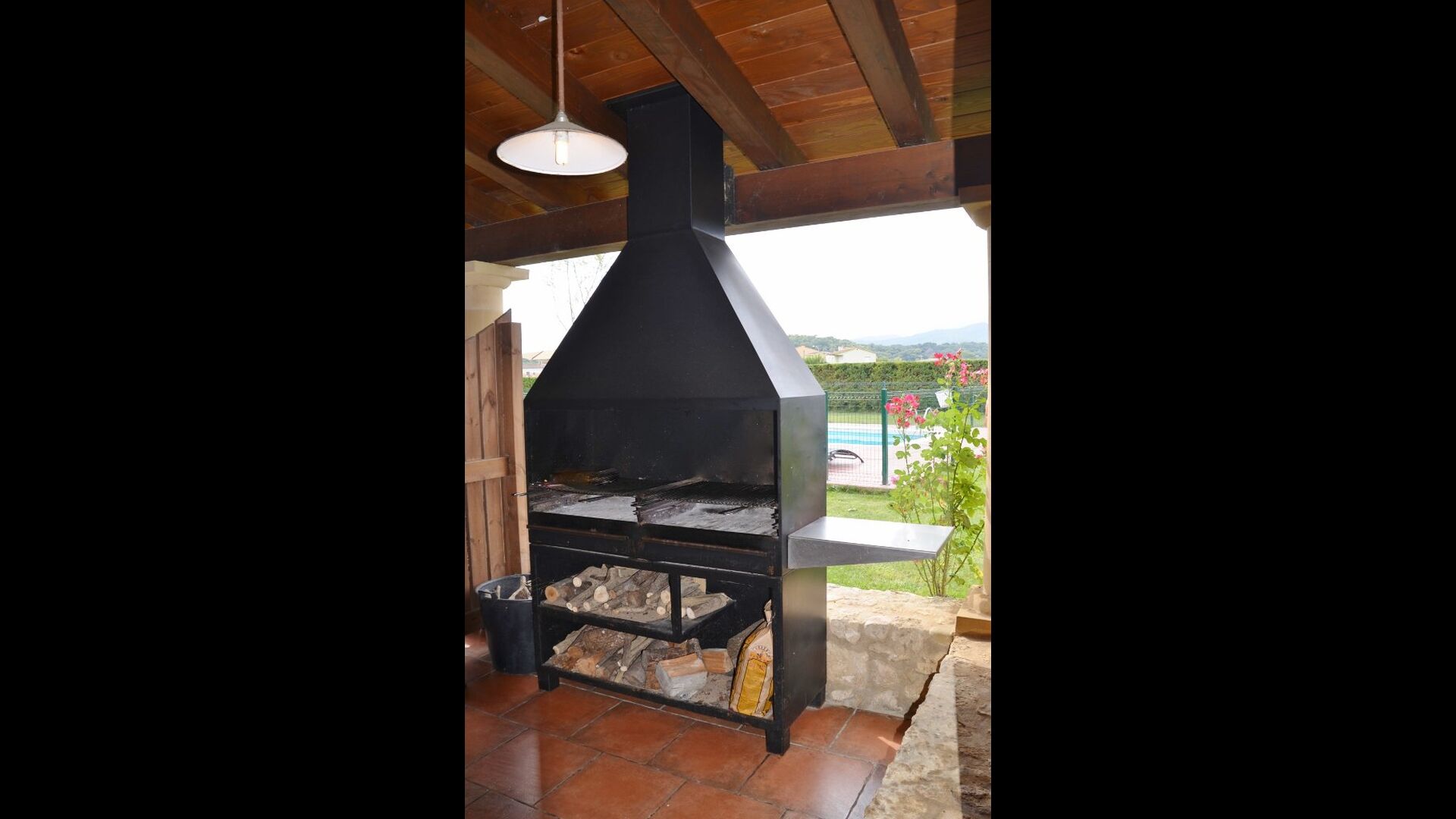 Grande terrasse couverte avec barbecue, directement reliée à la cuisine