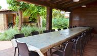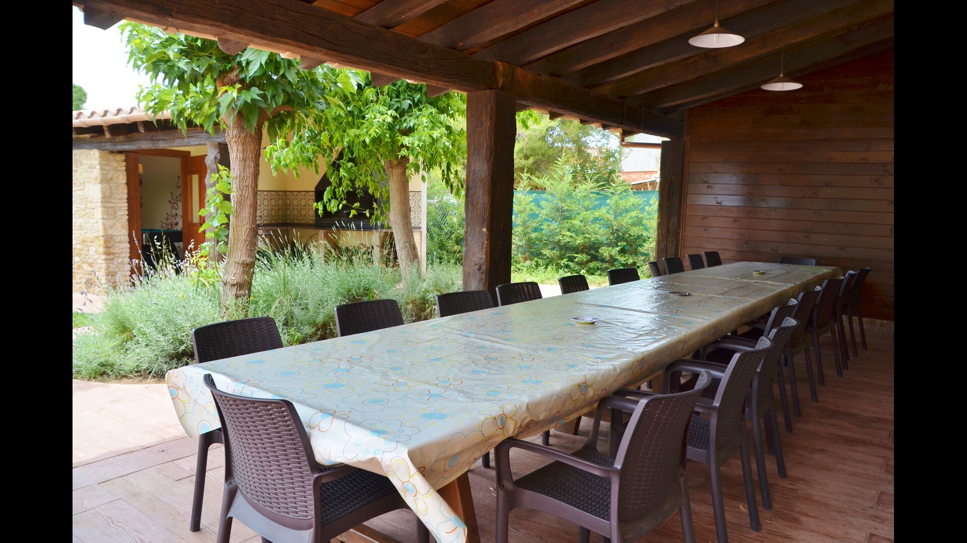 Dans le jardin, juste à côté de la maison, il y a une immense terrasse couverte où se trouve un grand barbecue et une cuisine extérieure. À côté de cela, il y a une longue table à manger. Ici, vous pourrez cuisiner et savourer un dîner fait maison pendant les chaudes soirées.