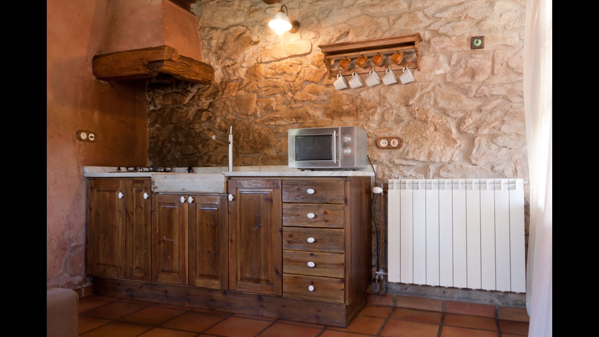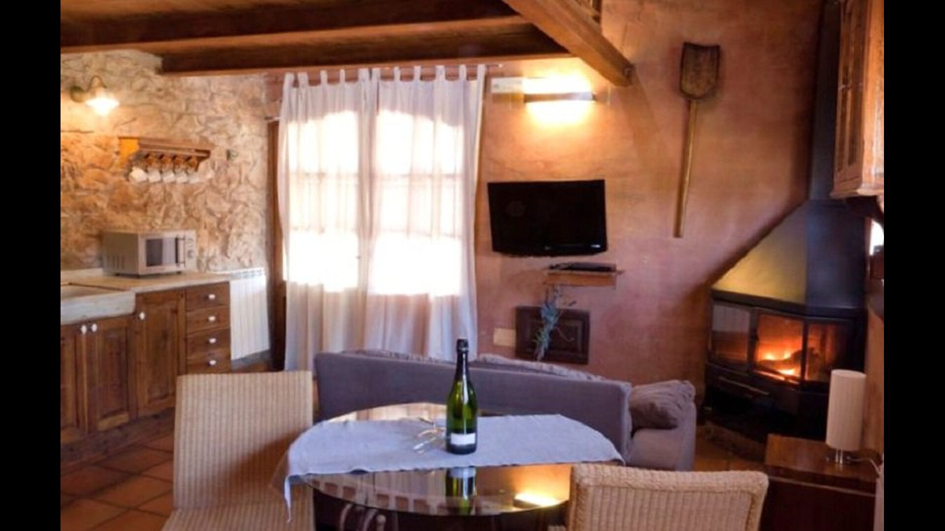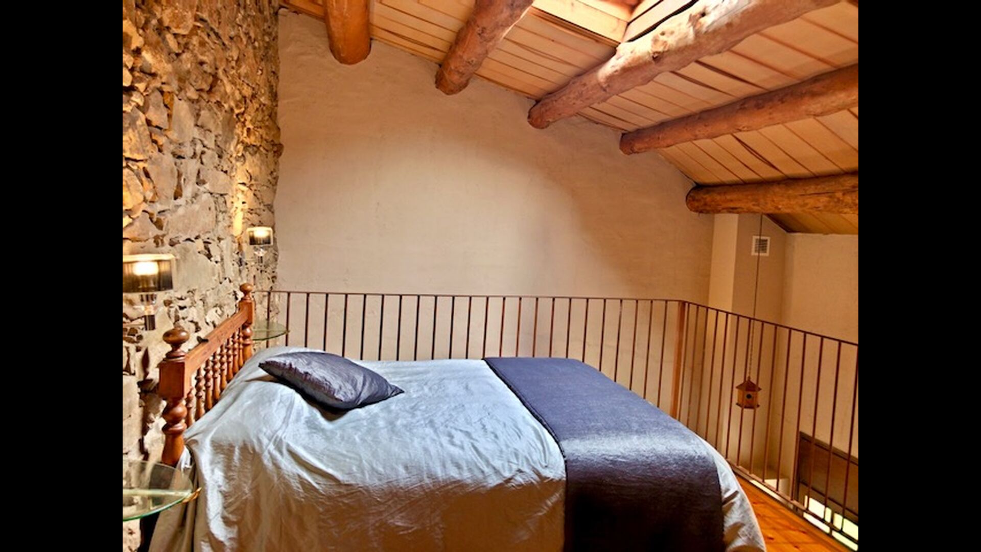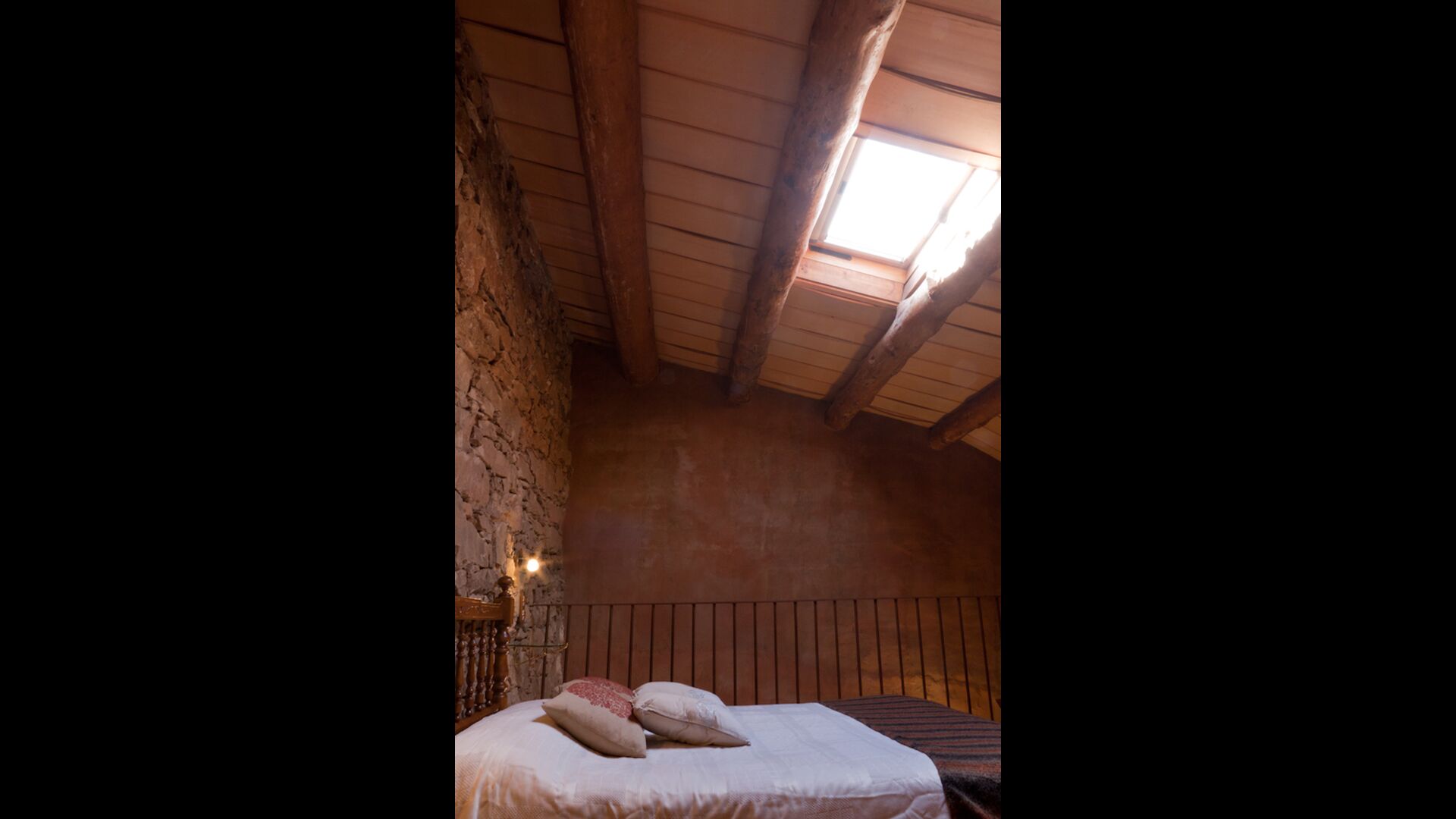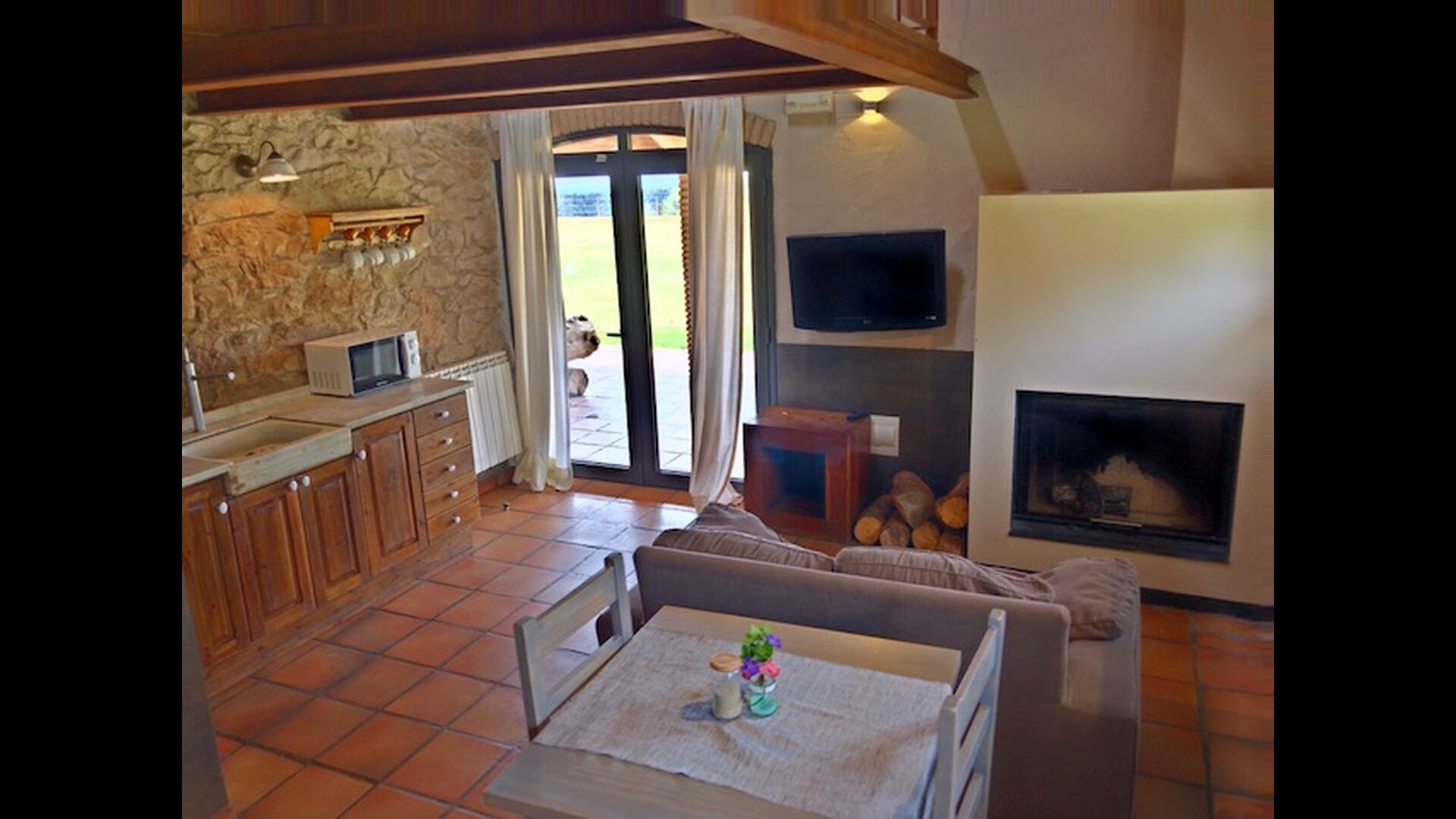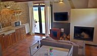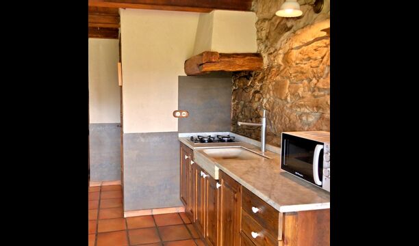 In this apartment, Piso Nio, there is room for two people. There is one double bed, which is a perfect base for a couple. There is also a modern bathroom. The flat has a size of 60 m2. Overall it is arranged very authentic and traditional in a Catalan style. It is also clear that there are a great respect for original materials and structures. This will provide, along with the fantastic location of the house, a good and romantic atmosphere. Furthermore there is a nice kitchen where the owners have done a lot to keep it traditional Catalan. In this there are a fridge, a stove, a dishwasher and a washing machine. In the same room there is a soft couch, where you can watch TV and there is a fireplace. Upstairs there is a spacious bedroom with a nice double bed. Outside there is a terrace next to the apartment next door. Here you can read a book or just relax in the shade if it gets too hot. However the best thing about the apartment is almost the breathtaking views that can be enjoyed. There is a very special calmness and peace that is unique to houses in the mountains.