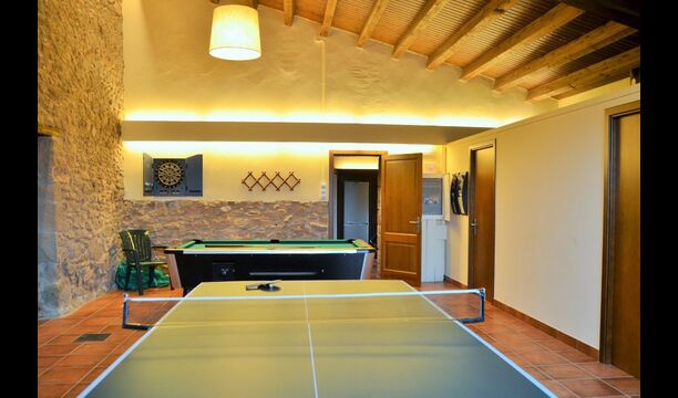 Au rez-de-chaussée de la maison, vous entrez dans un beau hall d’entrée. À gauche du hall se trouve la cuisine moderne avec un congélateur, four, micro-ondes, plaque vitrocéramique, lave-vaisselle et cafetière. La cuisine a un accès direct à la grande salle commune qui a une belle table de réfectoire catalan (pour si vous voulez manger à l'ombre un ou deux jours) et un salon confortable. Depuis les portes coulissantes de la salle commune, vous avez un accès direct à la terrasse pavée. Le barbecue de la maison est un peu plus bas dans le jardin. Si vous tournez à droite de la cuisine, vous rencontrerez la salle d'activités, qui sera probablement le point de rencontre de quelques bonnes heures, surtout pour les enfants du groupe.