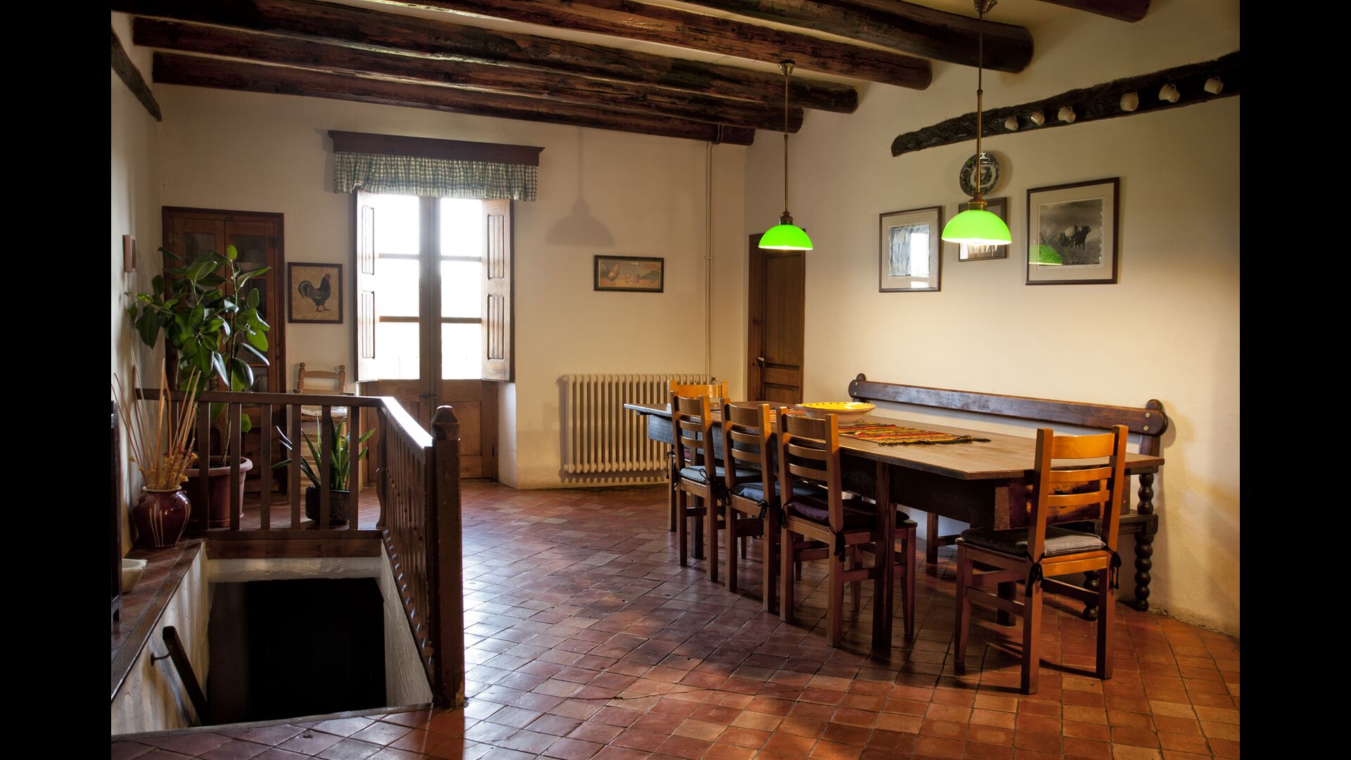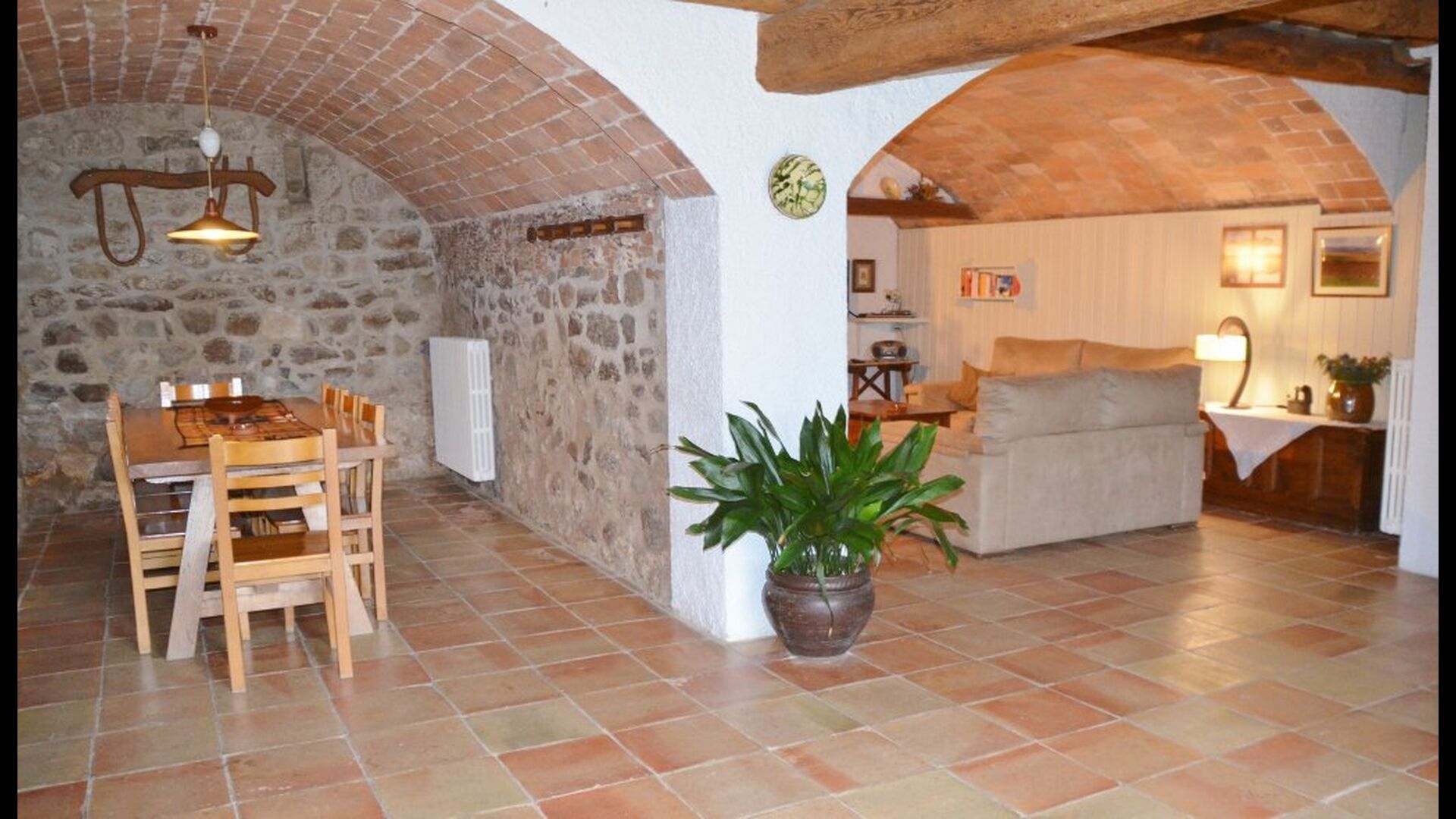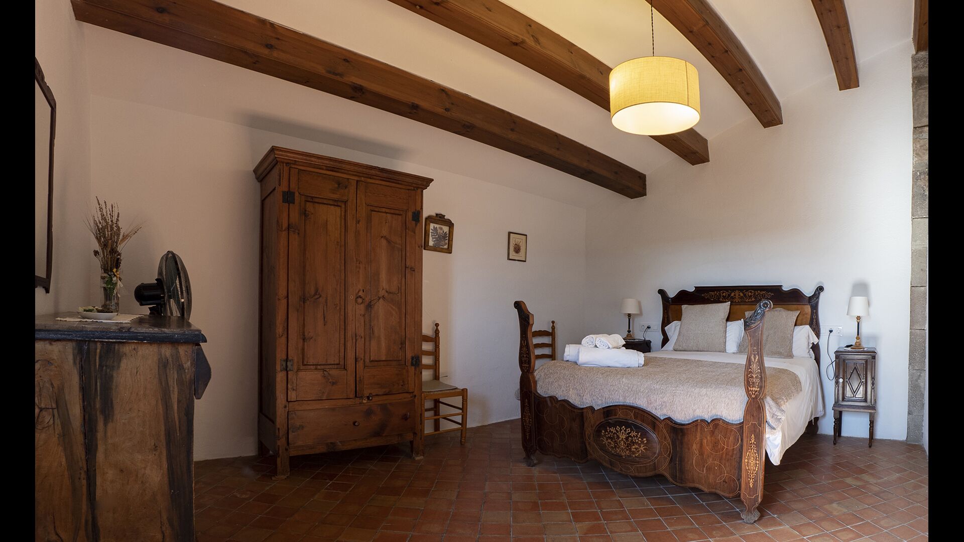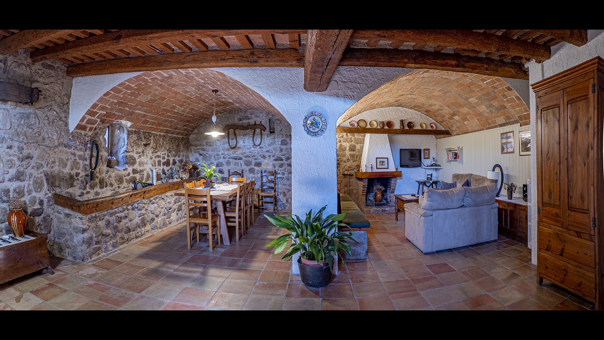 Casa Romira a un total de trois étages. À l'entrée principale, vous trouverez une petite table à manger et des canapés avec une télévision. Cette chambre est joliment décorée avec quelques pièces de vieux outils de ferme catalans. De là, vous trouverez un escalier qui monte au premier étage, qui a une taille de 250 m2. Ici vous pouvez trouver une salle à manger, la cuisine, une petite salle confortable avec cheminée, 5 chambres à coucher, 3 salles de bain et accès à la terrasse, où vous pouvez voir dans la ferme susmentionnée.