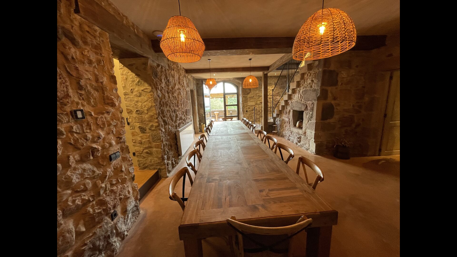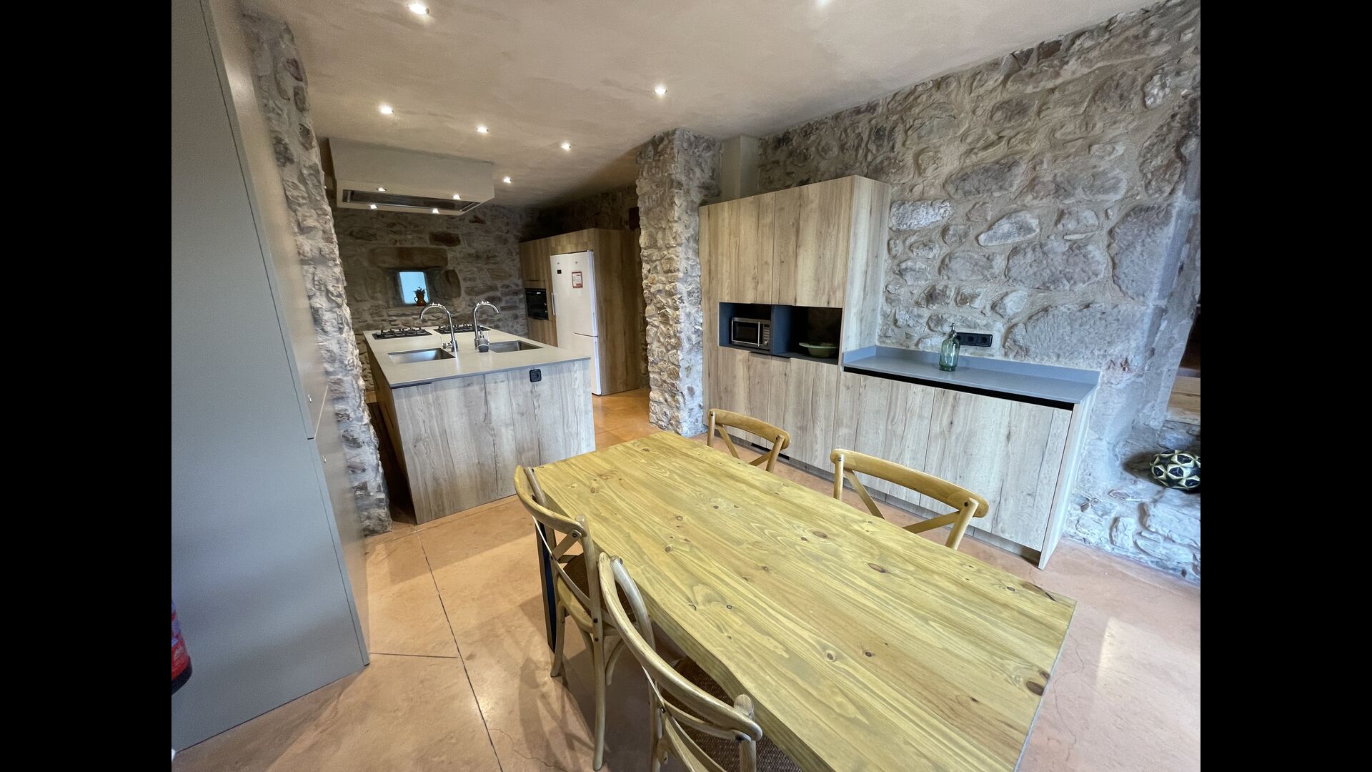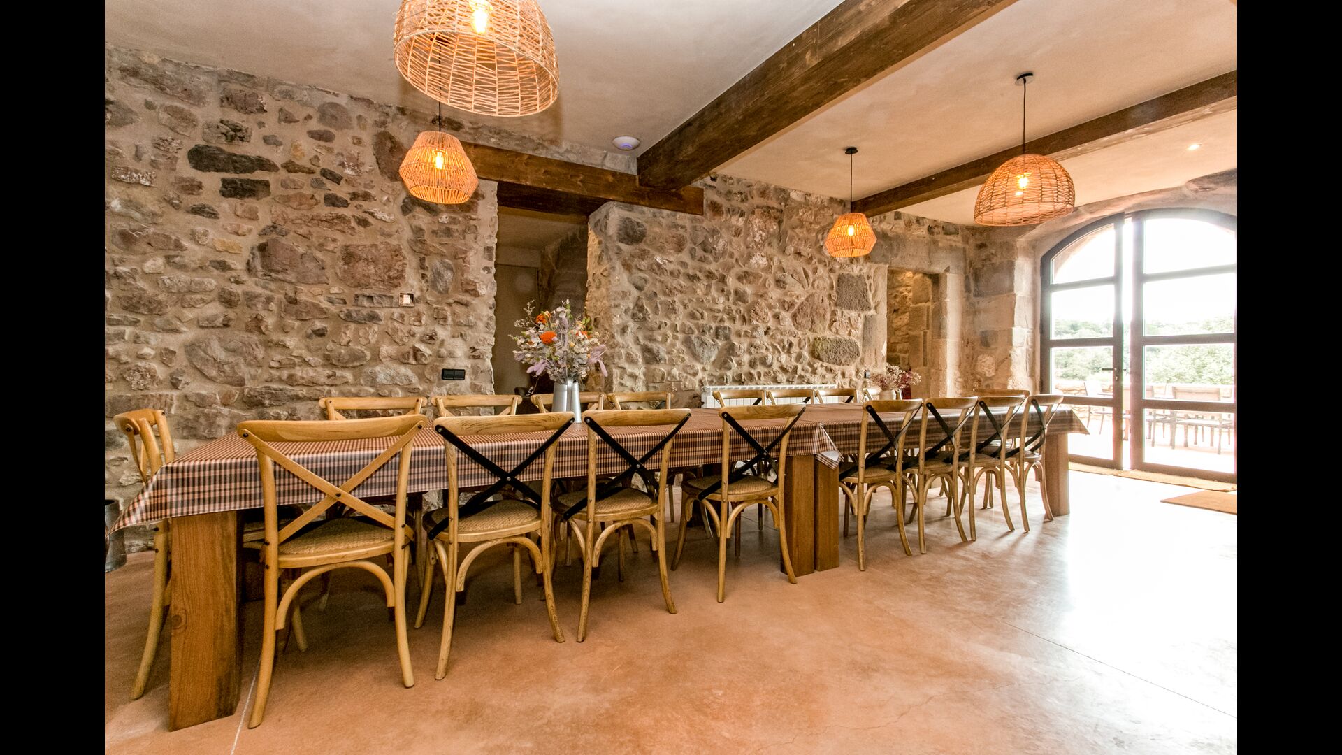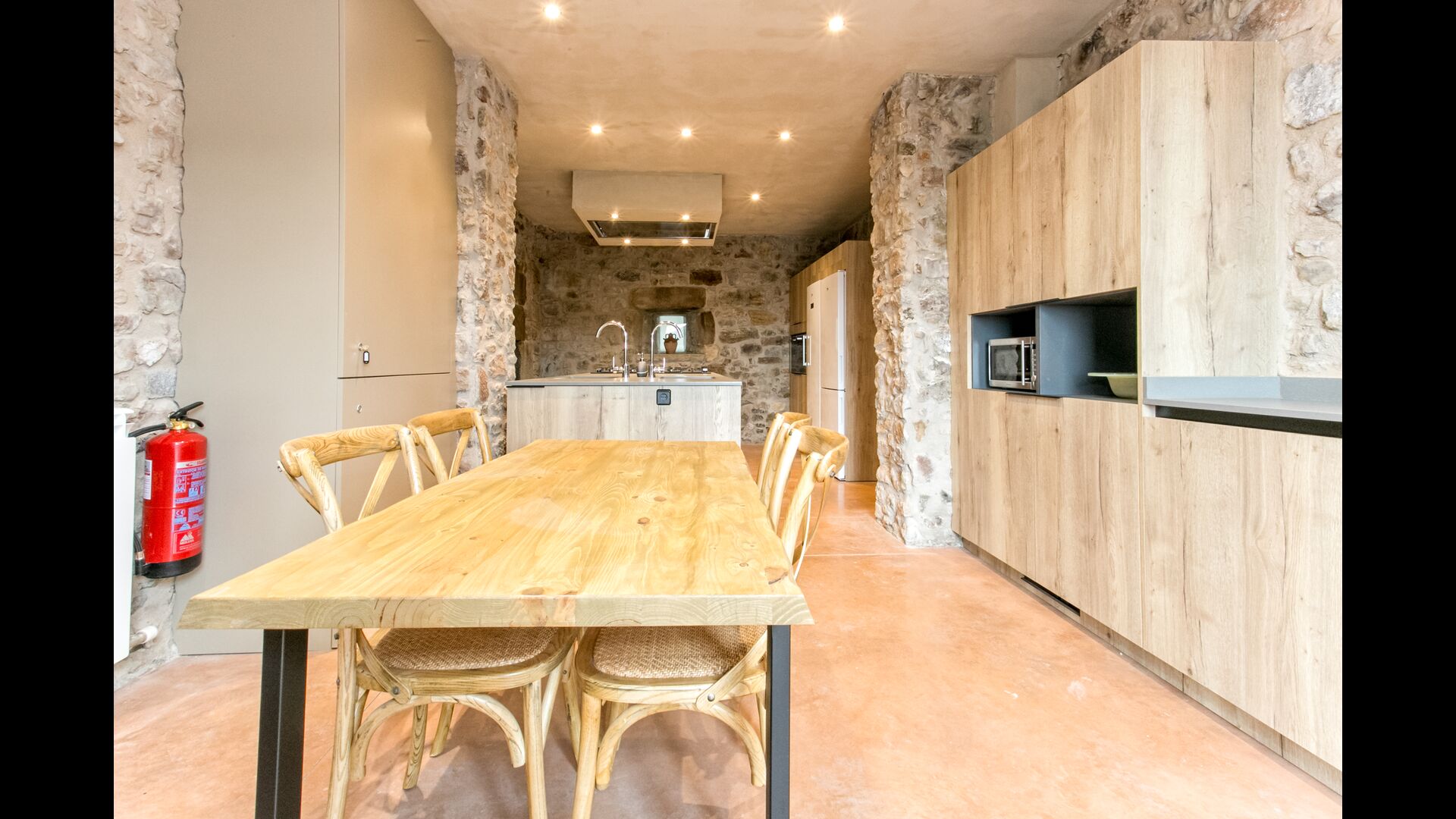 De la terrasse extérieure, dotée d'un barbecue, d'un espace pour manger et de transats pour se détendre, on entre directement dans la grande salle à manger du Mas. Celui-ci agit comme le cœur de la maison, reliant les deux petits salons du rez-de-chaussée à la grande cuisine. La cuisine est entièrement équipée avec 2 plaques de cuisson au gaz, 2 lave-vaisselle, 2 réfrigérateurs avec congélateur, four, micro-onde et cafetière, ainsi qu'une petite table de petit-déjeuner.