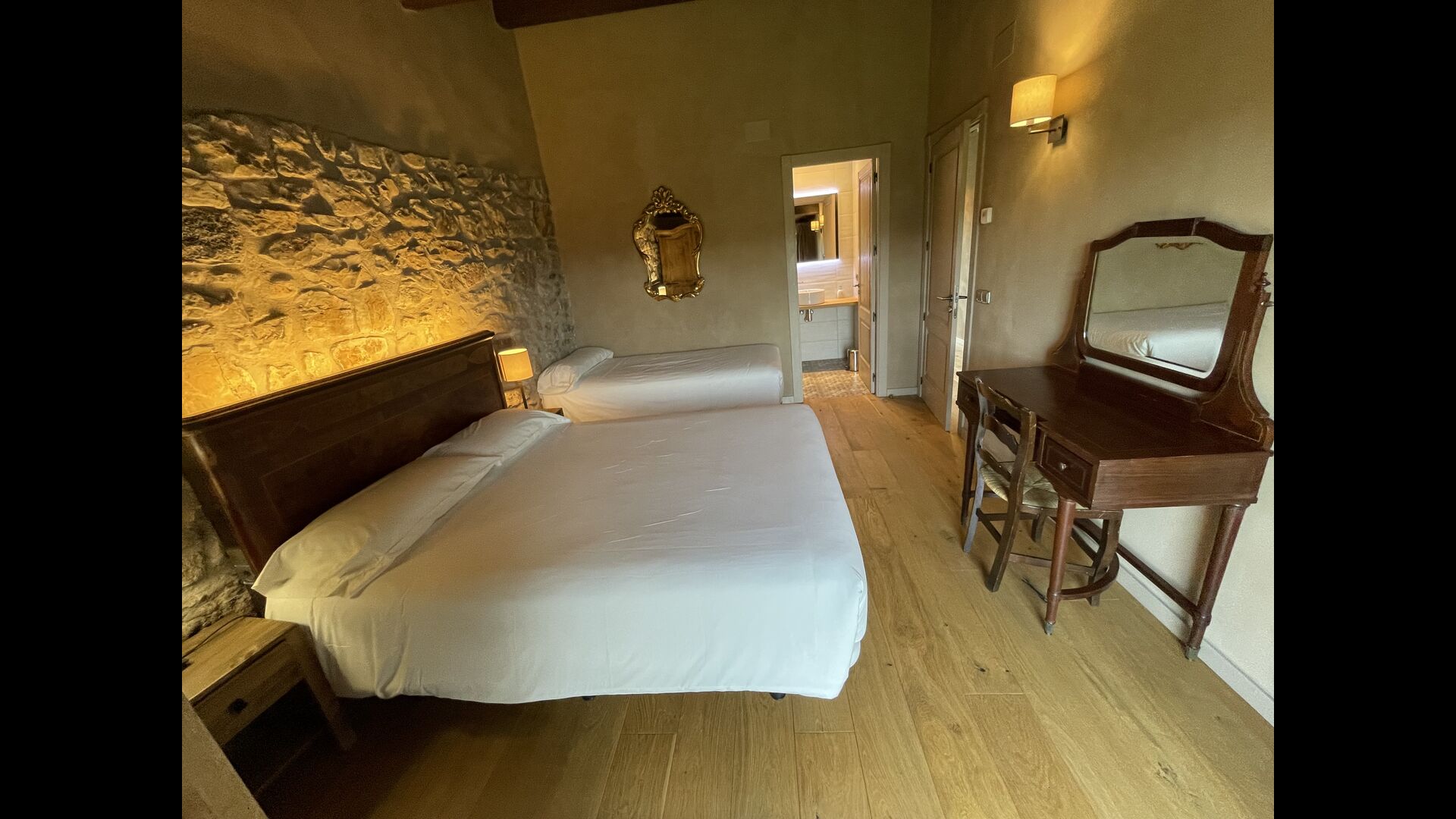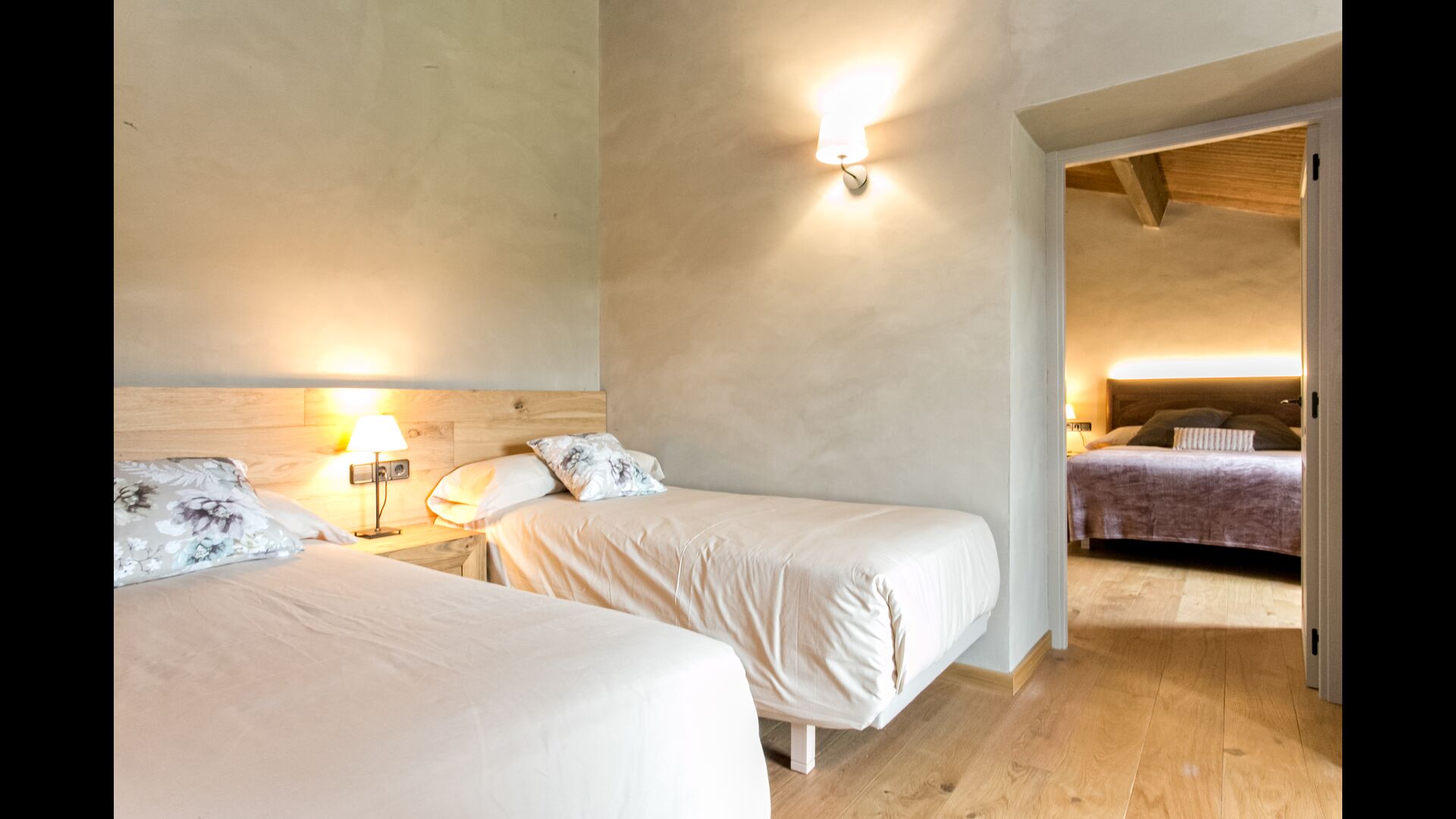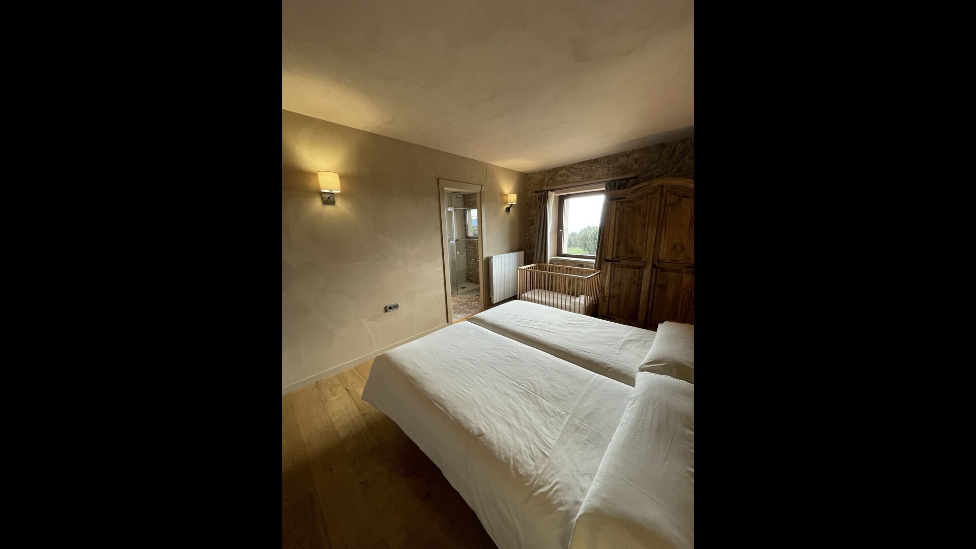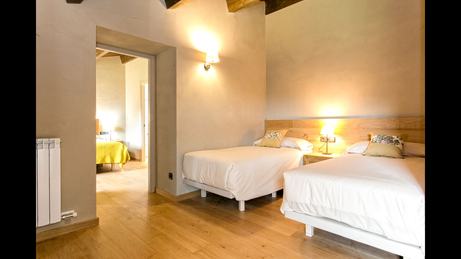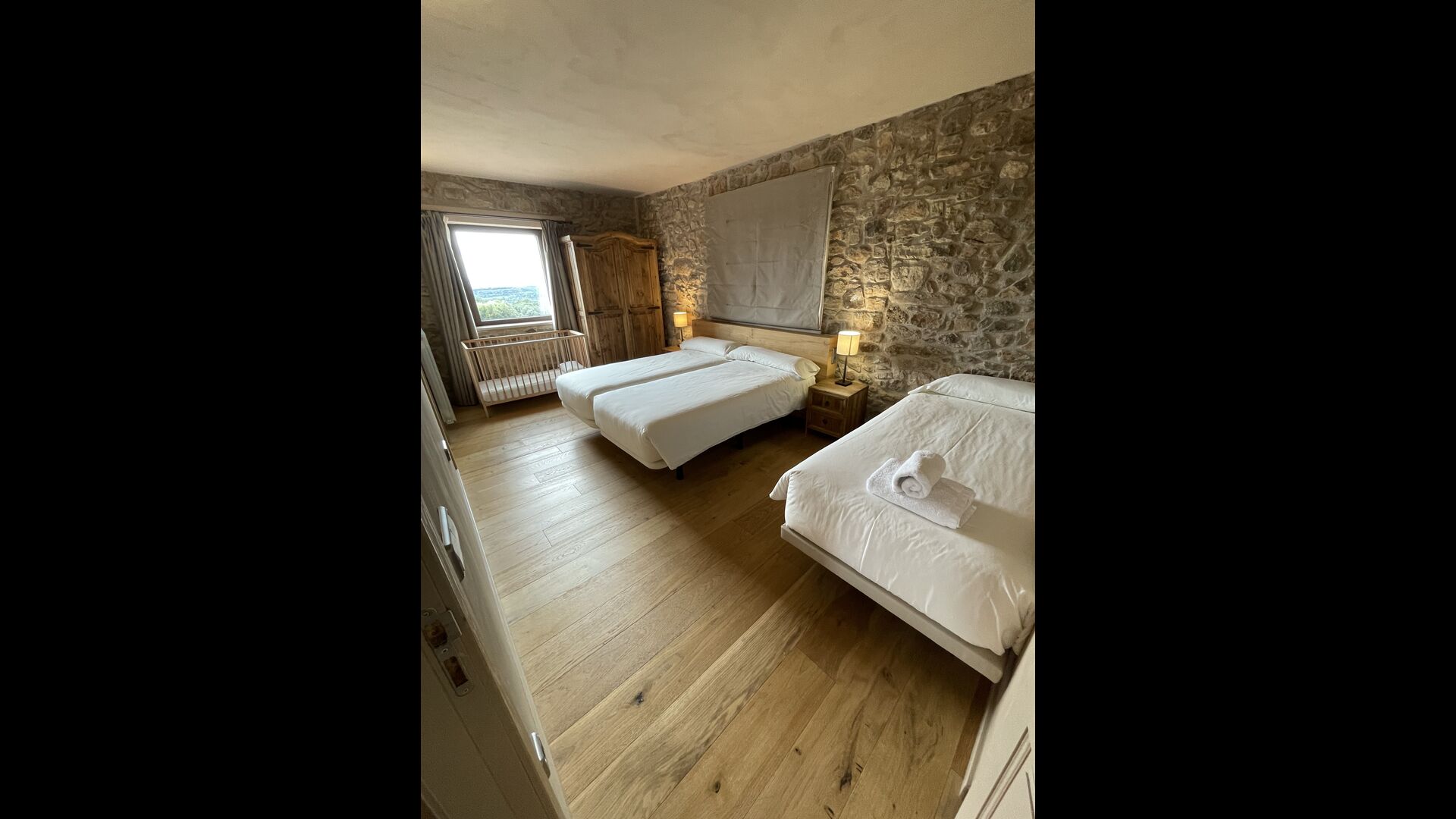 Au premier étage, vous trouverez 6 grandes chambres doubles avec vue sur la nature, toutes avec salle de bain privée. Au deuxième étage, nous trouvons 2 autres chambres doubles et 2 chambres quadruples (avec deux lits simples et un lit double, séparés par une porte). Ceux-ci ont également toutes les fenêtres extérieures et une salle de bain privée complète.