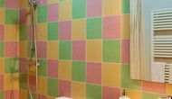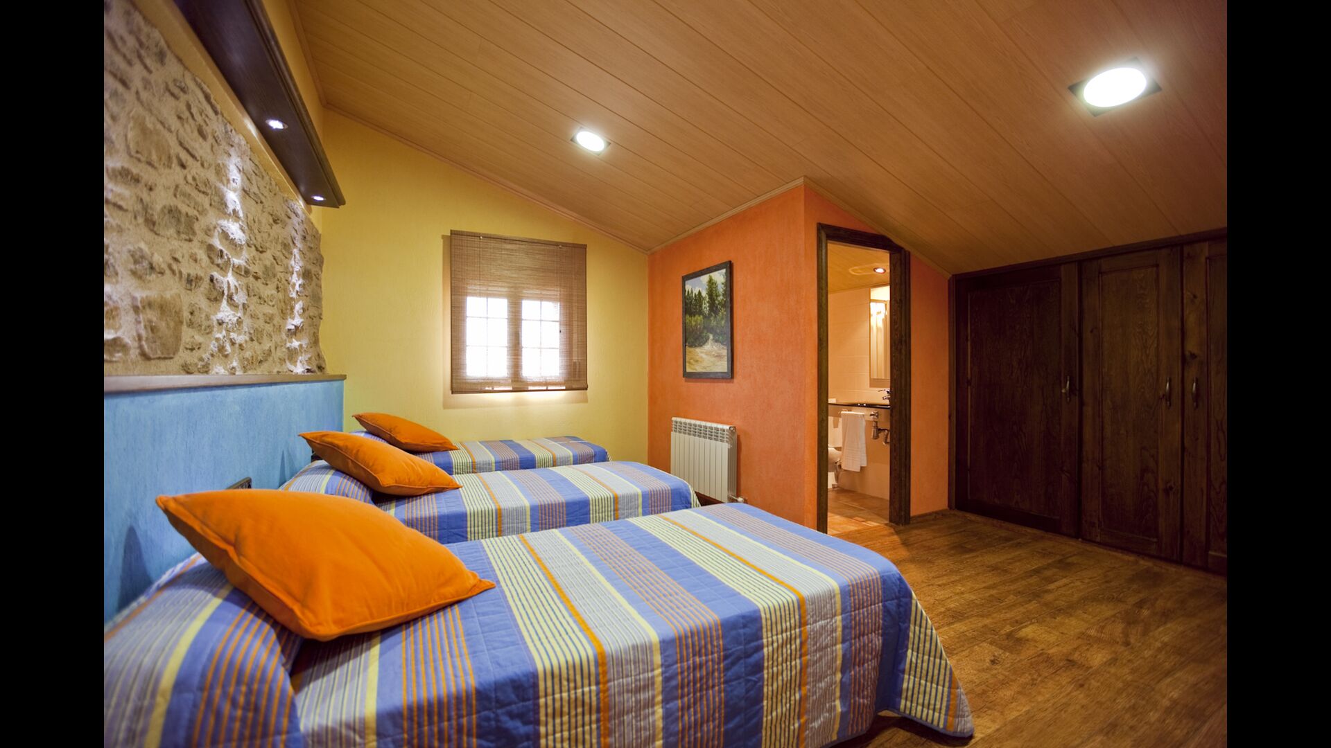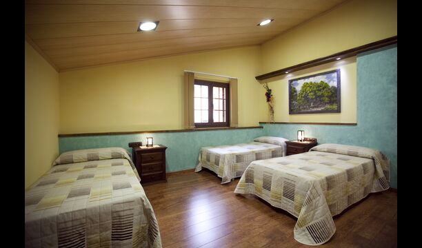La plus grande partie avec 5 chambres est située au premier étage de la maison principale. Il y a une capacité pour 12 personnes, réparties en 3 chambres doubles (2 avec lits doubles) et 2 chambres triples. Quatre des chambres ont une salle de bain attenante, et la cinquième chambre a aussi une salle de bain, mais pas ensuite. Il y a aussi une cuisine et une salle commune avec TV et DVD.