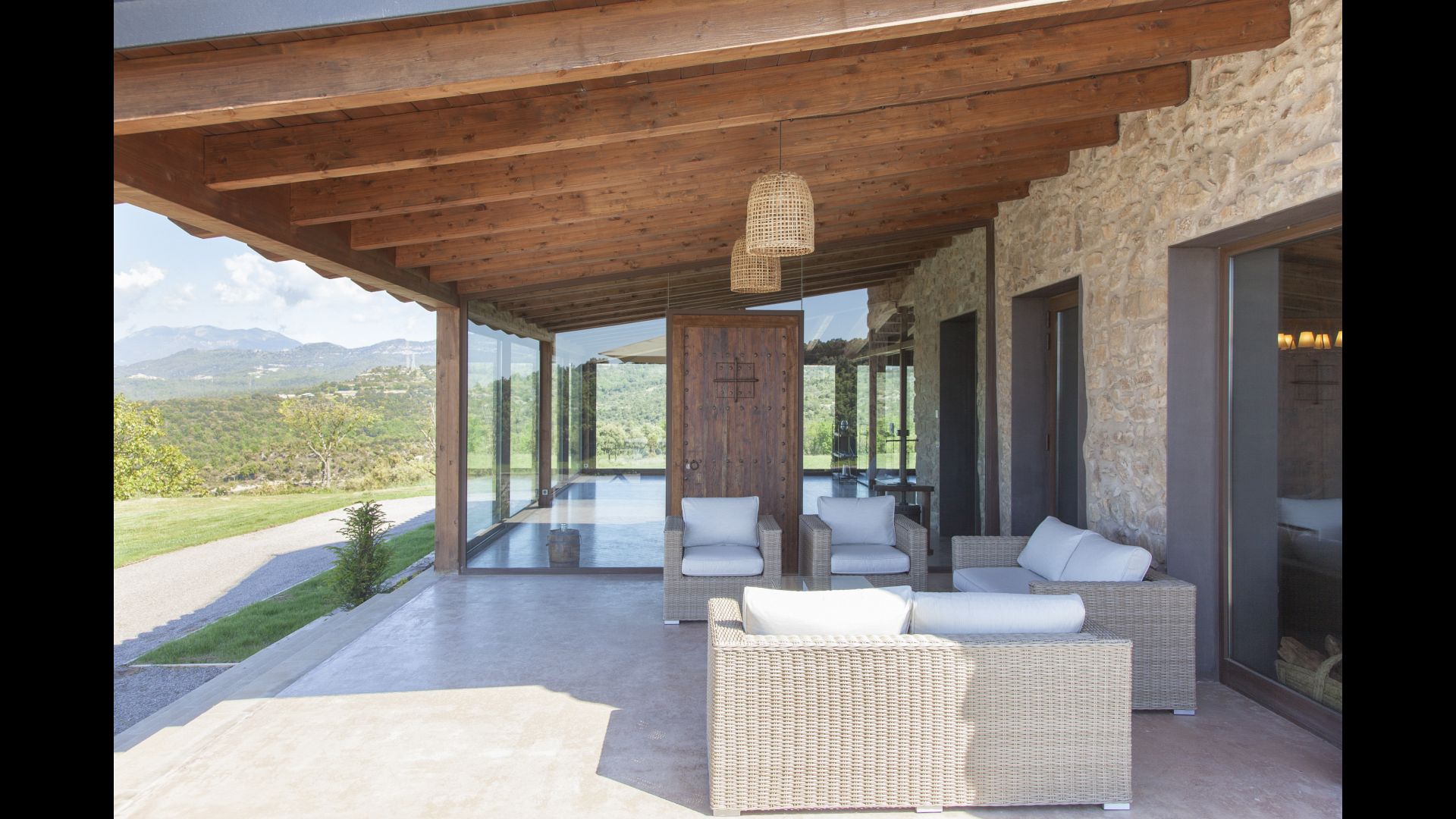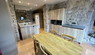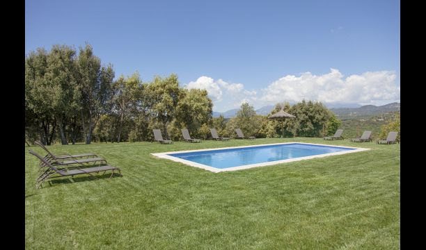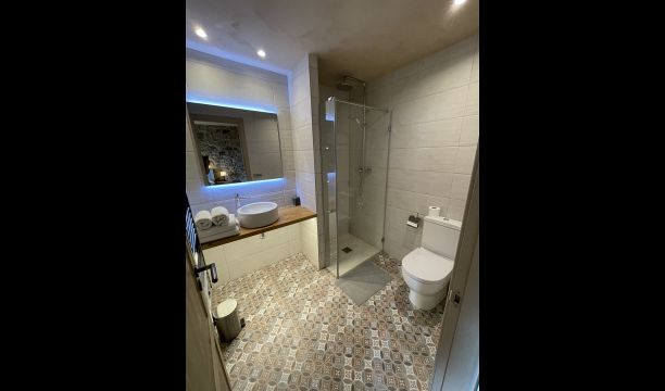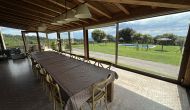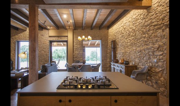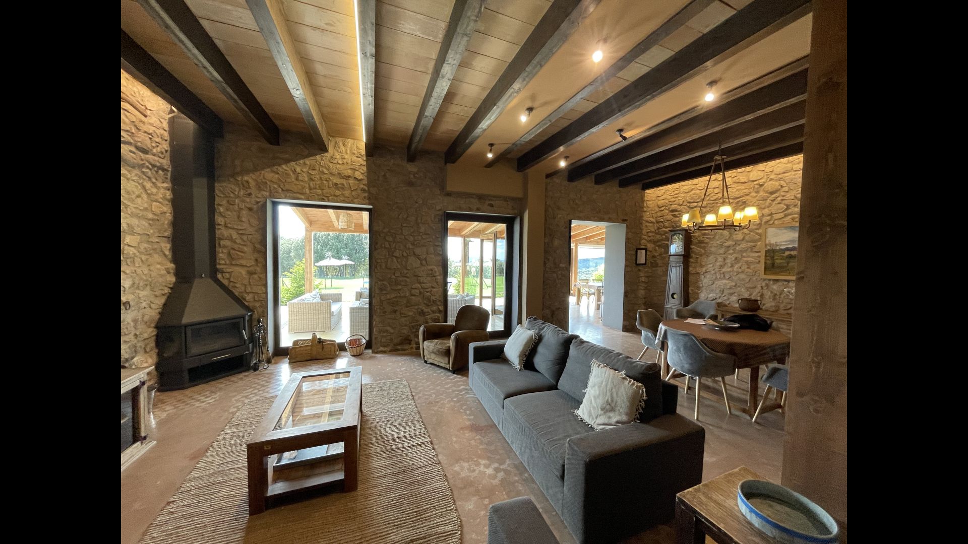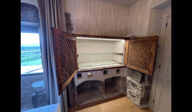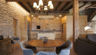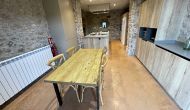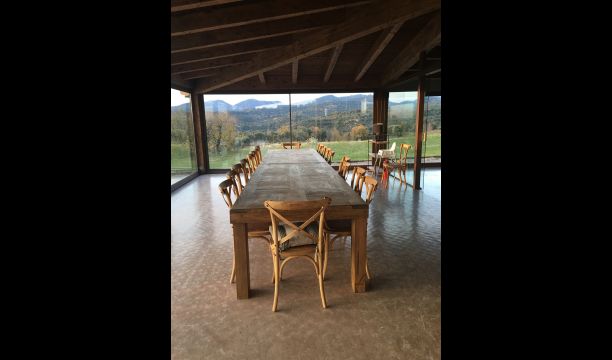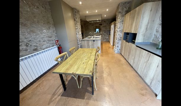 À l'entrée de la maison se trouve un porche situé en face de la piscine et offrant une vue spectaculaire sur les montagnes. Depuis le porche, vous pouvez accéder à la salle à manger, avec de grandes fenêtres ouvertes sur le jardin. Connecté à la salle à manger, nous trouvons la cuisine ouverte, avec des meubles en chêne, entièrement équipée. Thé 2 réfrigérateurs, 2 congélateurs, four, micro-ondes, cuisinière à gaz, lave-vaisselle, cafetière ... Dans la même pièce se trouve la cheminée, entourée d'une zone avec des canapés. À cet étage, il y a aussi une petite toilette gratuite.