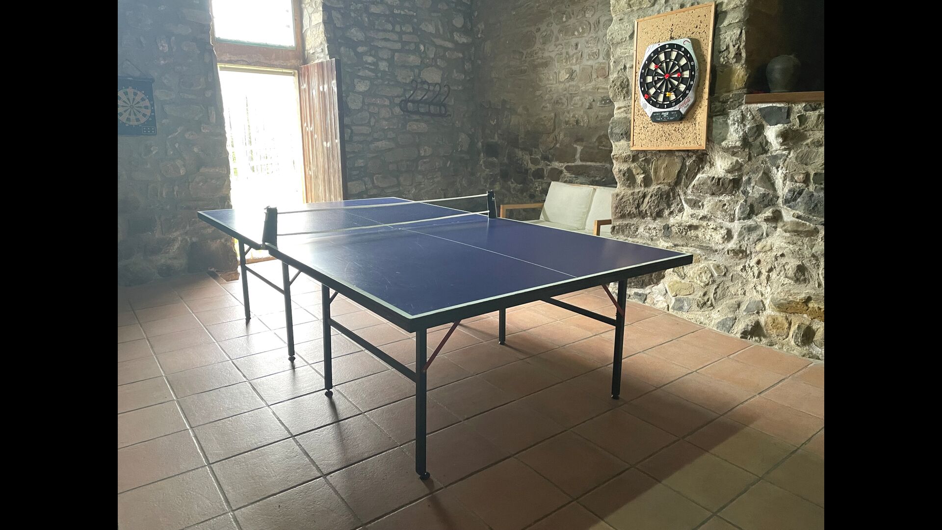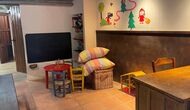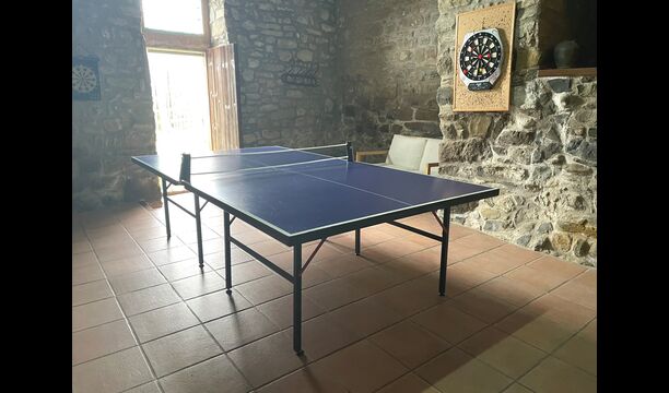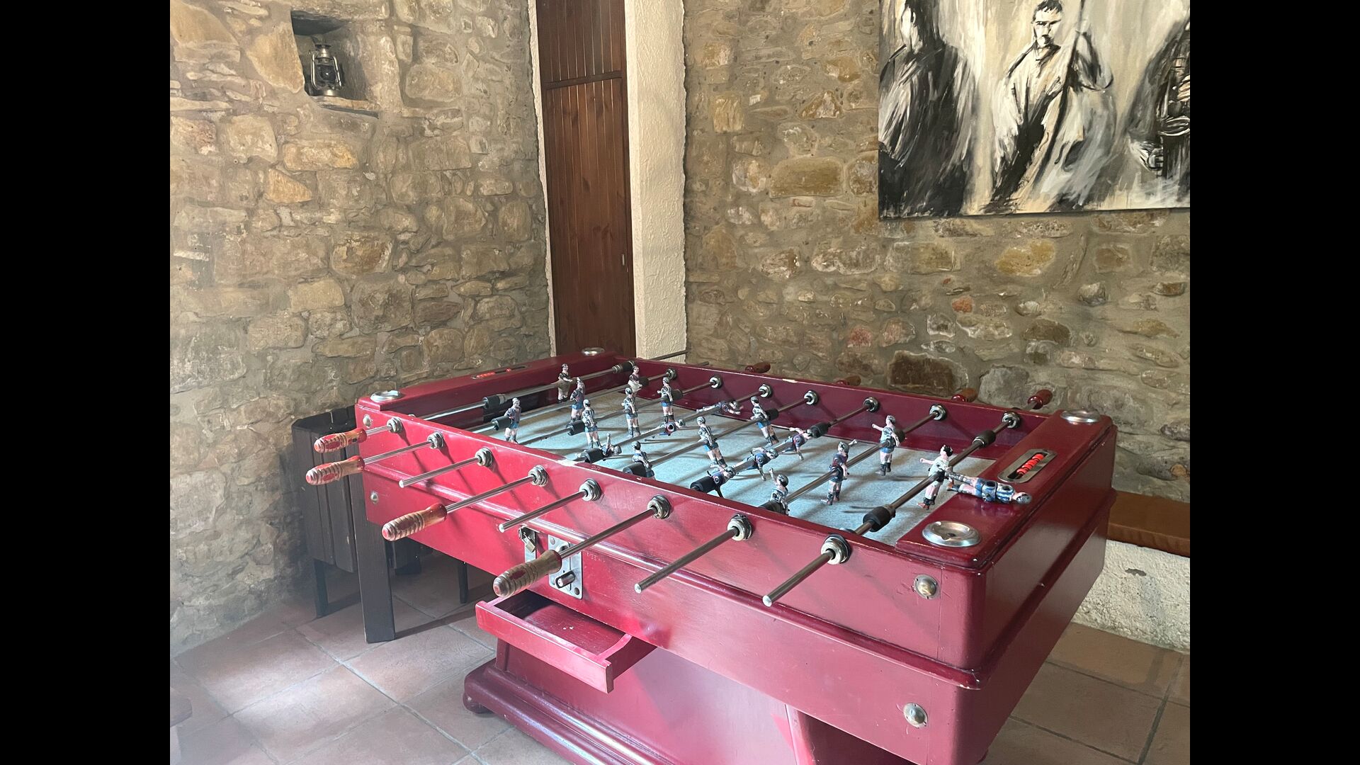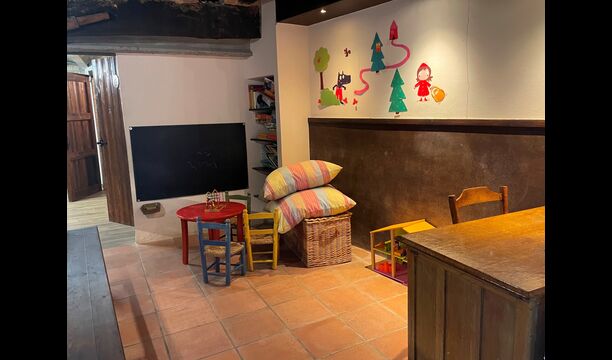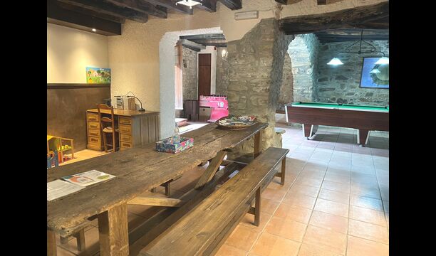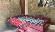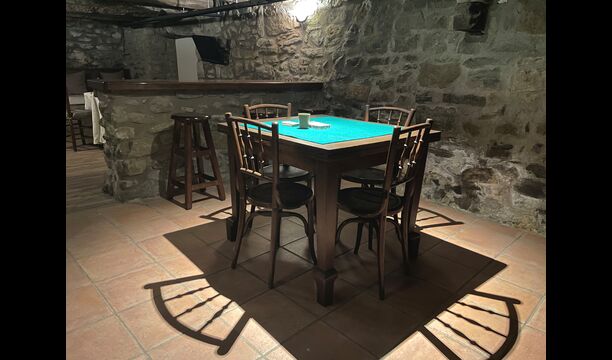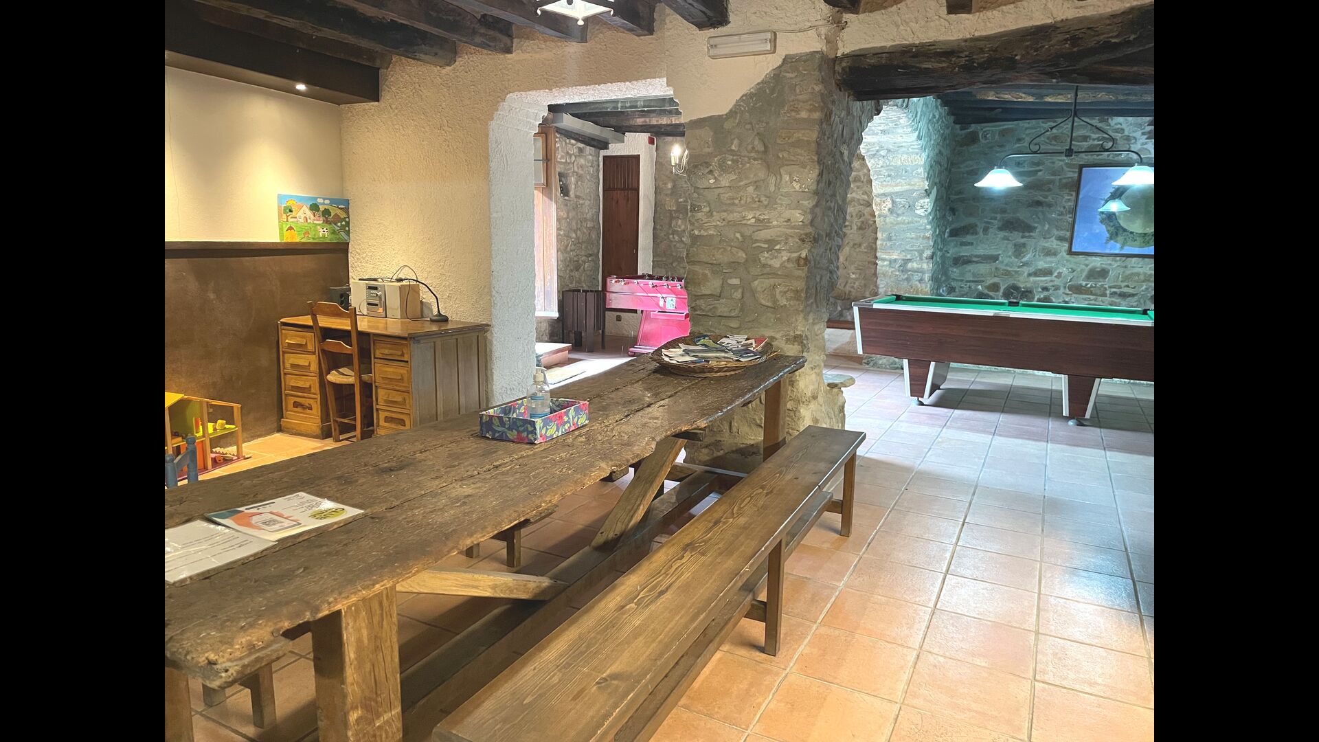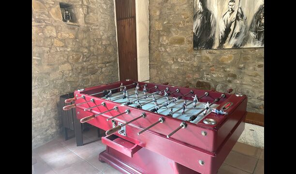 Le bâtiment à côté de la piscine se compose des deux appartements Soler I et Soler II, qui sont également reliés par l'intérieur. Au rez-de-chaussée, vous trouverez la grande zone d'activités, ce qui est super. Il y a un coin avec des jouets pour les plus petits, un billard, une table de ping-pong, un baby-foot et même une table de jeu de cartes originale tirée d'un film mafieux de New York. Ici, vous trouverez également deux toilettes supplémentaires.