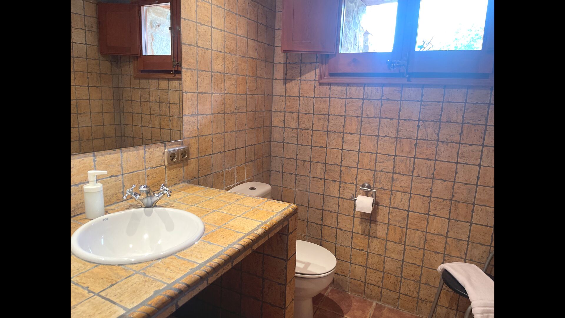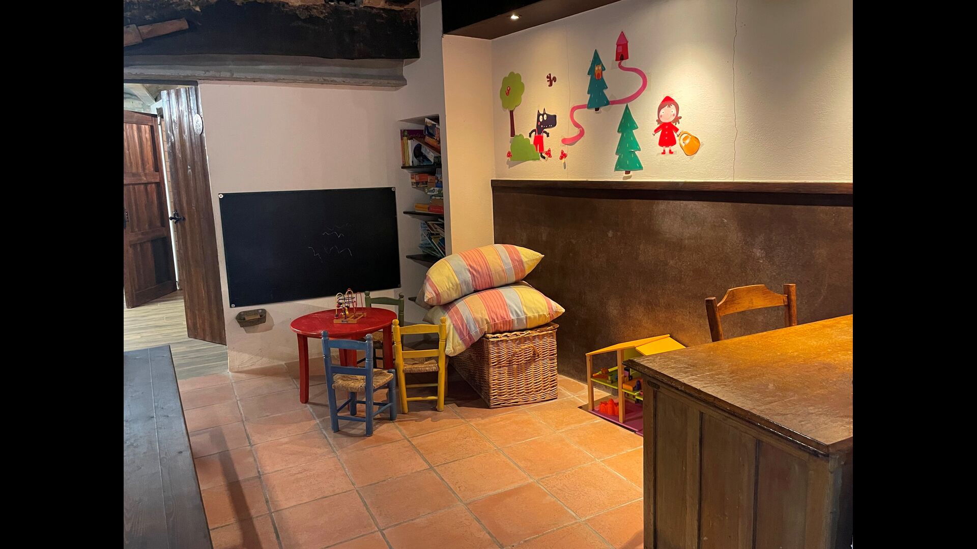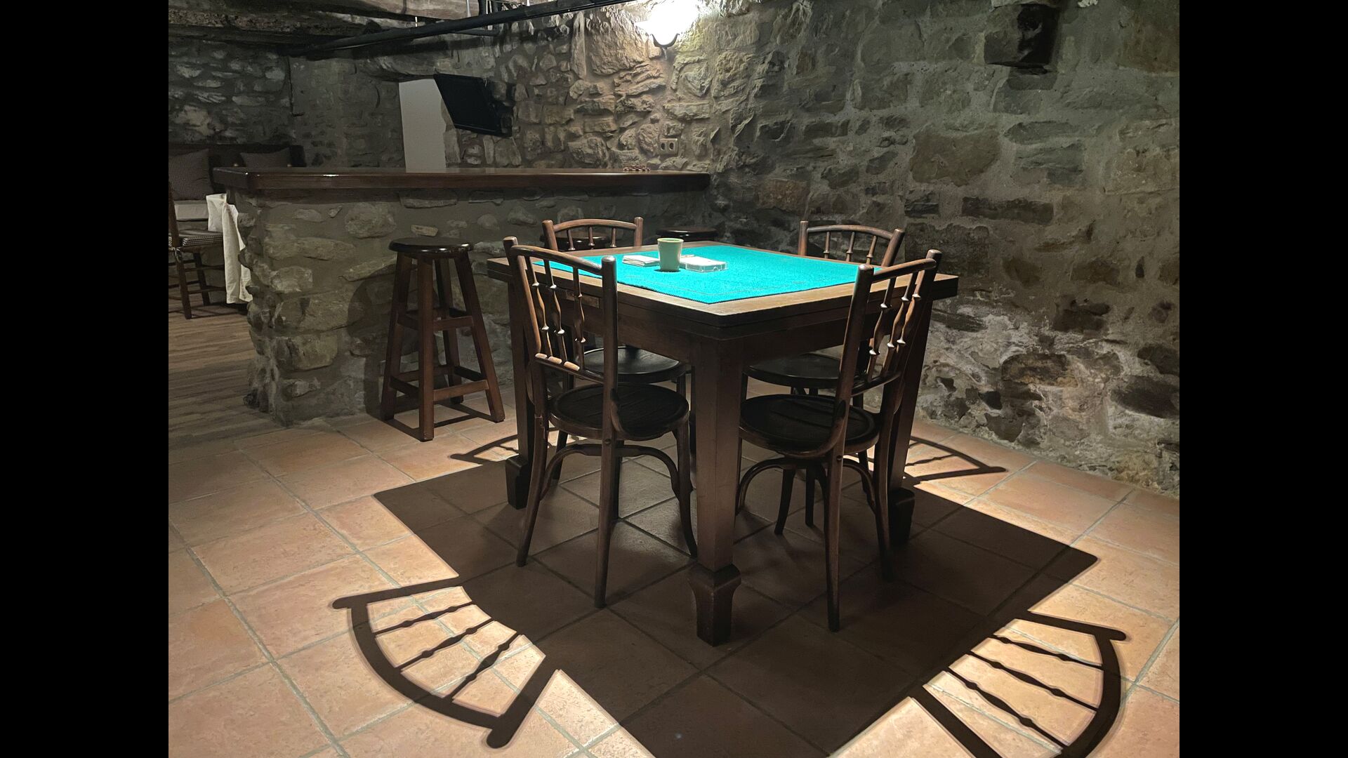 Le bâtiment à côté de la piscine se compose des deux appartements Soler I et Soler II, qui sont également reliés par l'intérieur. Au rez-de-chaussée, vous trouverez la grande zone d'activités, ce qui est super. Il y a un coin avec des jouets pour les plus petits, un billard, une table de ping-pong, un baby-foot et même une table de jeu de cartes originale tirée d'un film mafieux de New York. Ici, vous trouverez également deux toilettes supplémentaires.