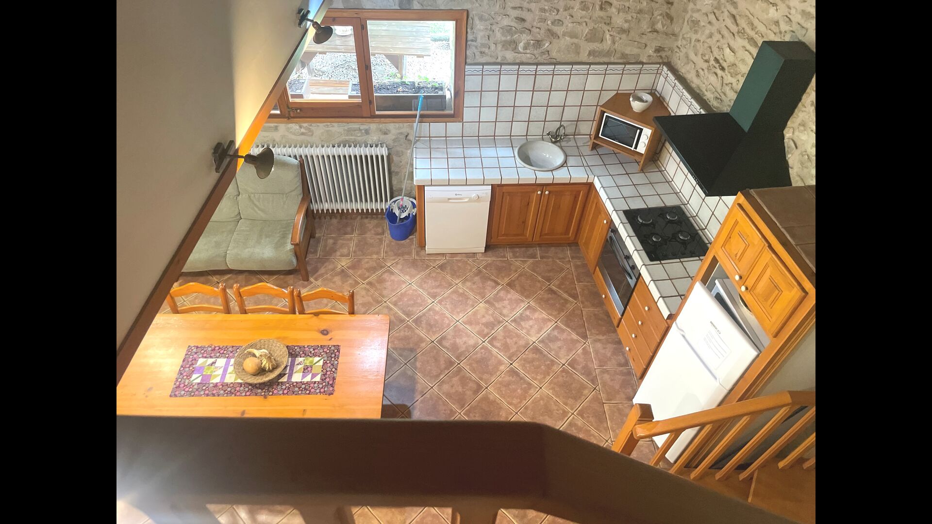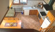 Depuis le rez-de-chaussée, vous entrez dans l'appartement Paller I, qui dispose d'une grande salle commune avec un plafond très haut. Ici, il y a un coin canapé avec TV, une cuisine ouverte et un coin repas avec table à manger. À l'étage supérieur, vous trouverez 3 chambres doubles partageant 1 salle de bain.