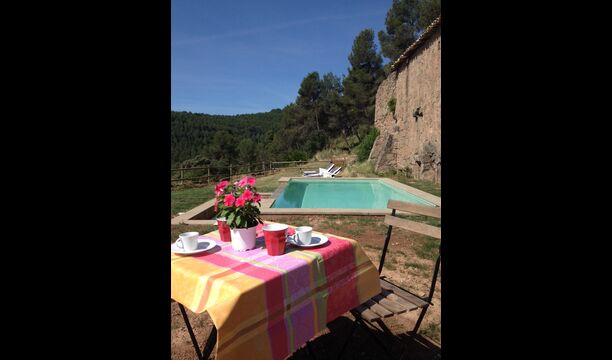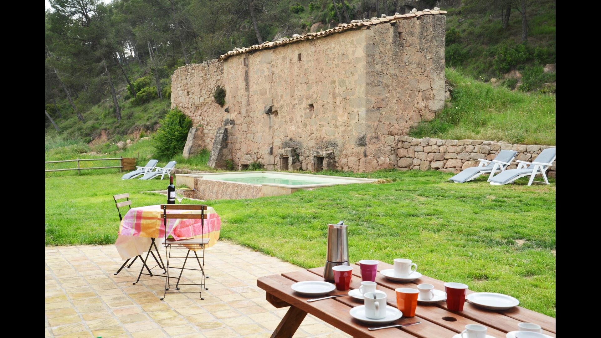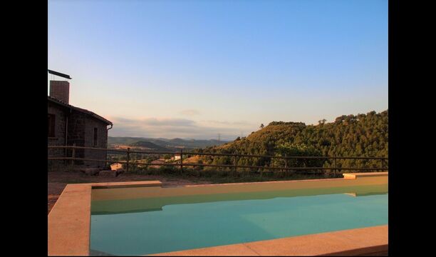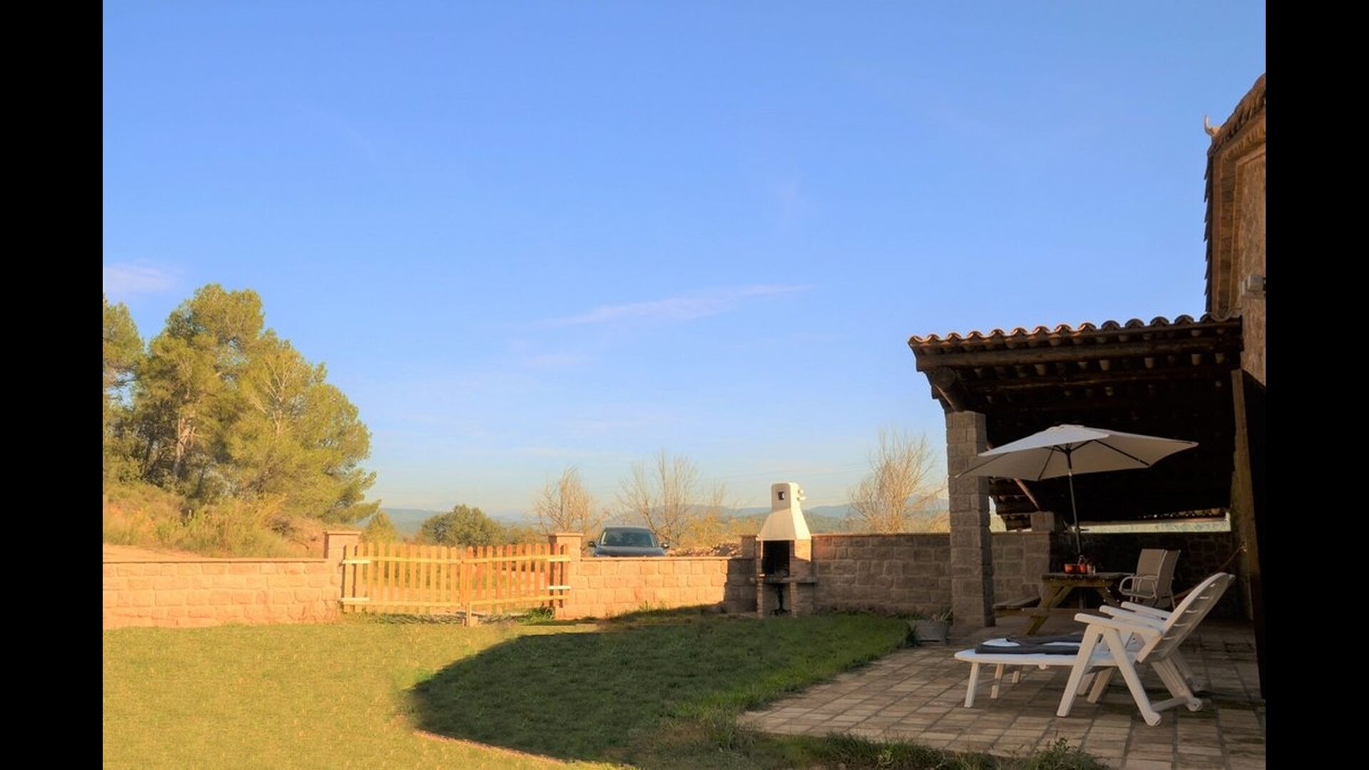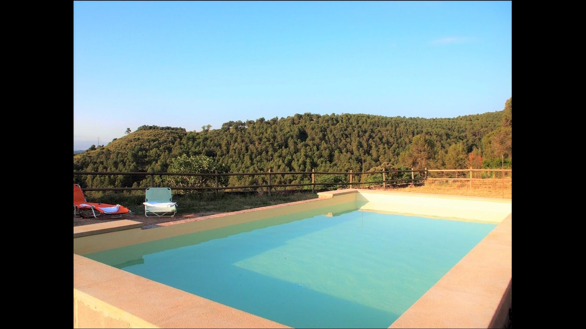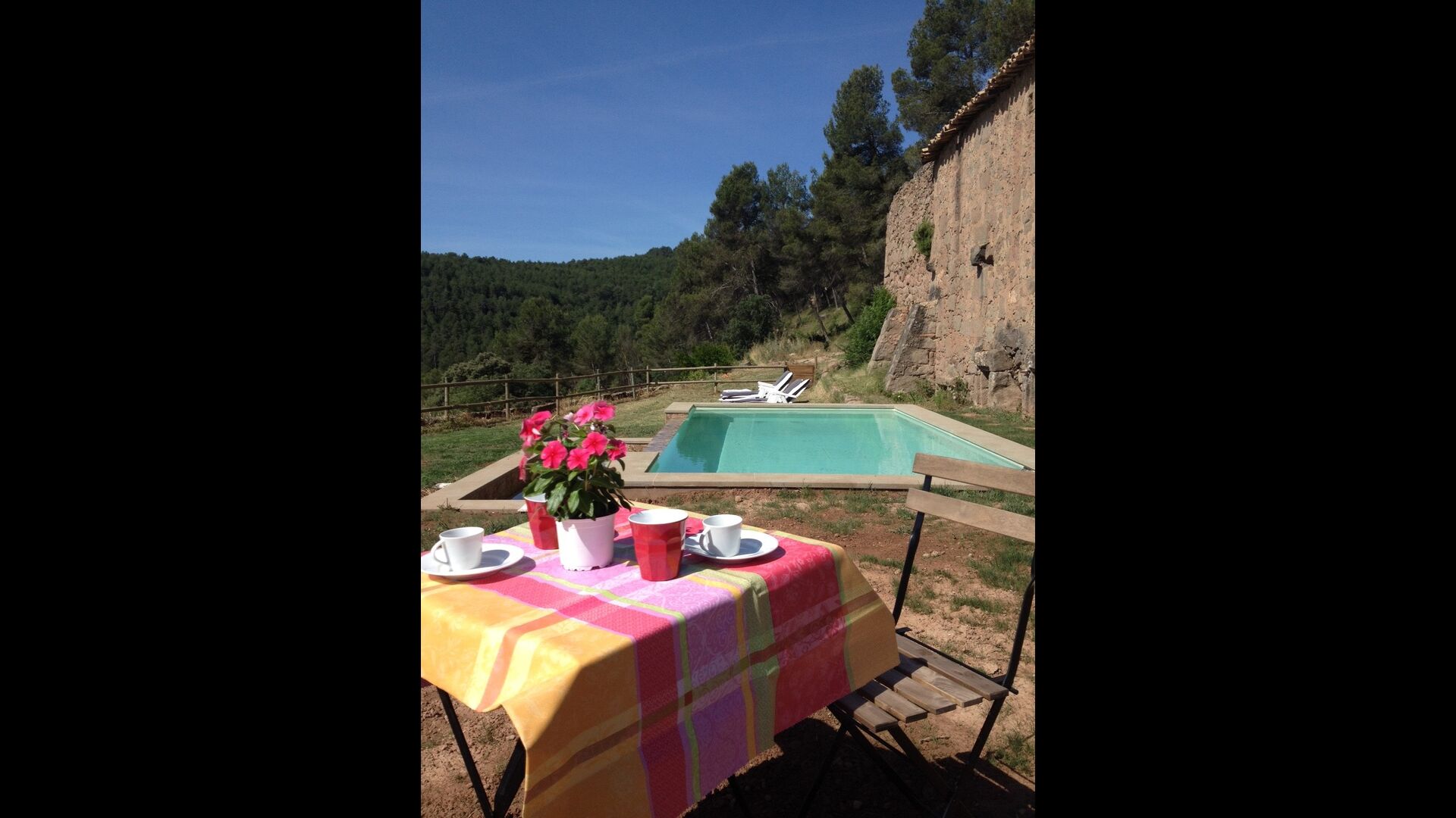 Il y a une grande terrasse couverte sur le côté droit de la maison, juste à côté de la piscine. Ici vous trouverez les incontournables lors de vos voyages en Catalogne: ombre, barbecue, grande table extérieure, hamac et chaises longues. Juste à côté de la terrasse se trouve la piscine qui a une belle vue sur la vallée. Il y a aussi des chaises longues alignées sur le côté de la piscine, où les parents pourront lire et profiter du soleil, tout en surveillant les enfants qui jouent dans la piscine.