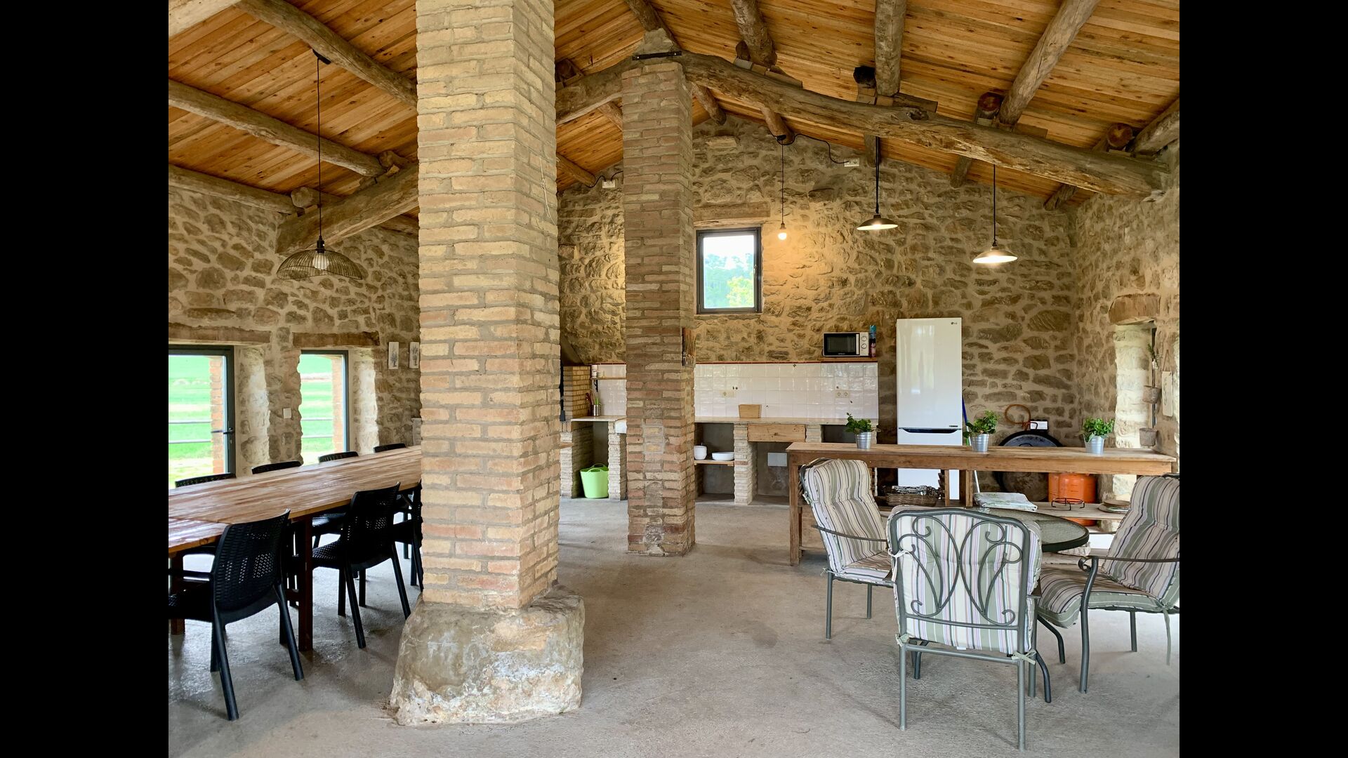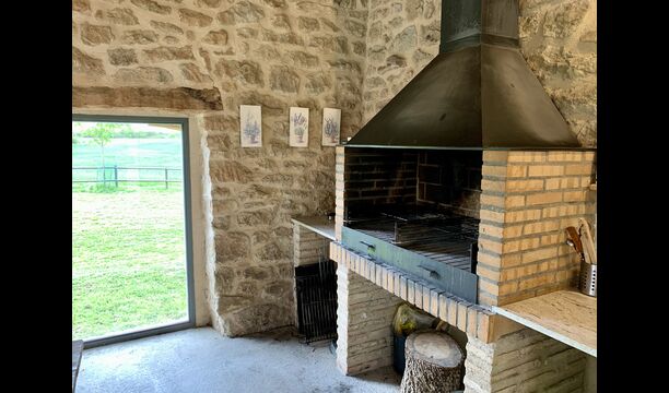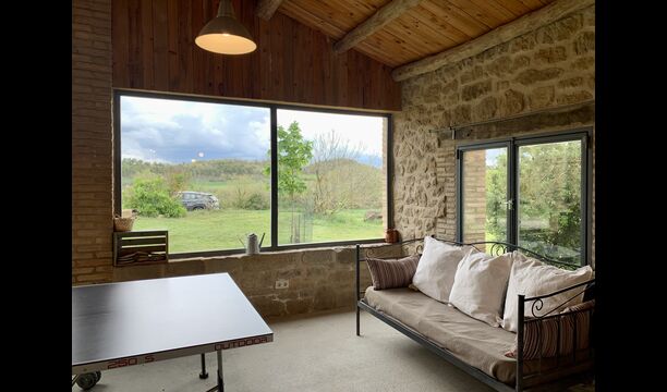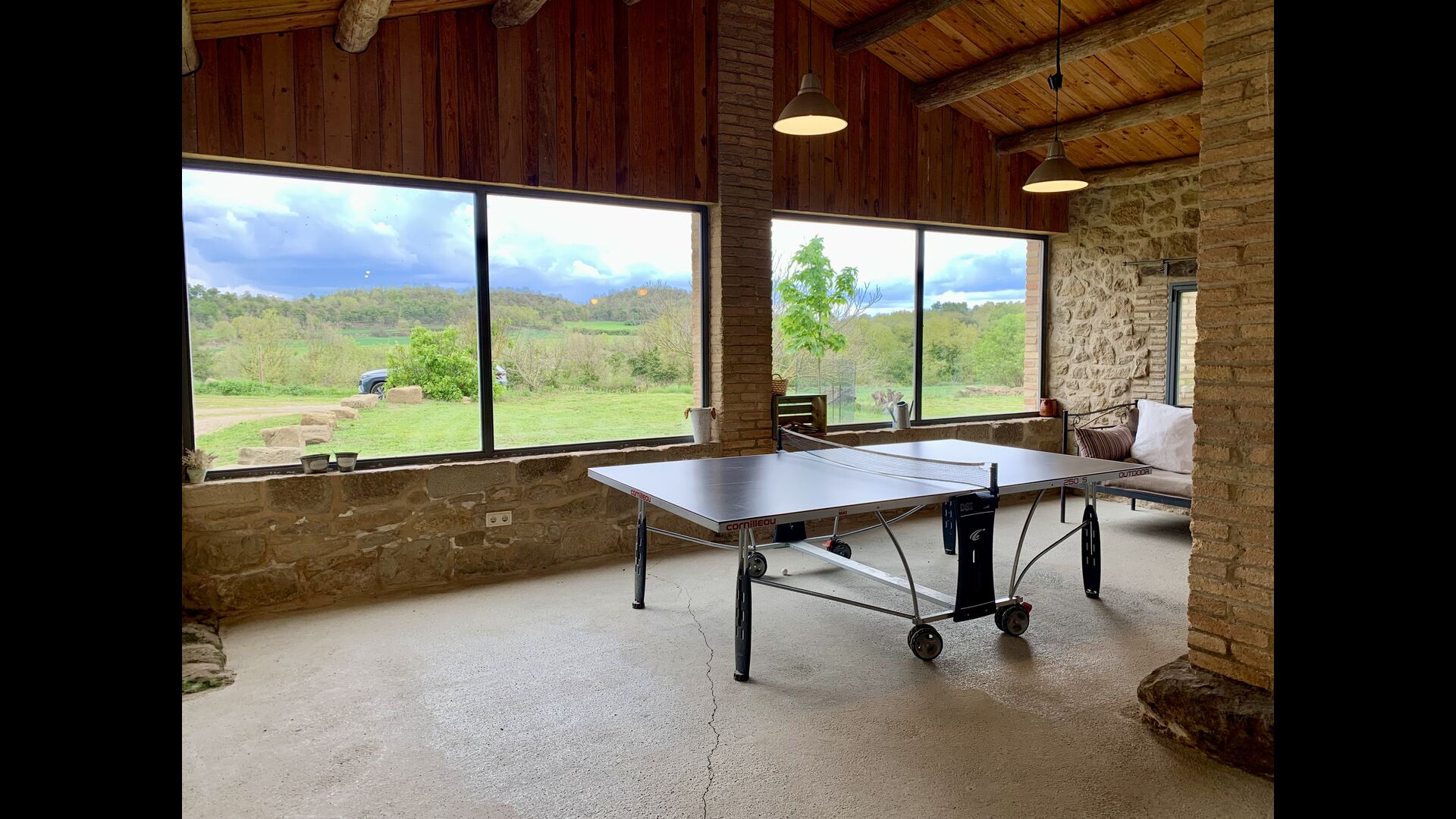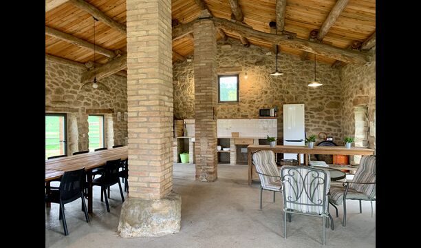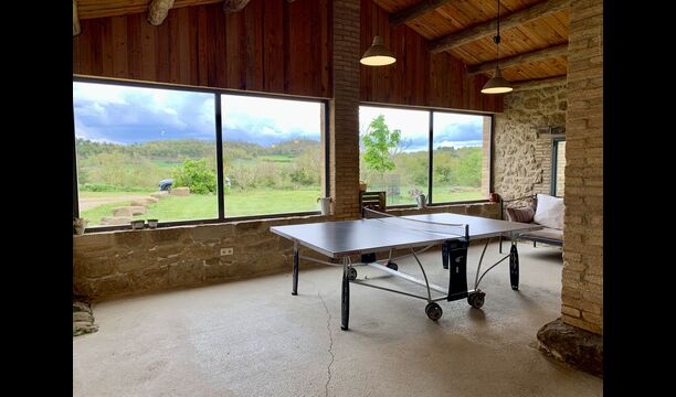 Le plus petit bâtiment séparé en calcaire est situé à côté de la piscine. À l'intérieur, vous trouverez une grande table de ping-pong, une longue table à manger en bois et un espace barbecue avec des équipements de cuisine simples. L'emplacement est superbe, car il est facile de s'y rendre depuis la piscine. Nous imaginons que les enfants du groupe s'amuseront à courir entre la salle de jeux et la piscine.
