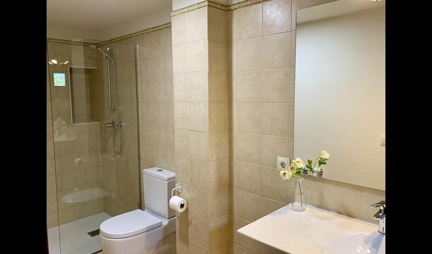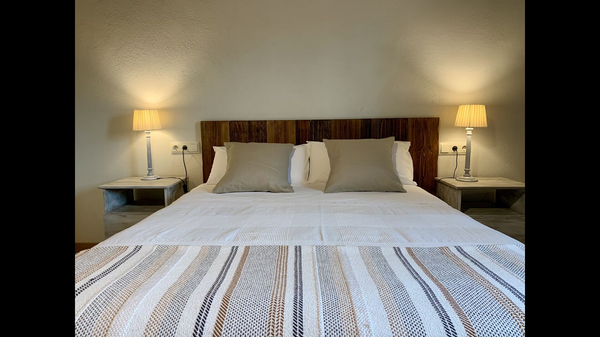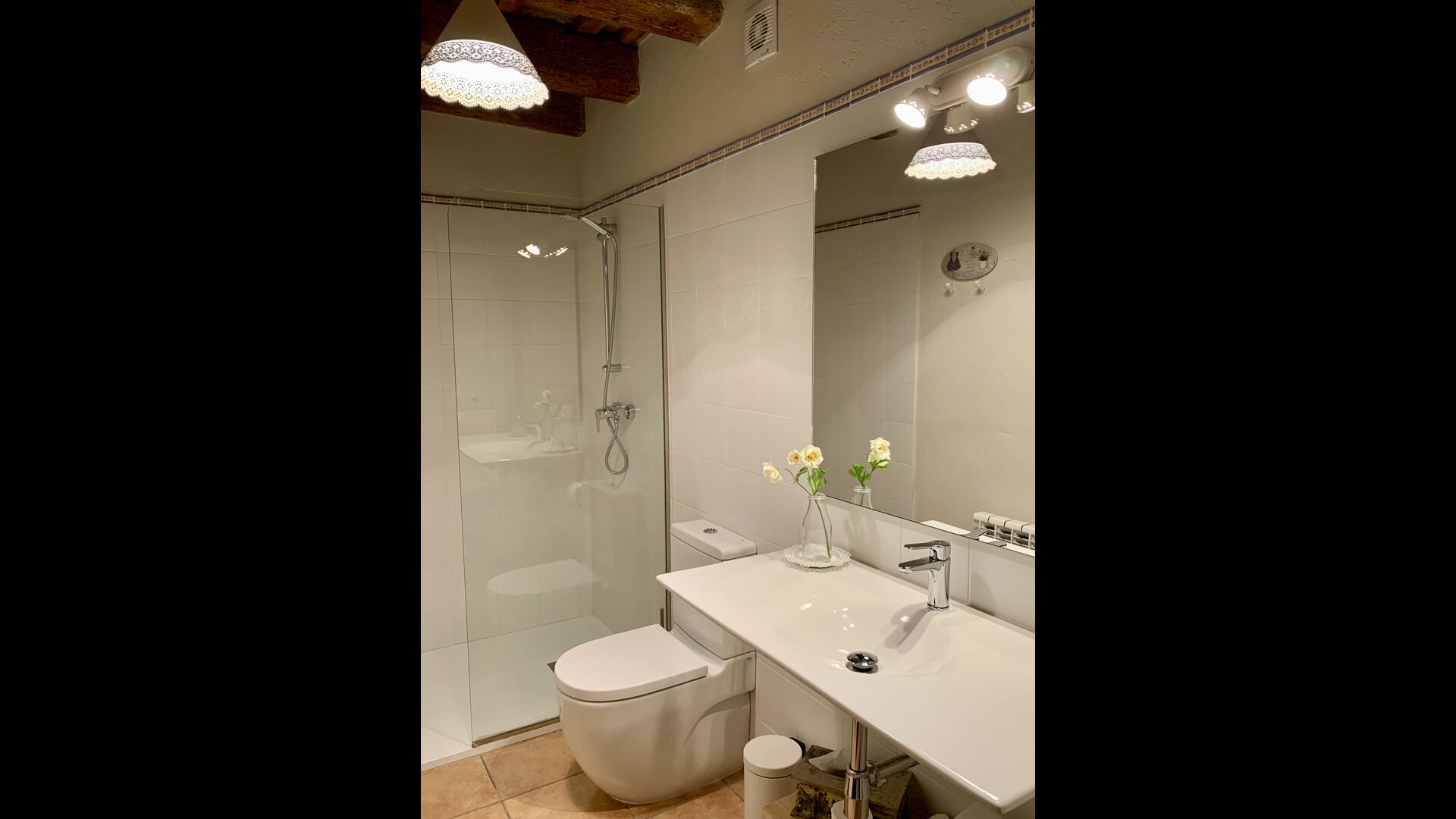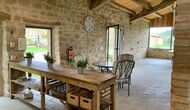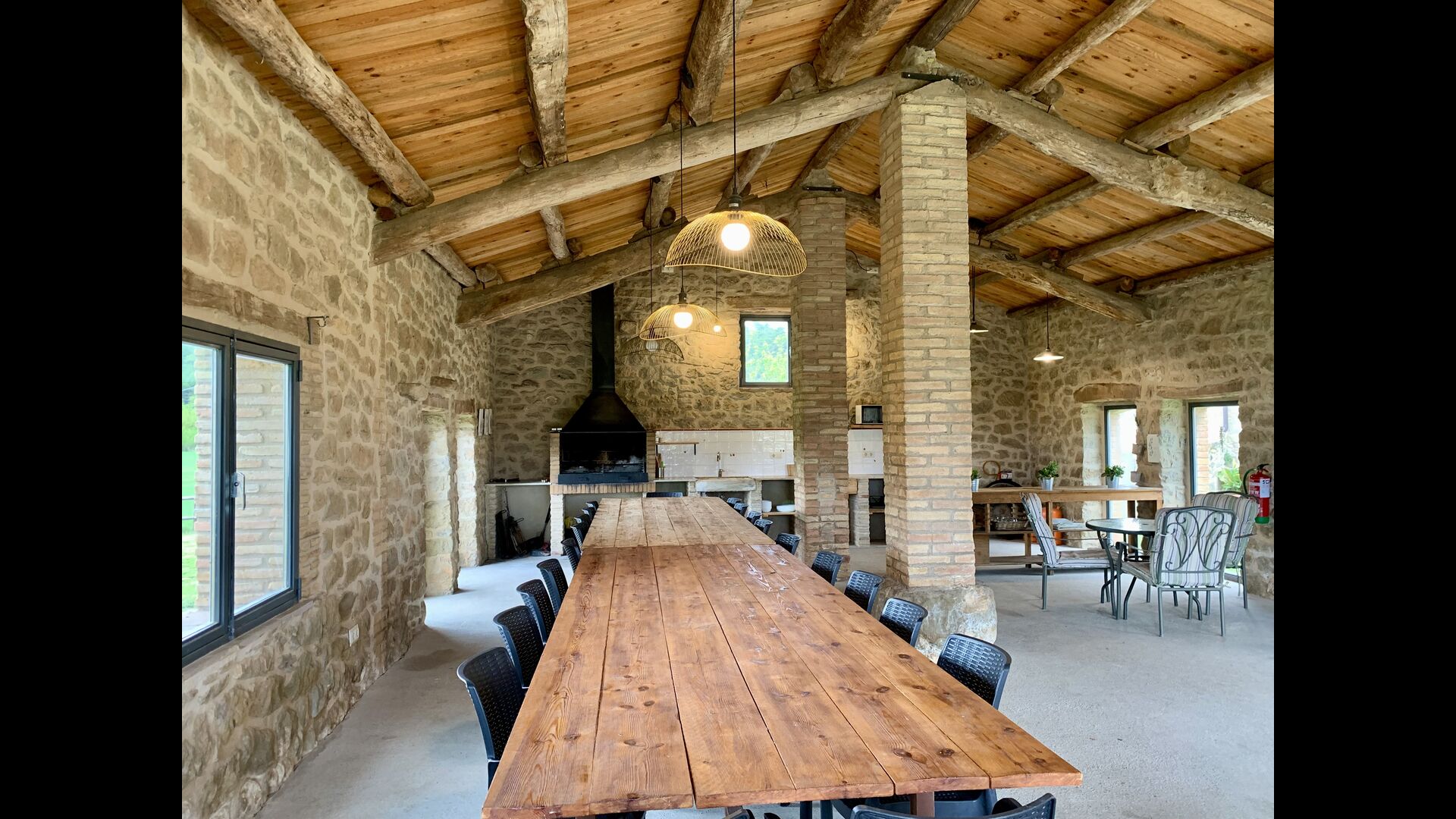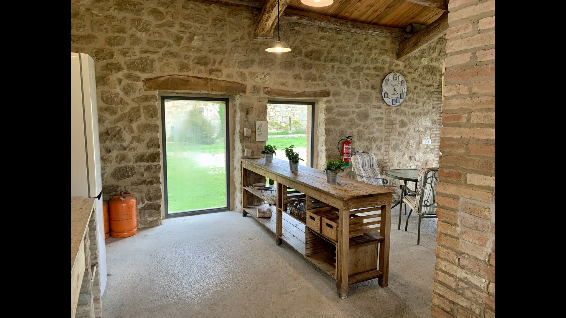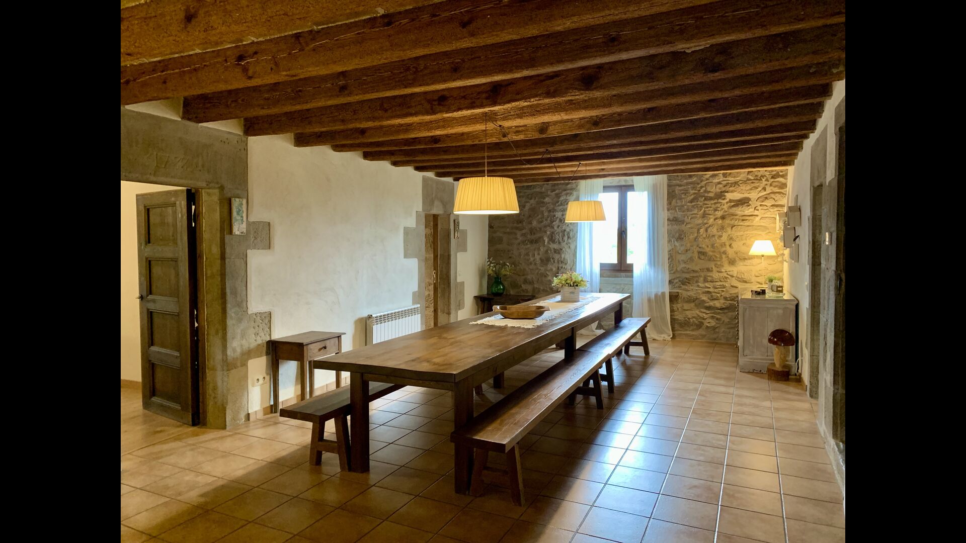 En entrant dans le bâtiment principal, vous pénétrez dans un grand hall d'accueil, caractérisé par l'architecture et le design catalans classiques, tels que les grandes portes doubles en bois et les murs et sols en calcaire. L'escalier vous emmène au premier étage de la maison, où vous entrerez dans le grand salon et salle à manger, qui est relié. La salle à manger a une longue table en bois avec de la place pour tout le groupe et est reliée à la cuisine entièrement équipée, et le salon a des salons confortables et une télévision.