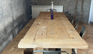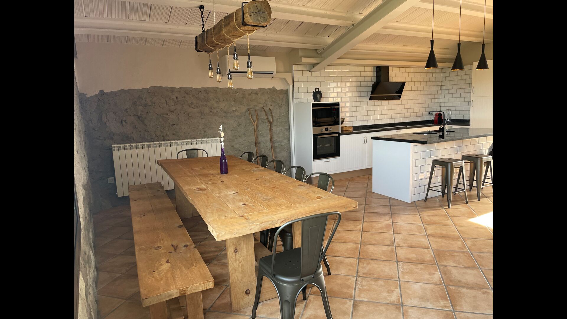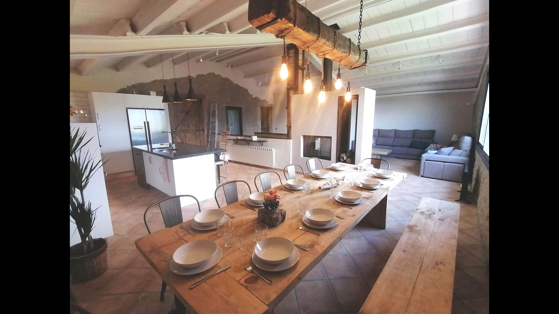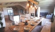 • Grand salon avec coin canapé, table à manger rustique et cuisine