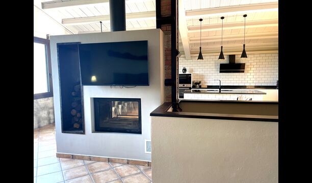 De là, il y a un accès direct au jardin et à une terrasse & un anneau; ceux avec une grande table pour l'extérieur  salle à manger . À gauche sont également disposés un espace barbecue & un anneau; de , s & amp; un anneau; Vous pouvez faire des grillades tout en profitant de la vue sur la vallée, et m& un anneau; un verre de vin local.