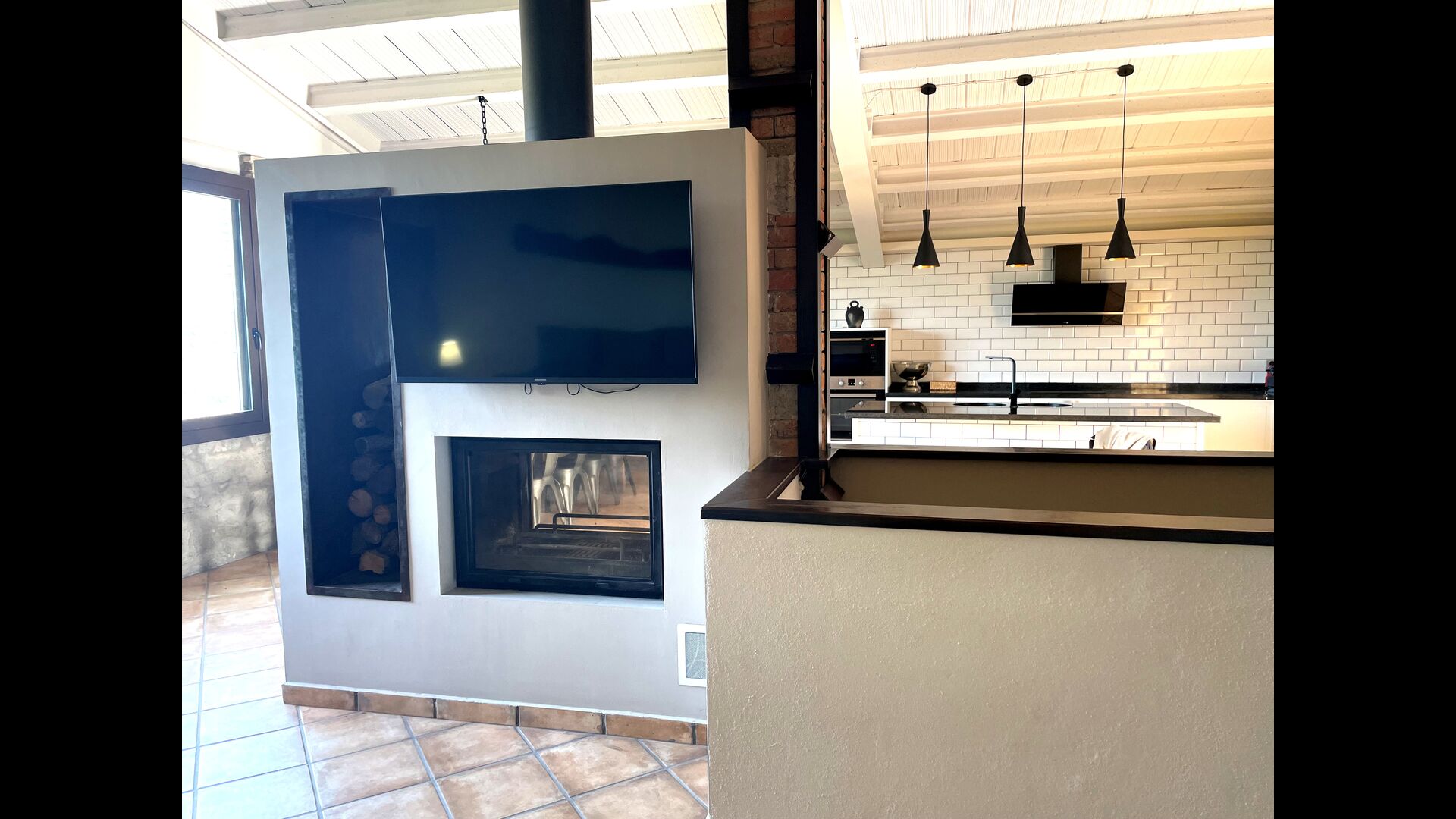 Comme la maison est située sur une pente, le premier étage a un accès presque direct depuis le parking, où via une grande terrasse vous entrez dans le grand salon avec la cuisine moderne et très bien équipée, coin repas avec une belle longue table en bois; et coin canapé avec canapés, TV et cheminée. De plus, il y a une grande chambre double avec accès direct à la terrasse et une salle de bain entièrement équipée avec douche.