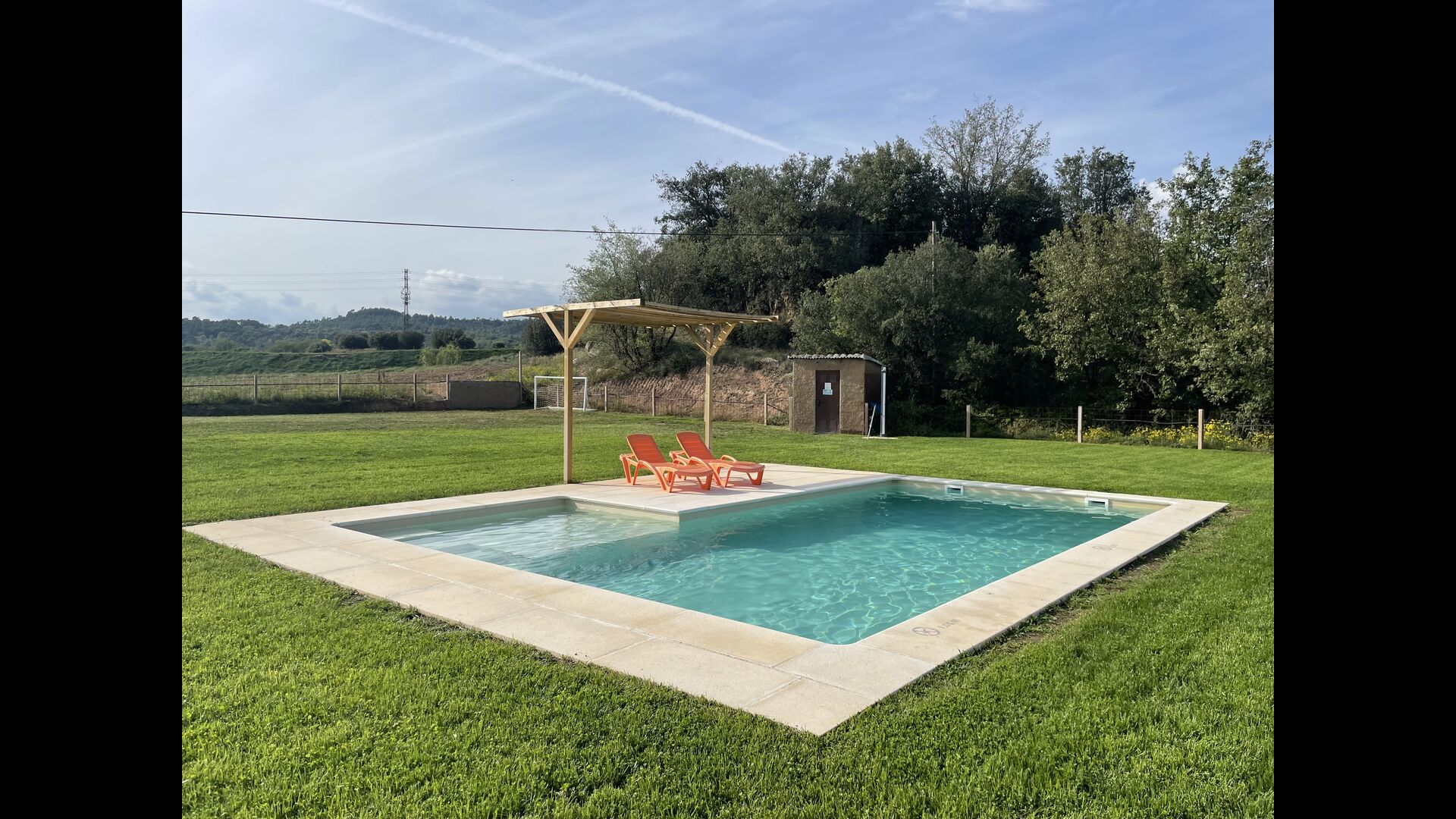 La piscine mesure 8 x 4 mètres et donne également sur la campagne. Et pour les chaudes journées d'été, Xavi et Mabel ont fait une couverture permanente, donc ceux d'entre vous qui voudraient un peu d'ombre ont la possibilité de cela. Il y a aussi un escalier d'un côté avec une zone à faible eau, idéale pour les petits enfants.