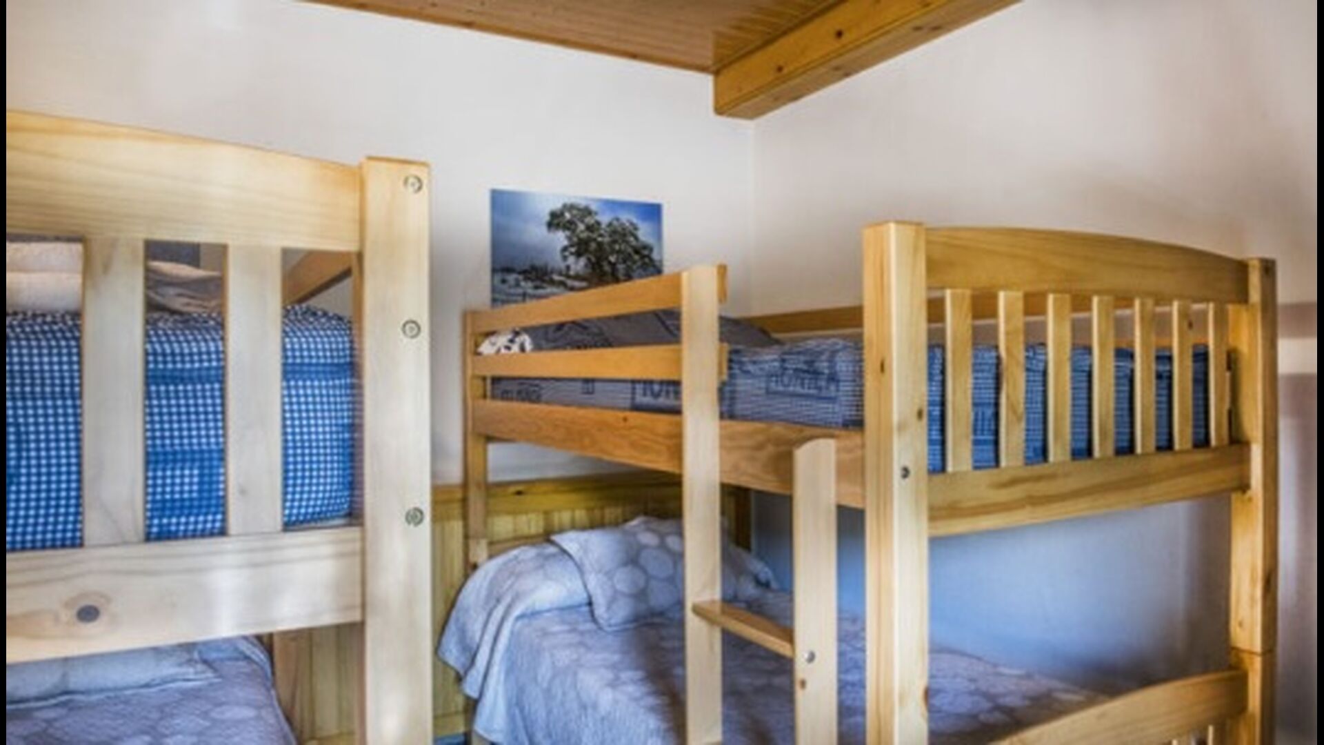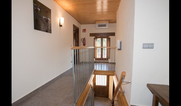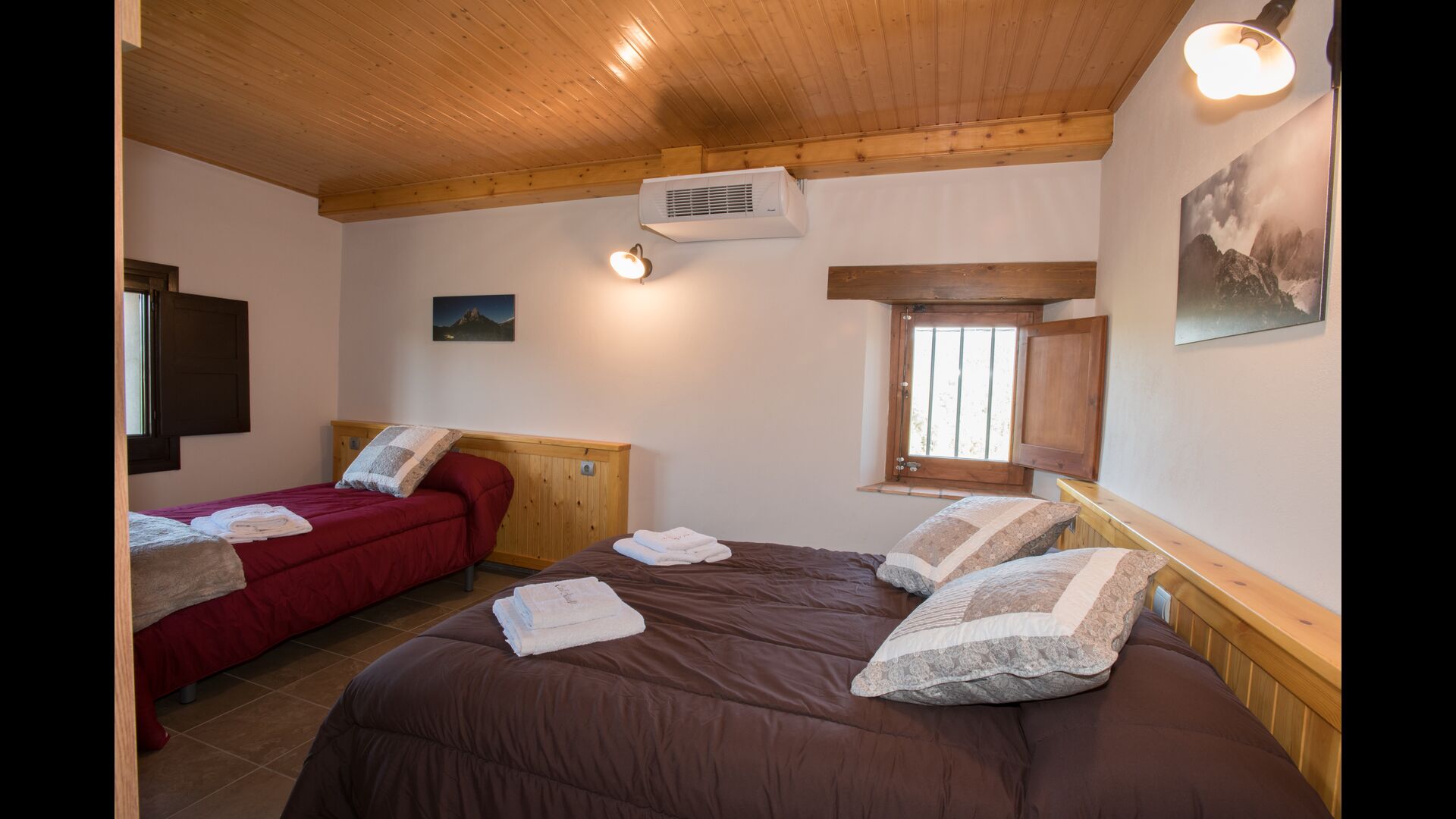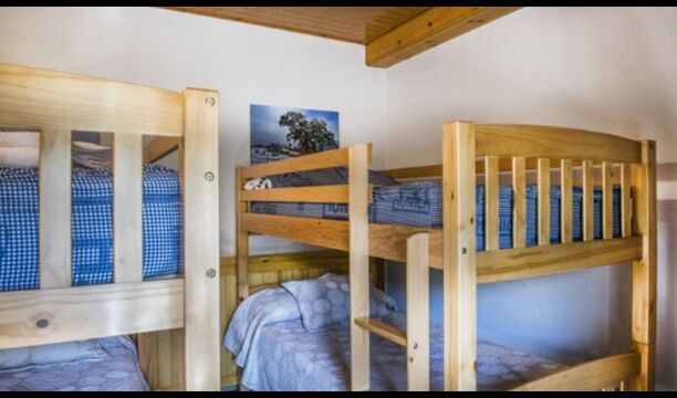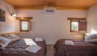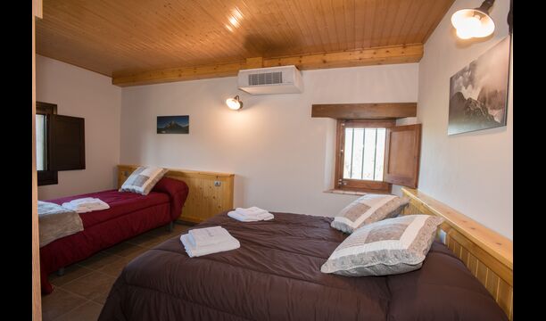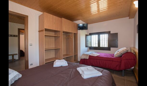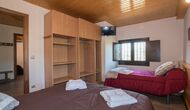 A l'étage, vous trouvez les 4 chambres supplémentaires, qui sont équipées pour pouvoir accueillir 3 familles puisqu'il y a 2 chambres triples et 1 chambre double et enfin, la quatrième chambre a été aménagée en chambre d'enfants avec deux lits superposés. Il y a également deux salles de bains à cet étage, ce qui en fait trois au total. Comme on a tendance à avoir un peu chaud, il y a la climatisation dans cette pièce.