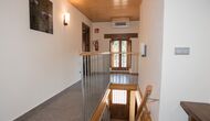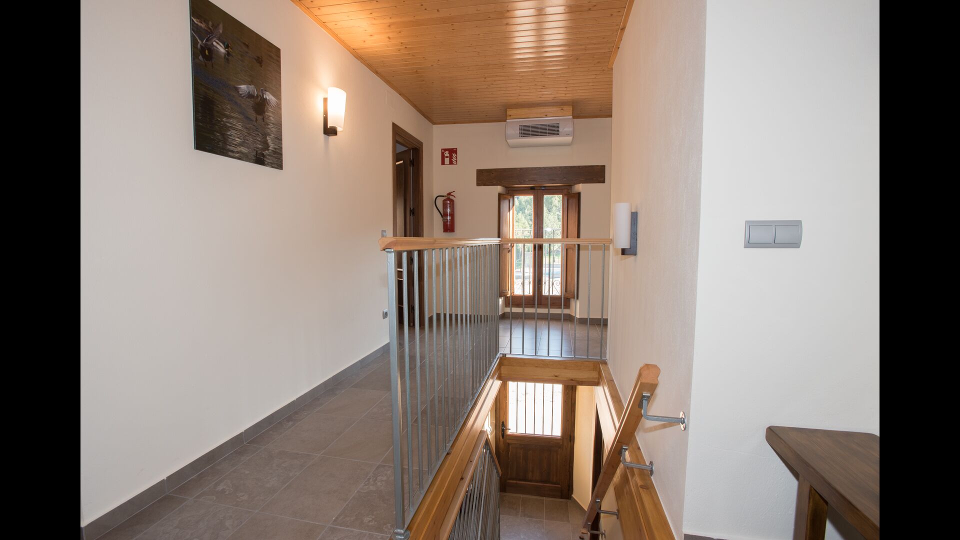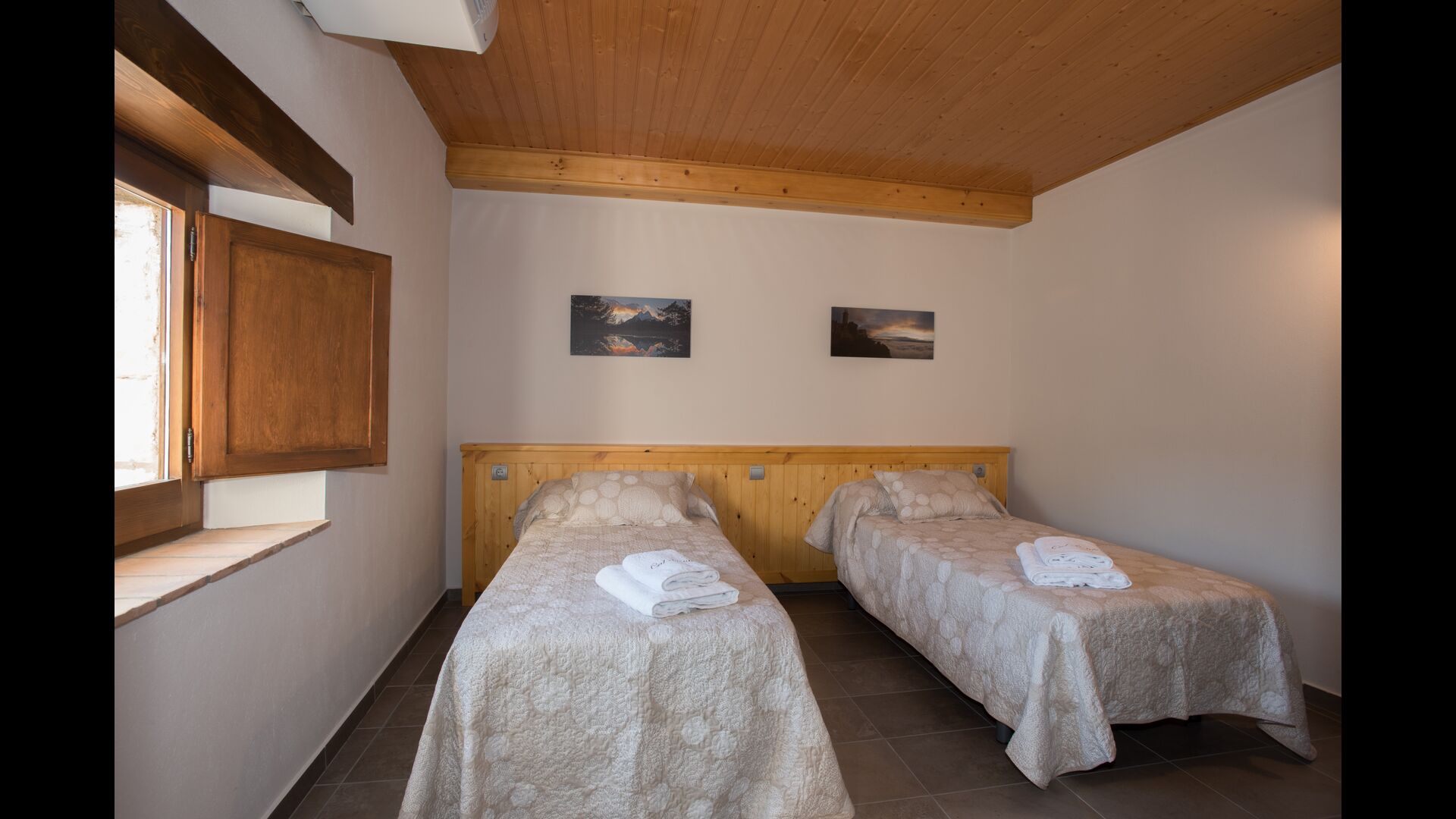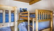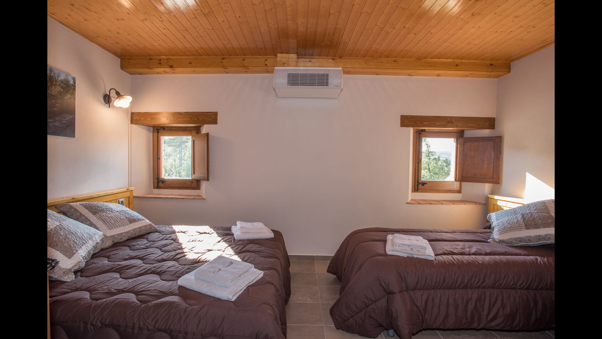 A l'étage, vous trouvez les 4 chambres supplémentaires, qui sont équipées pour pouvoir accueillir 3 familles puisqu'il y a 2 chambres triples et 1 chambre double et enfin, la quatrième chambre a été aménagée en chambre d'enfants avec deux lits superposés. Il y a également deux salles de bains à cet étage, ce qui en fait trois au total. Comme on a tendance à avoir un peu chaud, il y a la climatisation dans cette pièce.