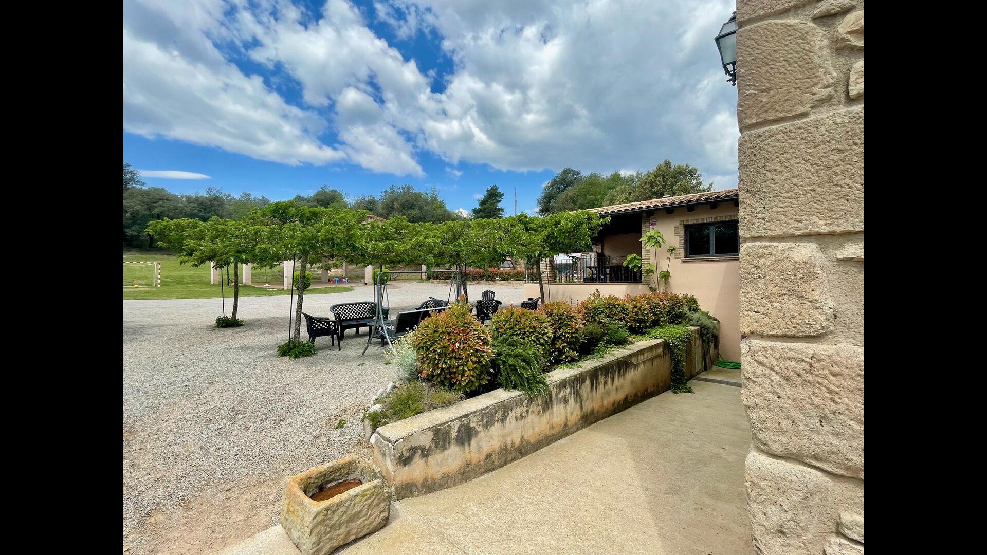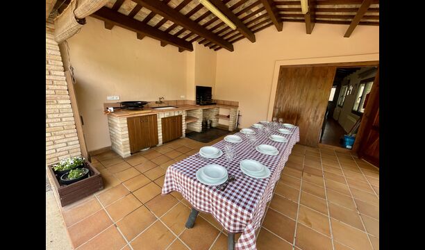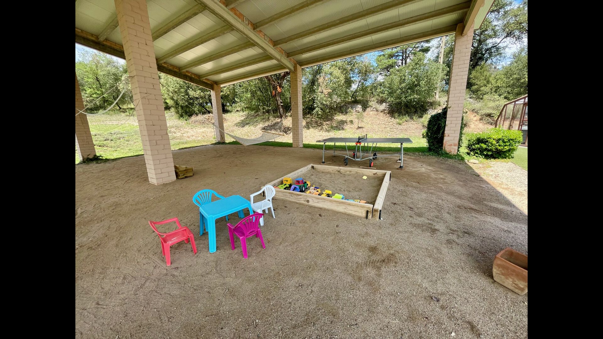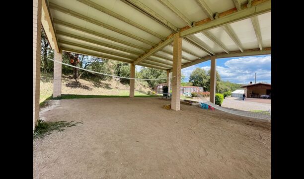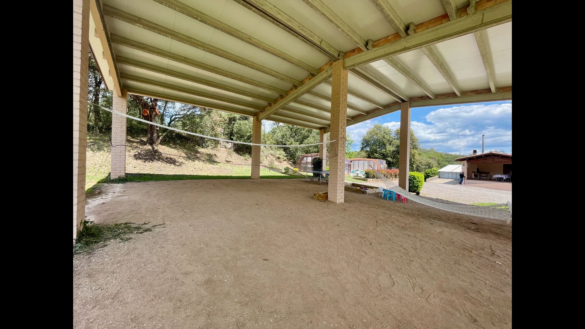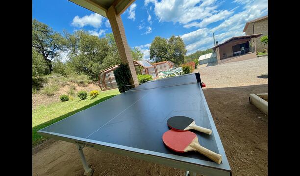 En plus de cette terrasse, il y a un autre patio et des hamacs à l'arrière de la maison où vous pouvez vraiment profiter de la vue. Le jardin a également un terrain de basket couvert. Le pool house est un véritable espace de détente où vous pourrez vous détendre dans le jacuzzi et les enfants adoreront la grande fontaine dans la piscine, qui crée une petite "cascade" dans la piscine. Pour votre confort, il y a maintenant des douches et des toilettes à côté de la piscine.