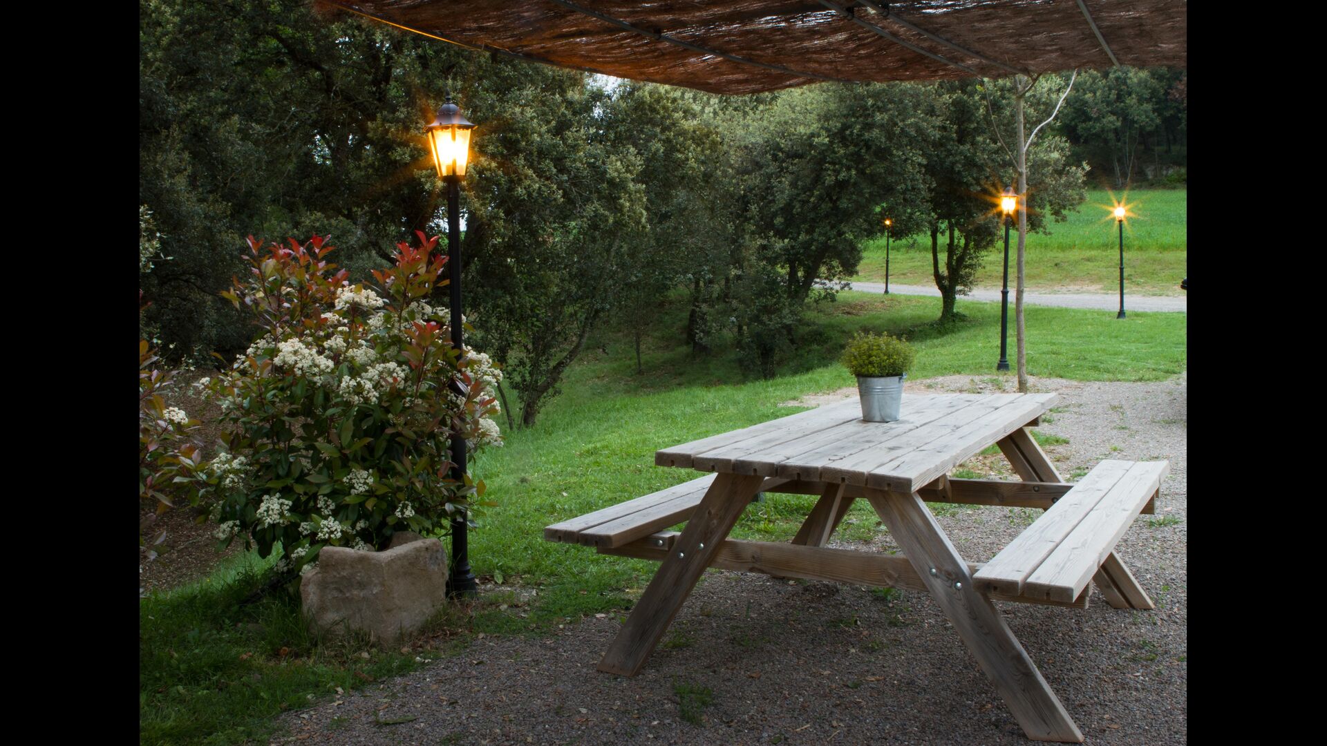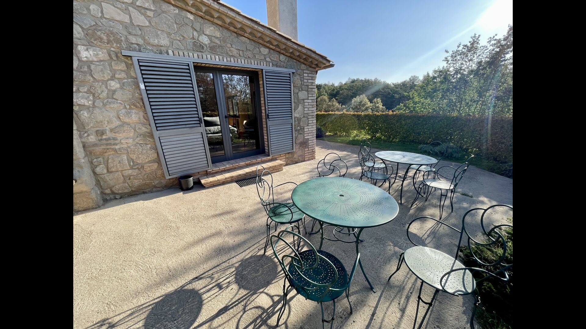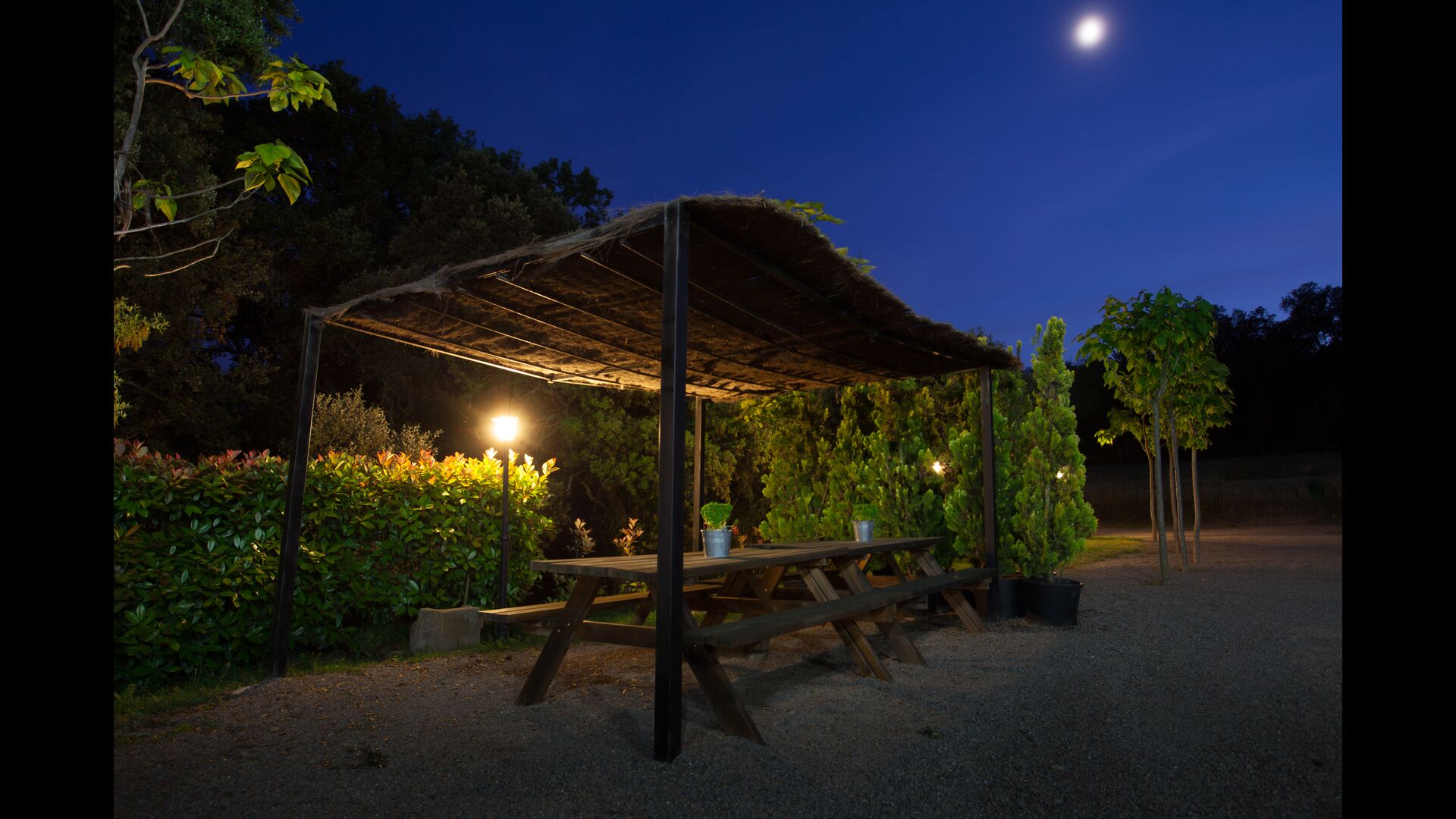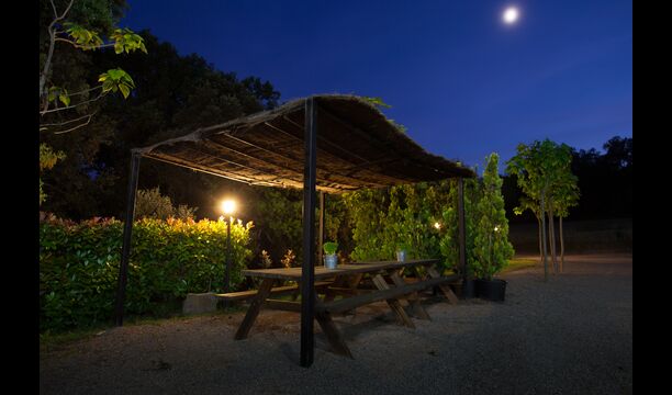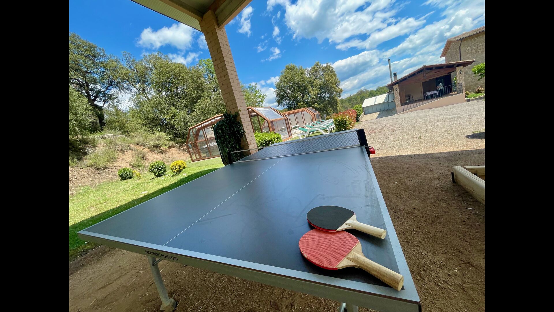 L'espace extérieur est vaste et, dans le prolongement de la terrasse couverte avec barbecue, se trouve une petite cuisine extérieure avec une longue salle à manger, un billard, un baby-foot et une grande télévision à écran plat.