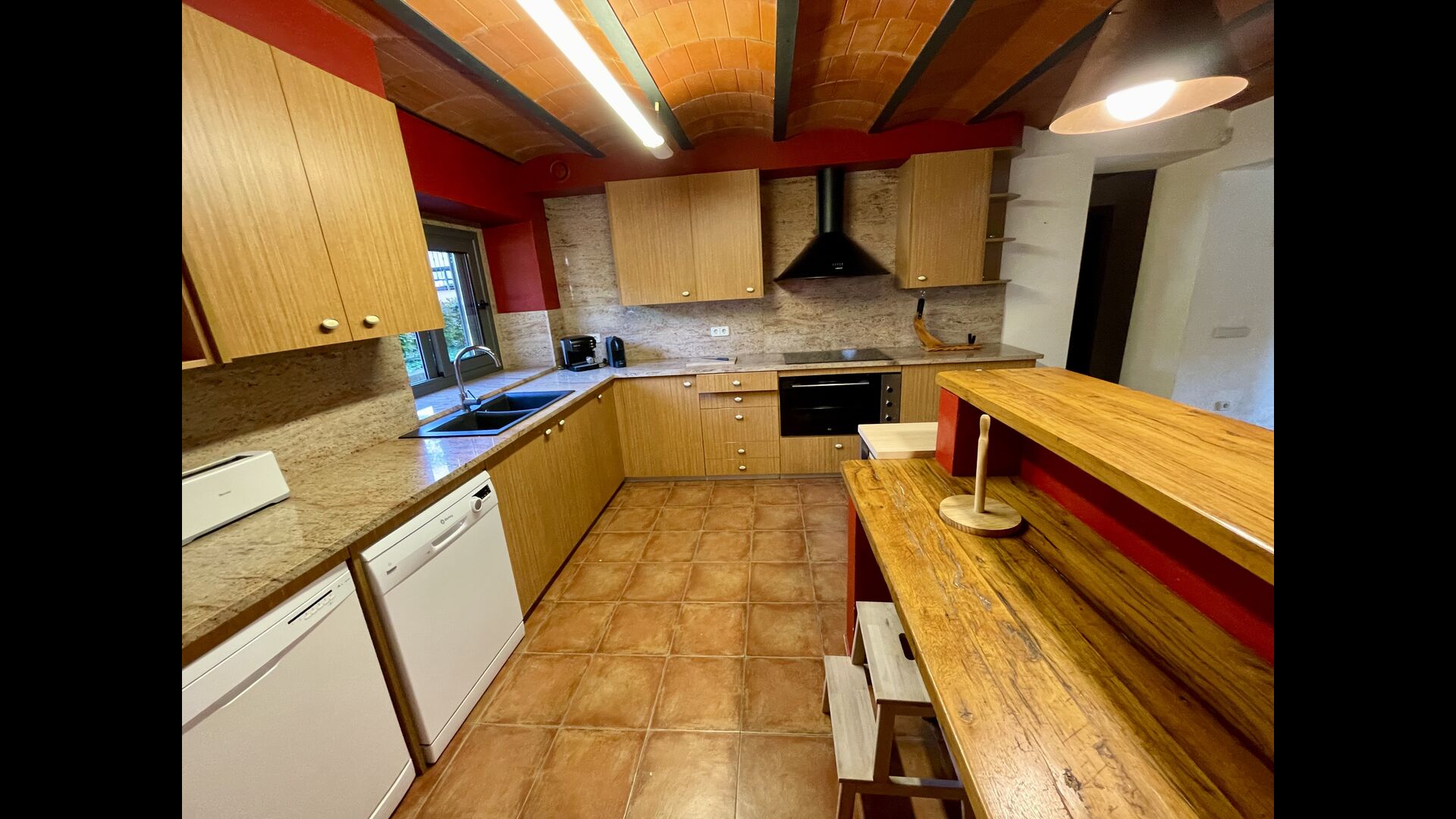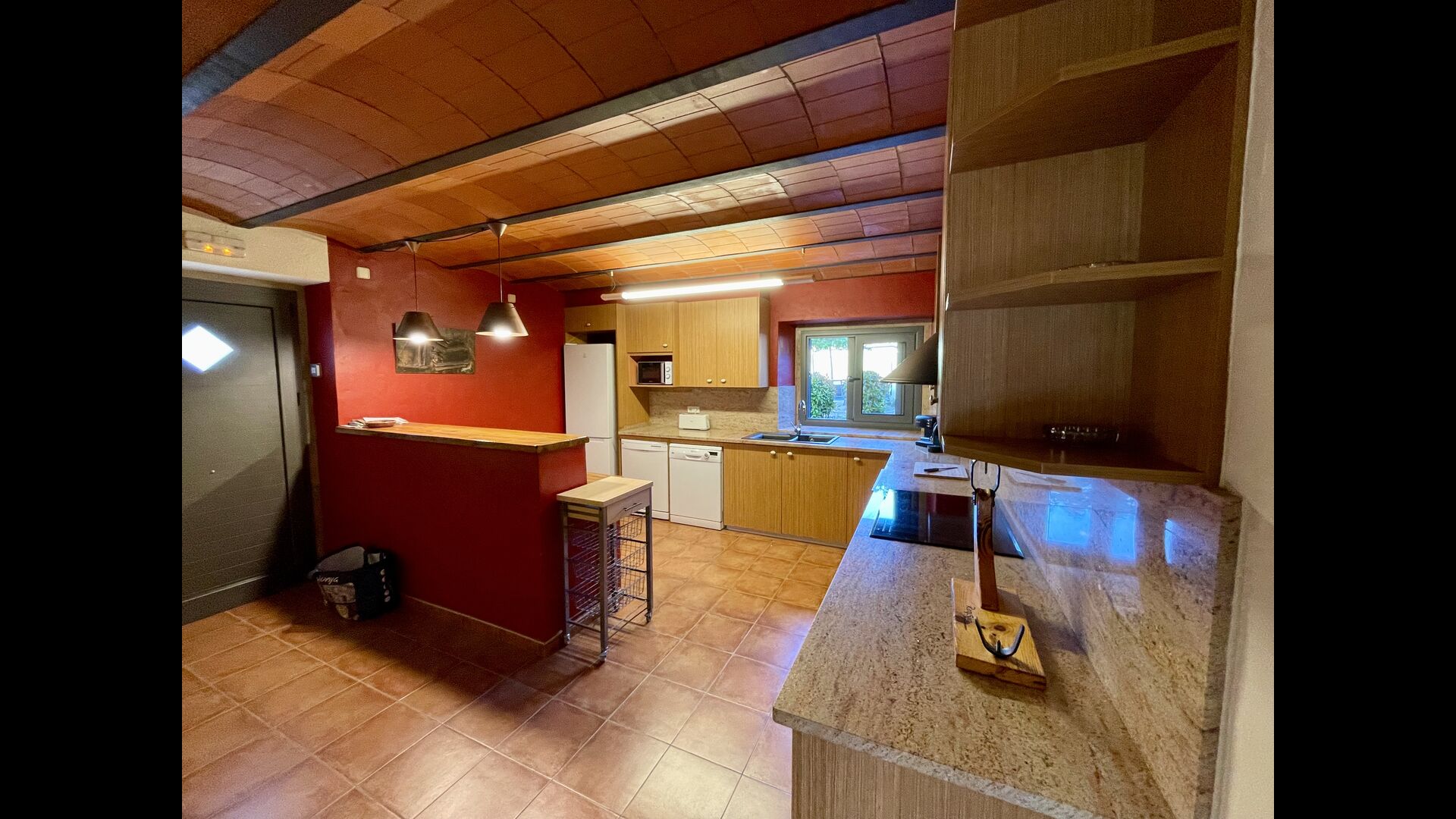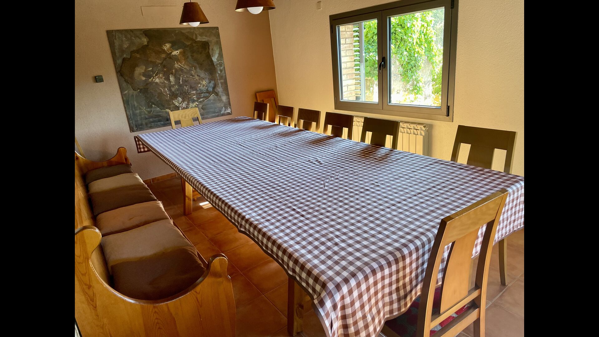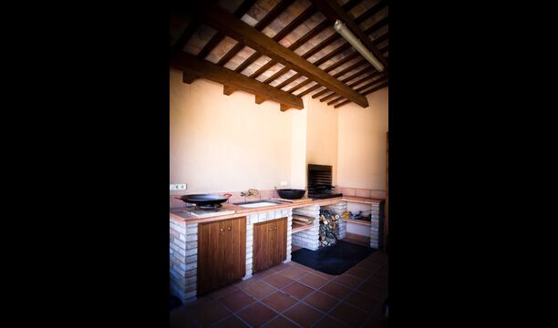 Il y a 3 étages dans la Casa Cugulado. L'étage inférieur a une grande cuisine équipée et aménagée pour la grande famille. Il dispose par exemple de deux lave-vaisselle, d'un très grand four et de deux réfrigérateurs, et d'un autre sur la terrasse où vous pouvez choisir de stocker des boissons ou de la viande à griller. Au rez-de-chaussée se trouve également une salle commune ouverte avec salon et salle à manger. Il y a aussi des toilettes pour que vous n'ayez pas à monter dans les chambres. Le salon a également une porte patio à l'arrière de la maison où il y a une vue fabuleuse sur le magnifique paysage.
