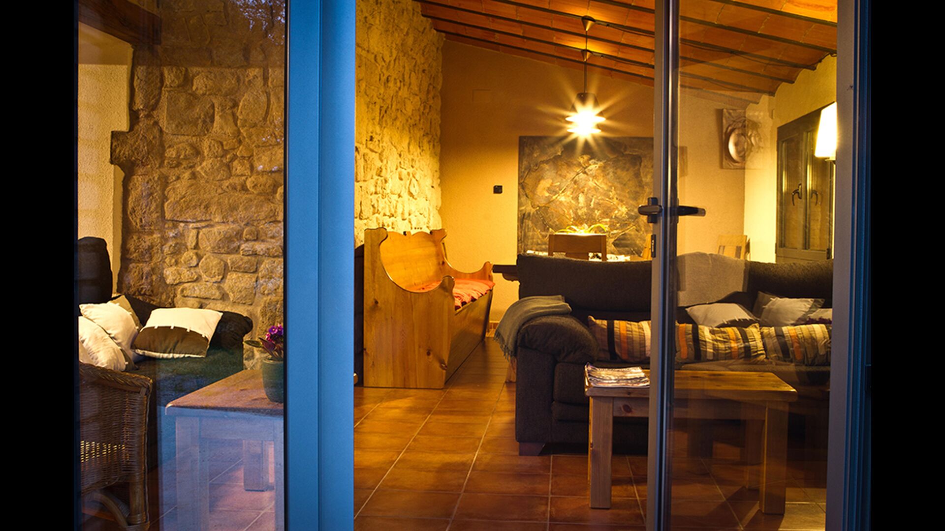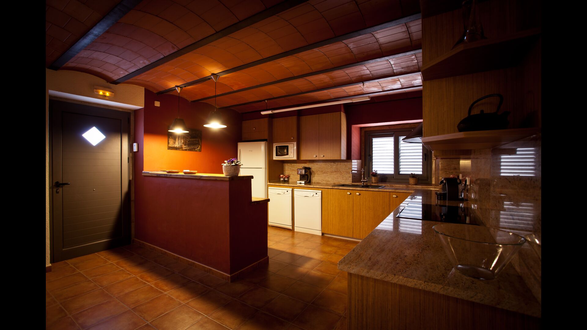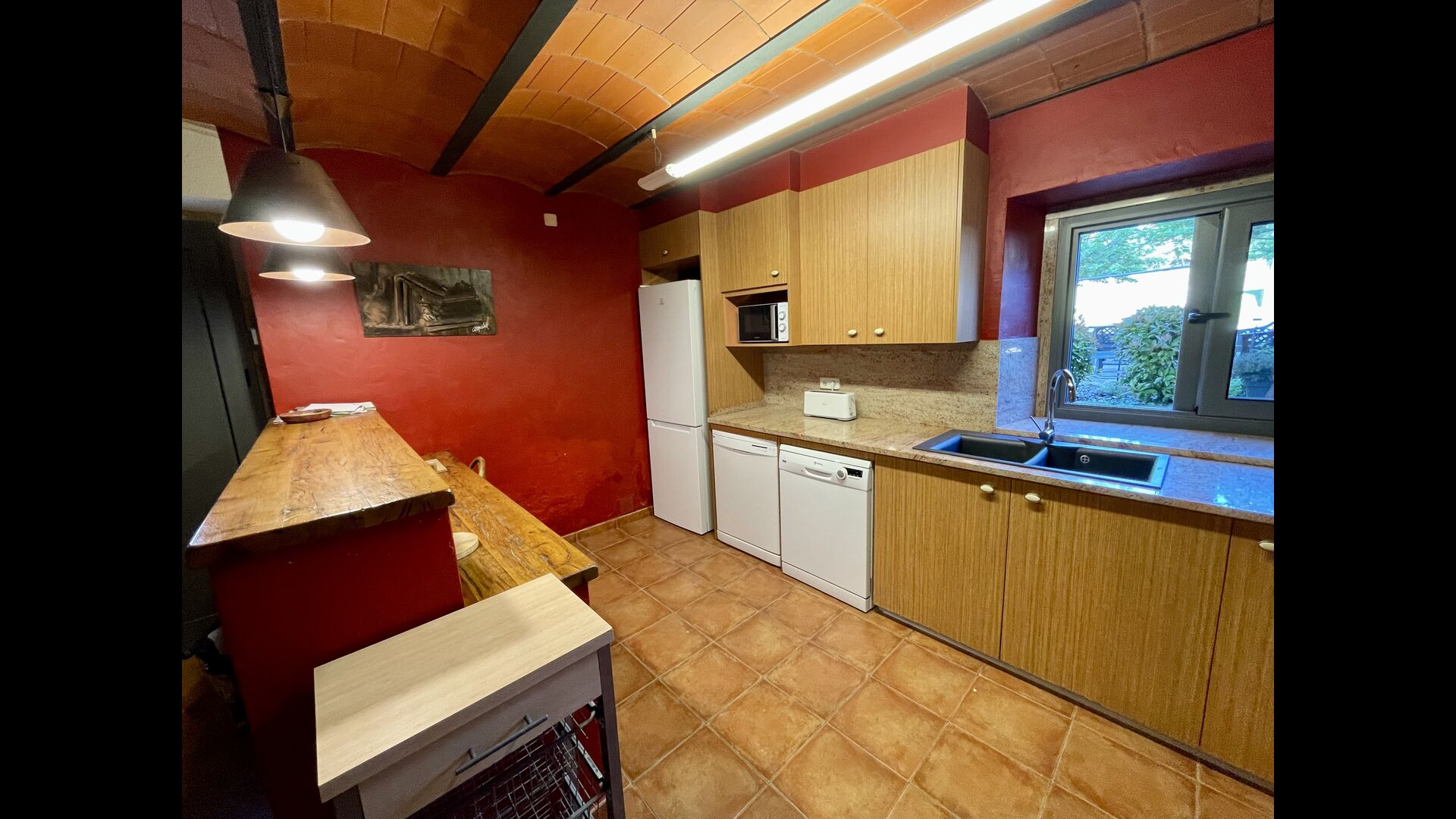 Il y a 3 étages dans la Casa Cugulado. L'étage inférieur a une grande cuisine équipée et aménagée pour la grande famille. Il dispose par exemple de deux lave-vaisselle, d'un très grand four et de deux réfrigérateurs, et d'un autre sur la terrasse où vous pouvez choisir de stocker des boissons ou de la viande à griller. Au rez-de-chaussée se trouve également une salle commune ouverte avec salon et salle à manger. Il y a aussi des toilettes pour que vous n'ayez pas à monter dans les chambres. Le salon a également une porte patio à l'arrière de la maison où il y a une vue fabuleuse sur le magnifique paysage.