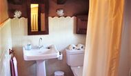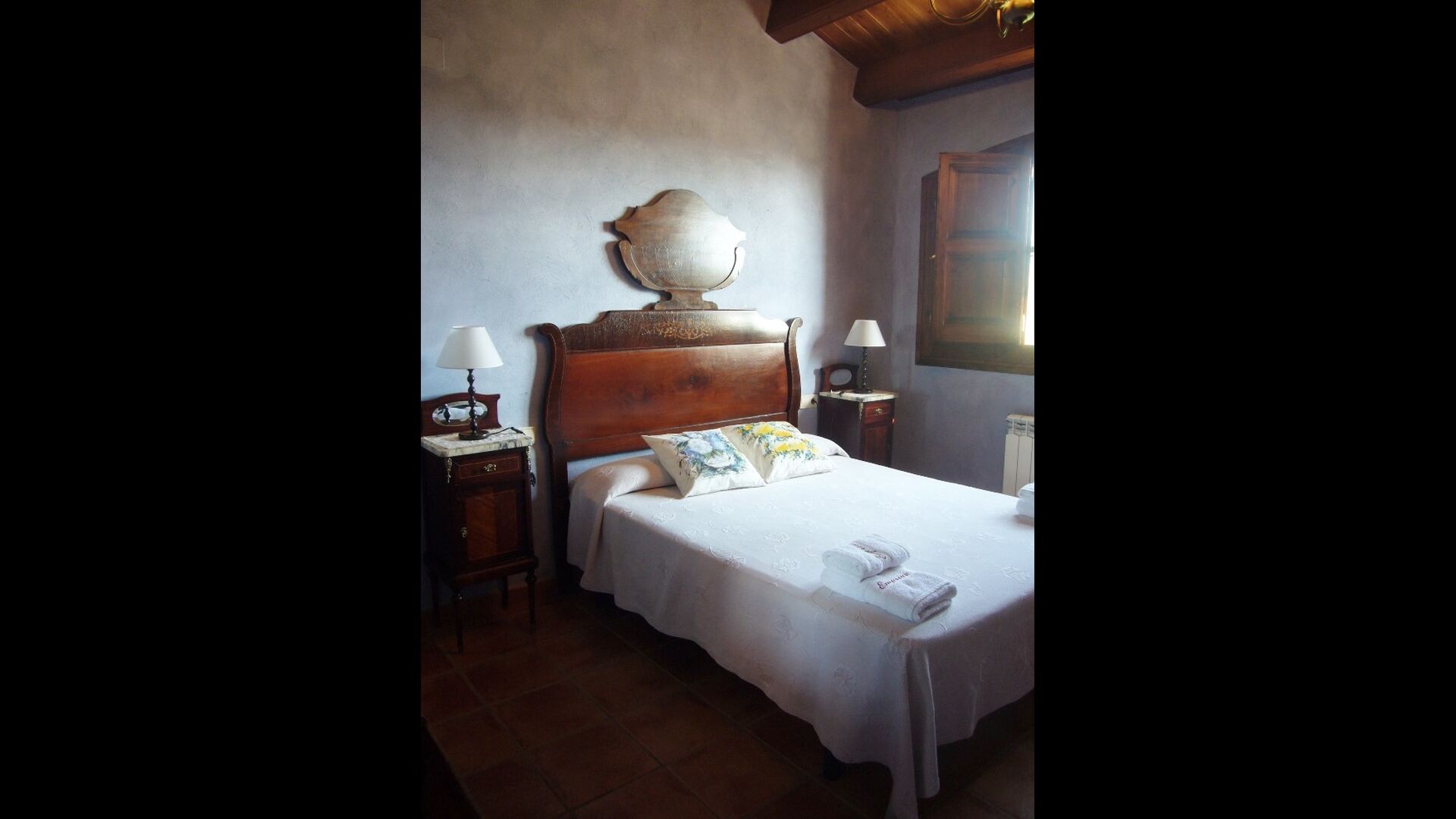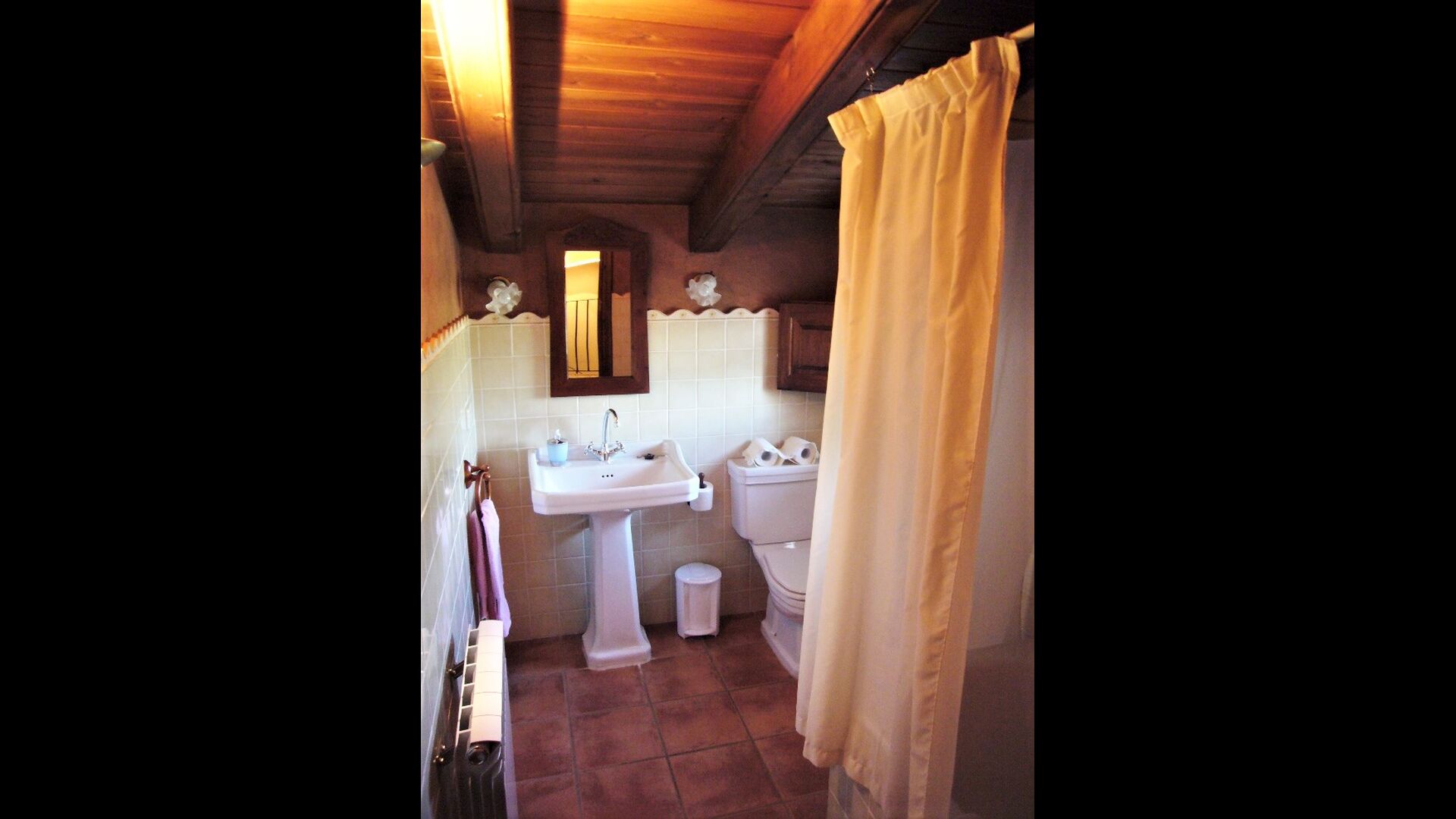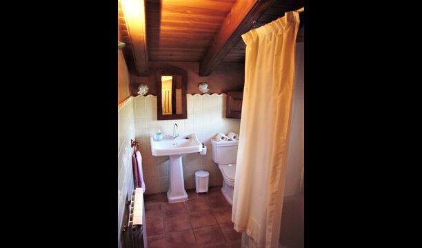 On the first floor there are 4 double rooms. The beds are made of wood and have a very classic design and are lovely soft. The rooms all have a sloping ceiling of wood, which gives a very spacious feeling. Here there are 2 bathrooms for sharing. There is also a bathtub.