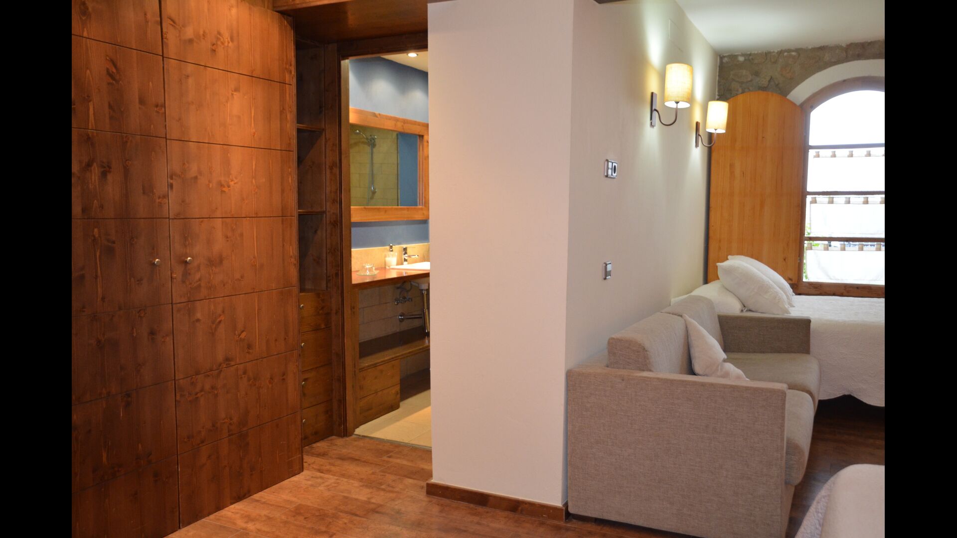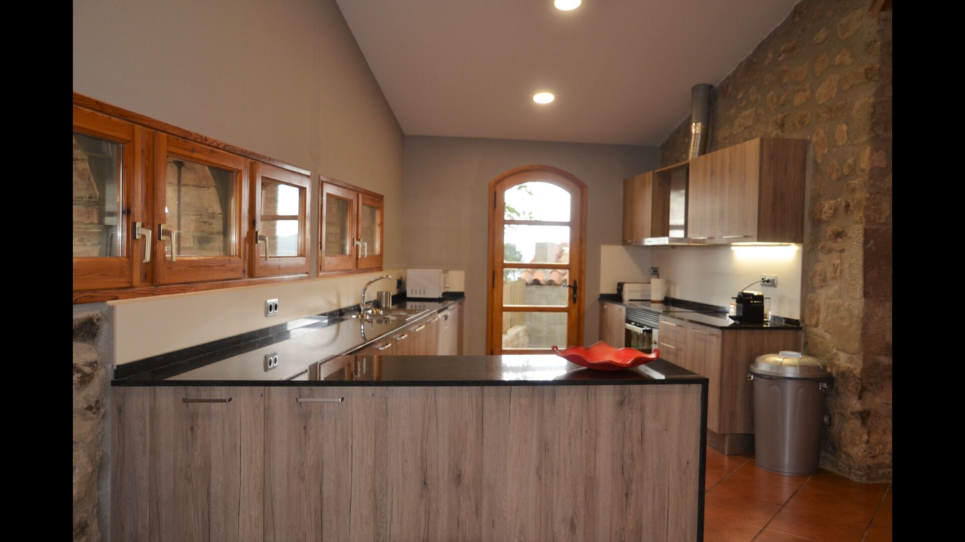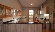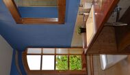 Au niveau du hall et de la terrasse, au niveau le plus bas de la maison, vous trouverez une cuisine petite mais fonctionnelle et bien située que vous utiliserez probablement en été. Il est bien équipé avec cuisinière, micro-ondes, lave-vaisselle. Avec vue sur la vallée, il y a deux fantastiques suites avec salle de bain. Elles sont très spacieuses et peuvent donc facilement être utilisées comme chambres familiales, en ajoutant des lits supplémentaires.