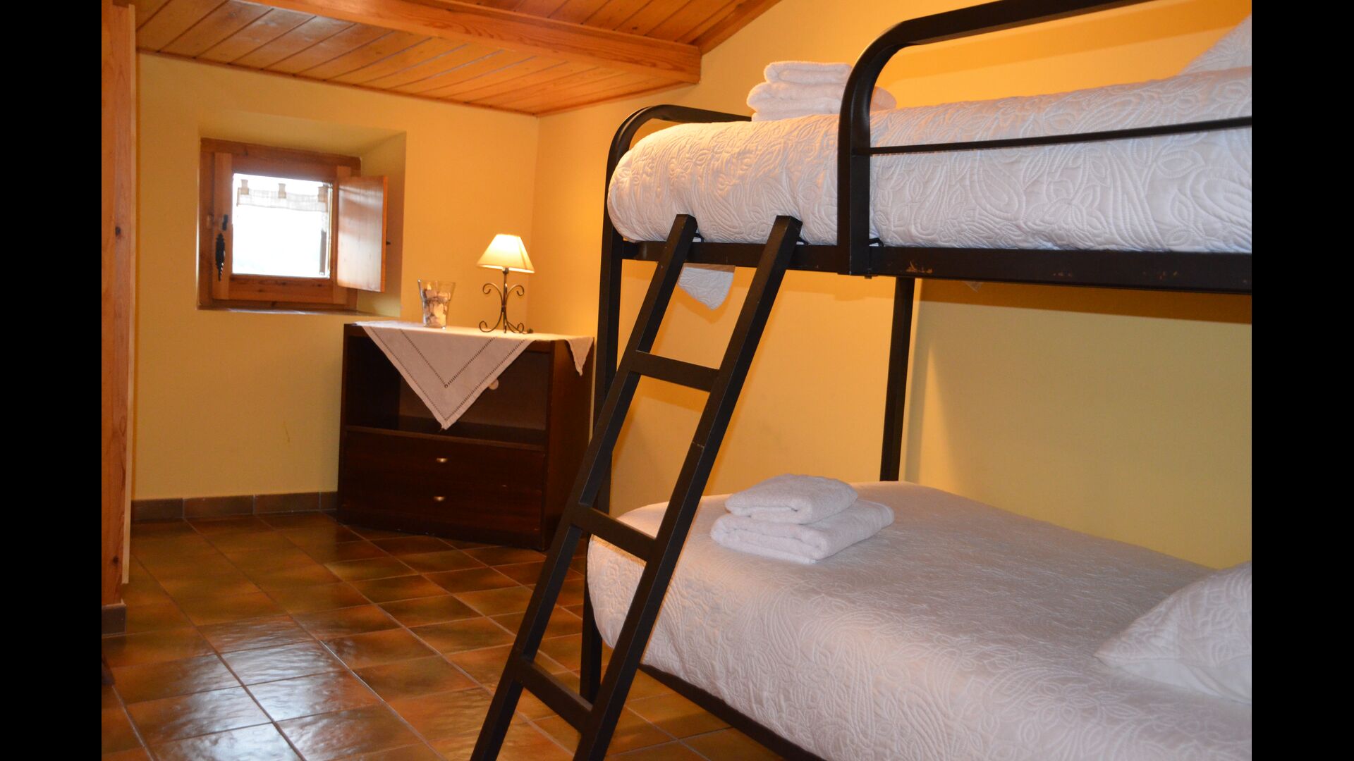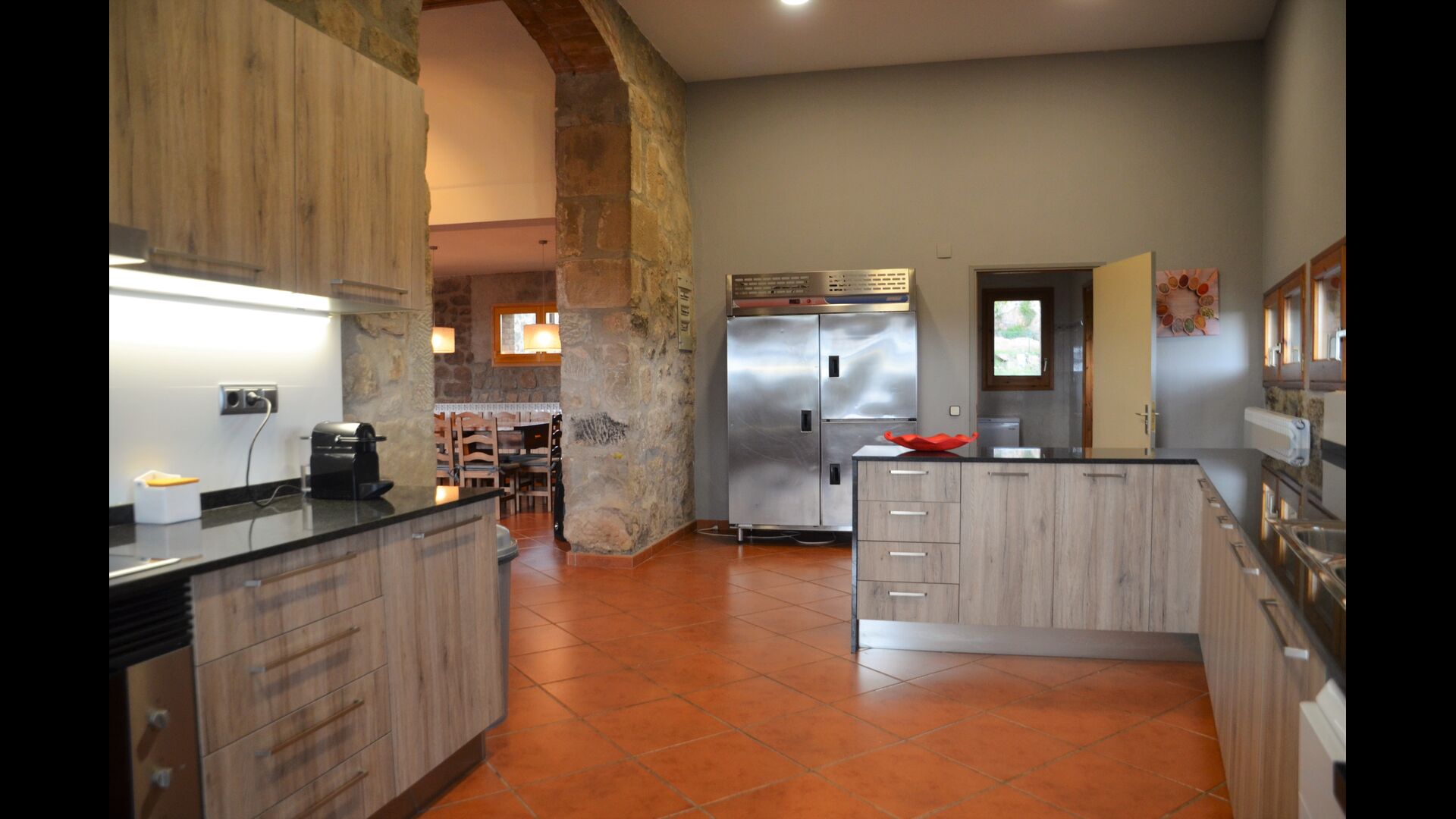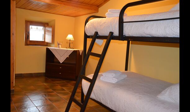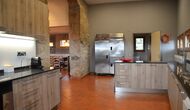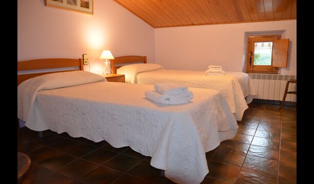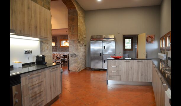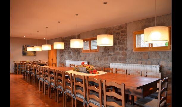 Au premier étage, auquel on peut aussi accéder directement depuis le parking en raison de la différence de niveaux, il y a une grande salle commune avec coin repas et une grande cuisine industrielle. Ces installations sont principalement utilisées en basse saison. De plus, il y a une grande chambre double avec salle de bain et éventuellement un lit supplémentaire.