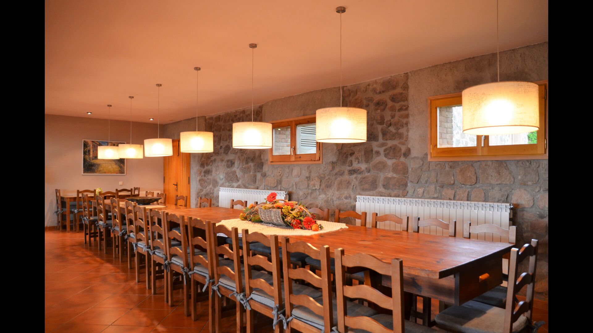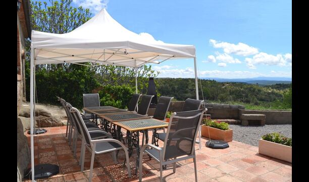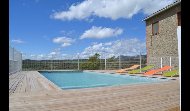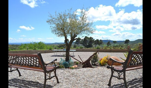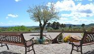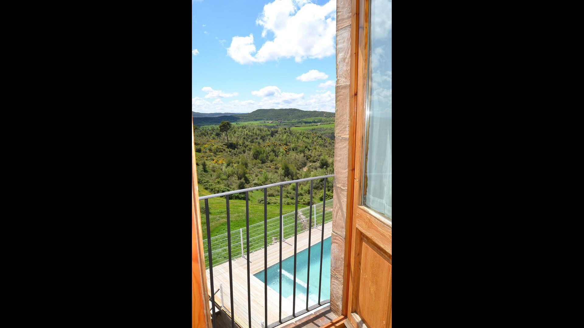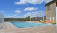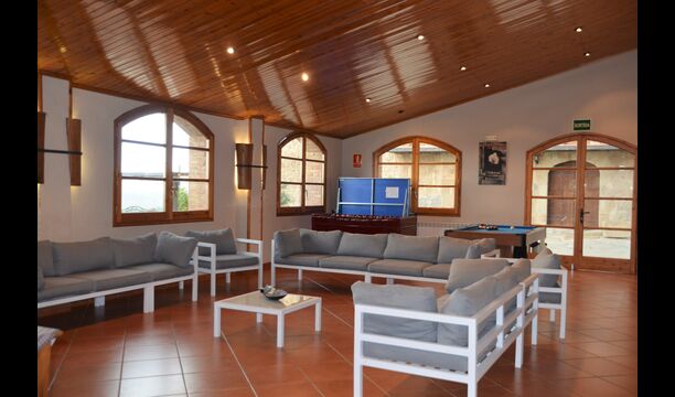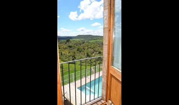 En dehors de cette salle, il y a une très belle terrasse avec des parasols, où vous pourrez manger en plein air et profiter du coucher de soleil sur la vallée avec une tasse de café ou un verre de vin ou de cava. Il y a aussi un accès direct à la très belle piscine avec piscine et chaises longues et la même vue excellente. La piscine est clôturée pour la protection des petits enfants.