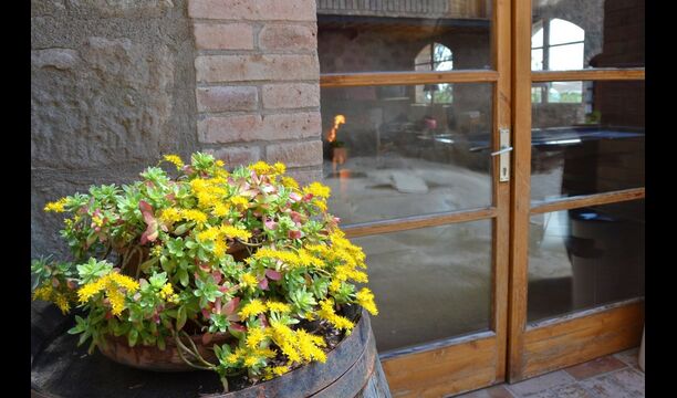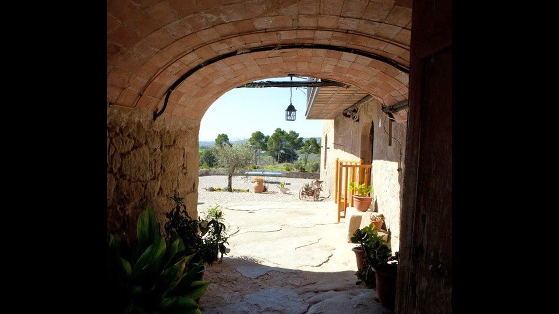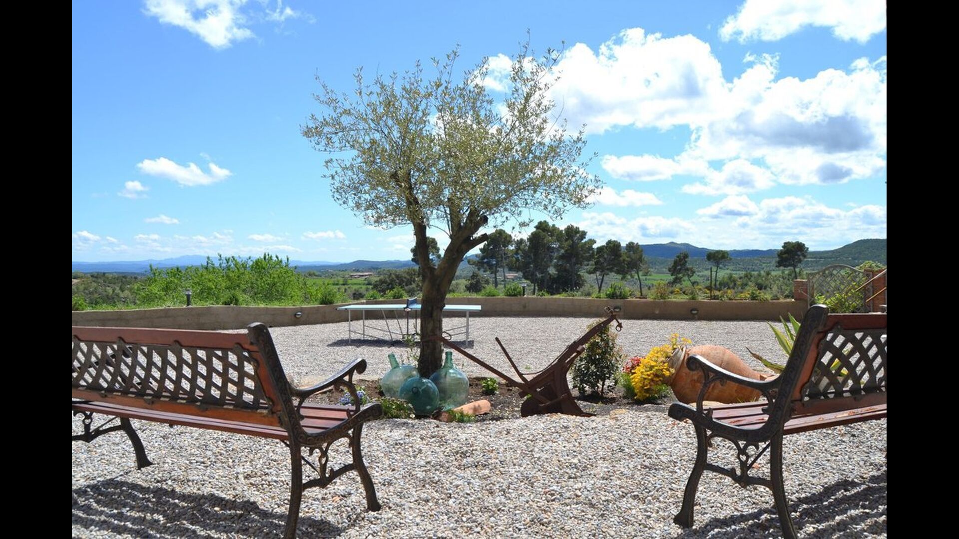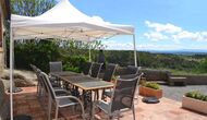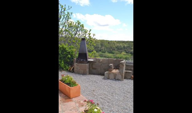 En dehors de cette salle, il y a une très belle terrasse avec des parasols, où vous pourrez manger en plein air et profiter du coucher de soleil sur la vallée avec une tasse de café ou un verre de vin ou de cava. Il y a aussi un accès direct à la très belle piscine avec piscine et chaises longues et la même vue excellente. La piscine est clôturée pour la protection des petits enfants.