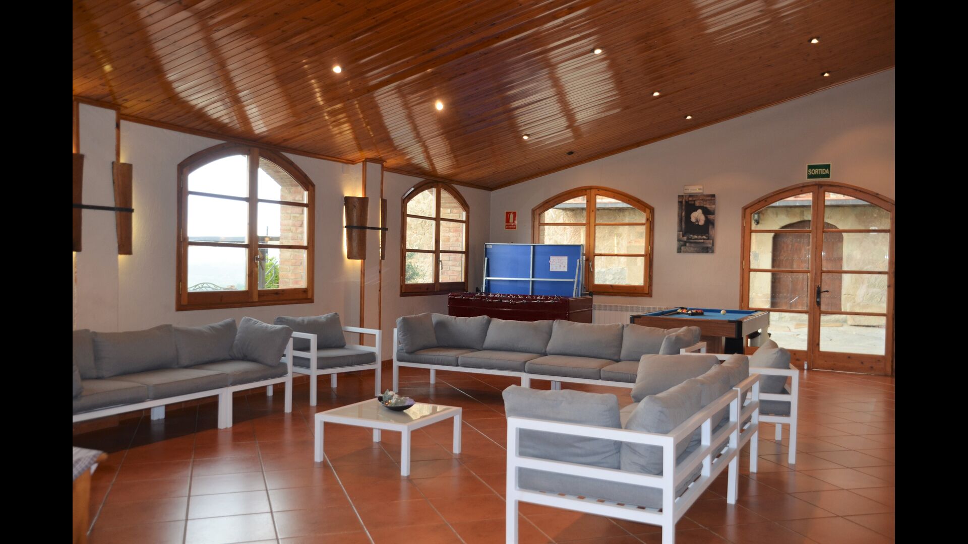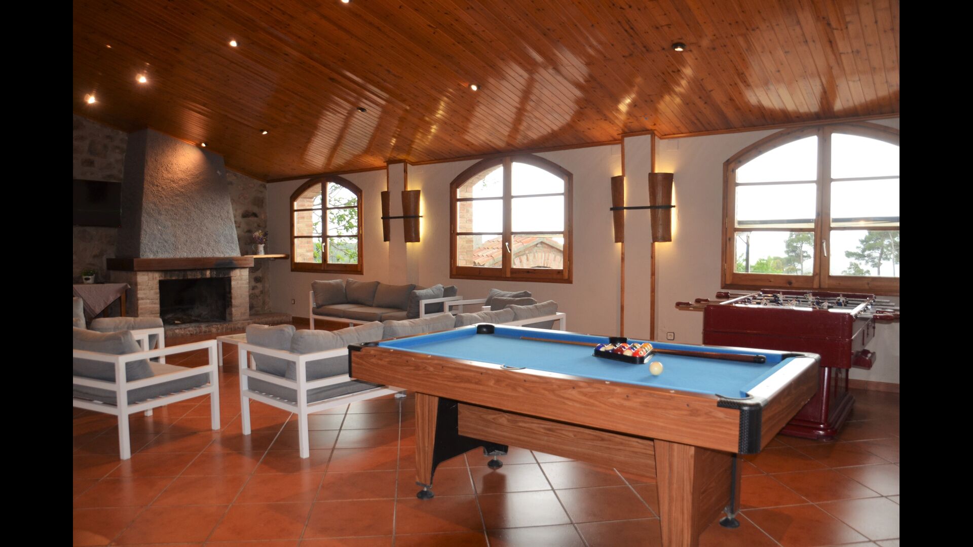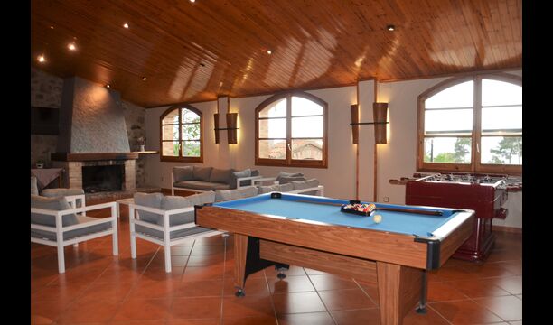 La grande qualité de la maison est le très grand hall à côté de la maison, où vous avez des canapés, une cheminée et une télévision, un grand coin repas et un réfrigérateur supplémentaire. En outre, un billard et un tennis de table et - très pratique - deux salles de bains