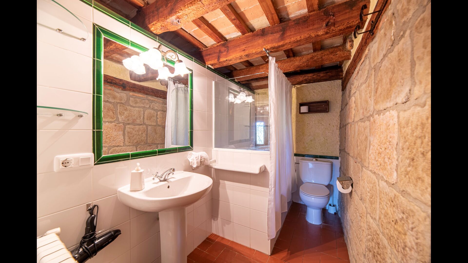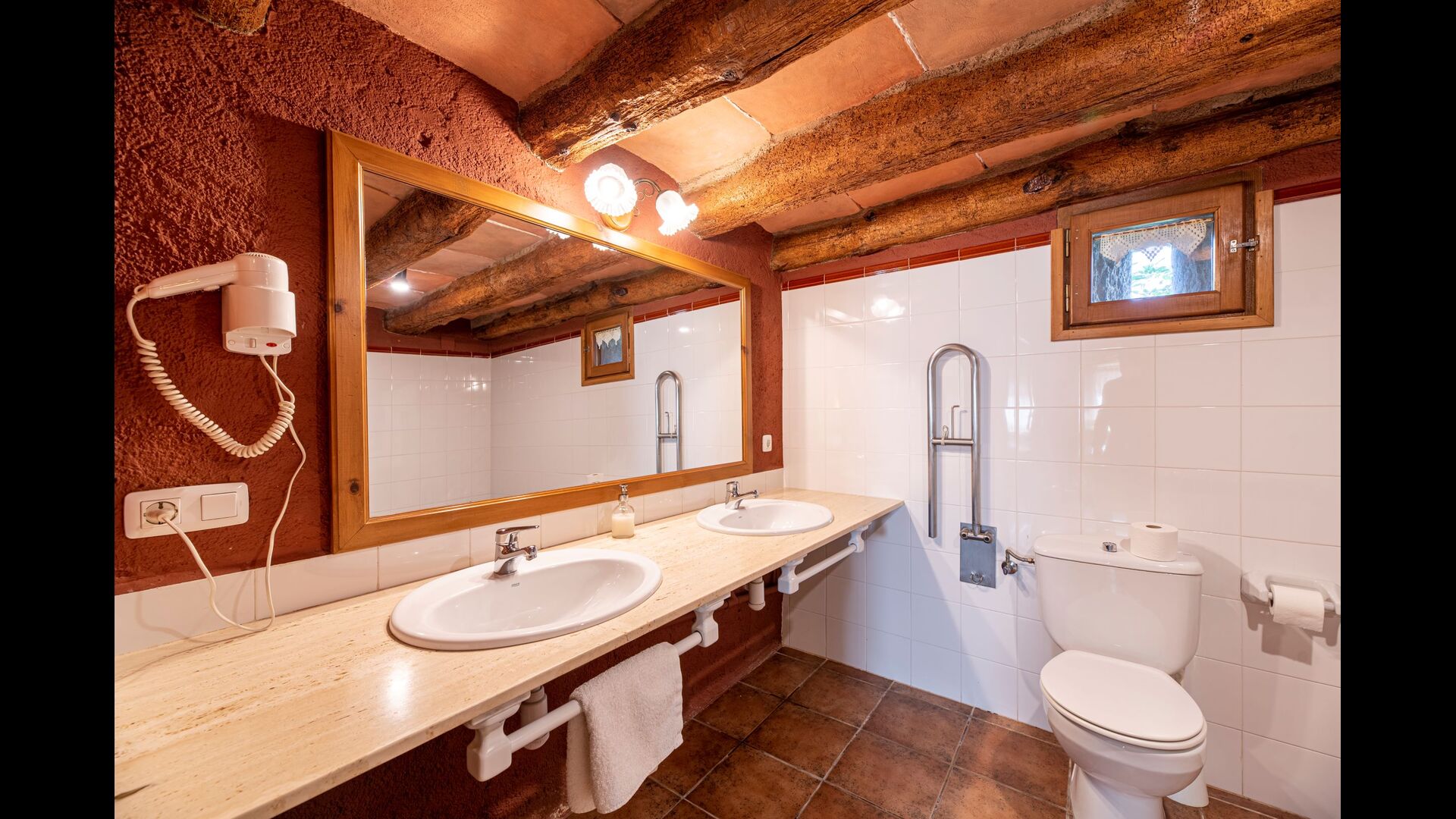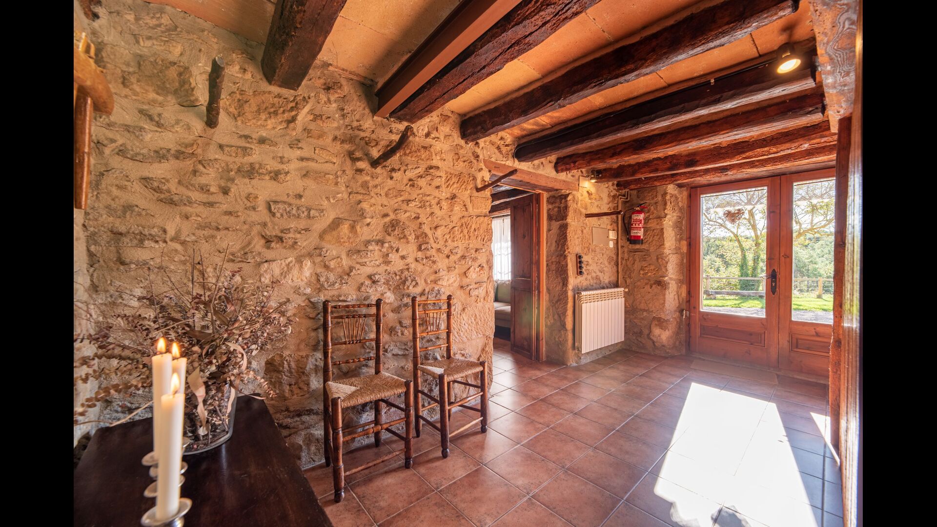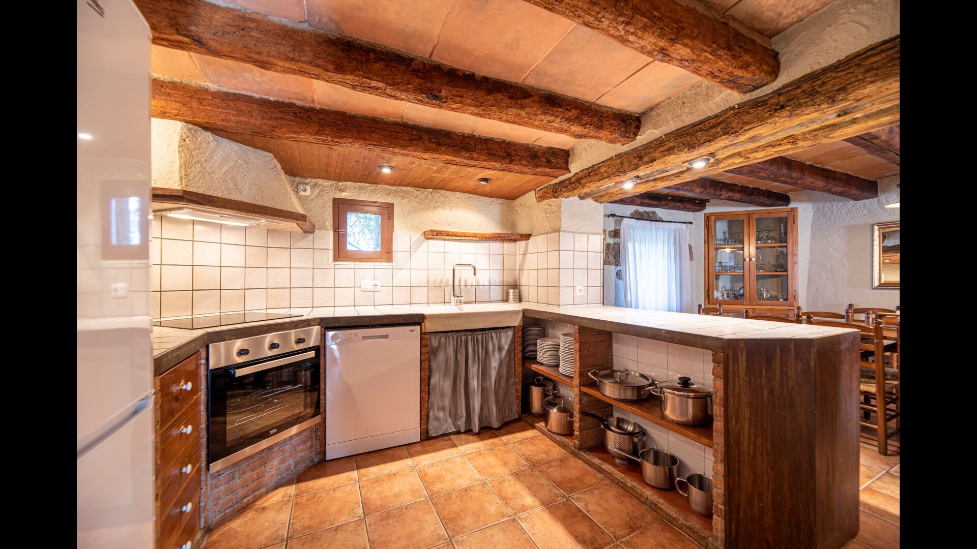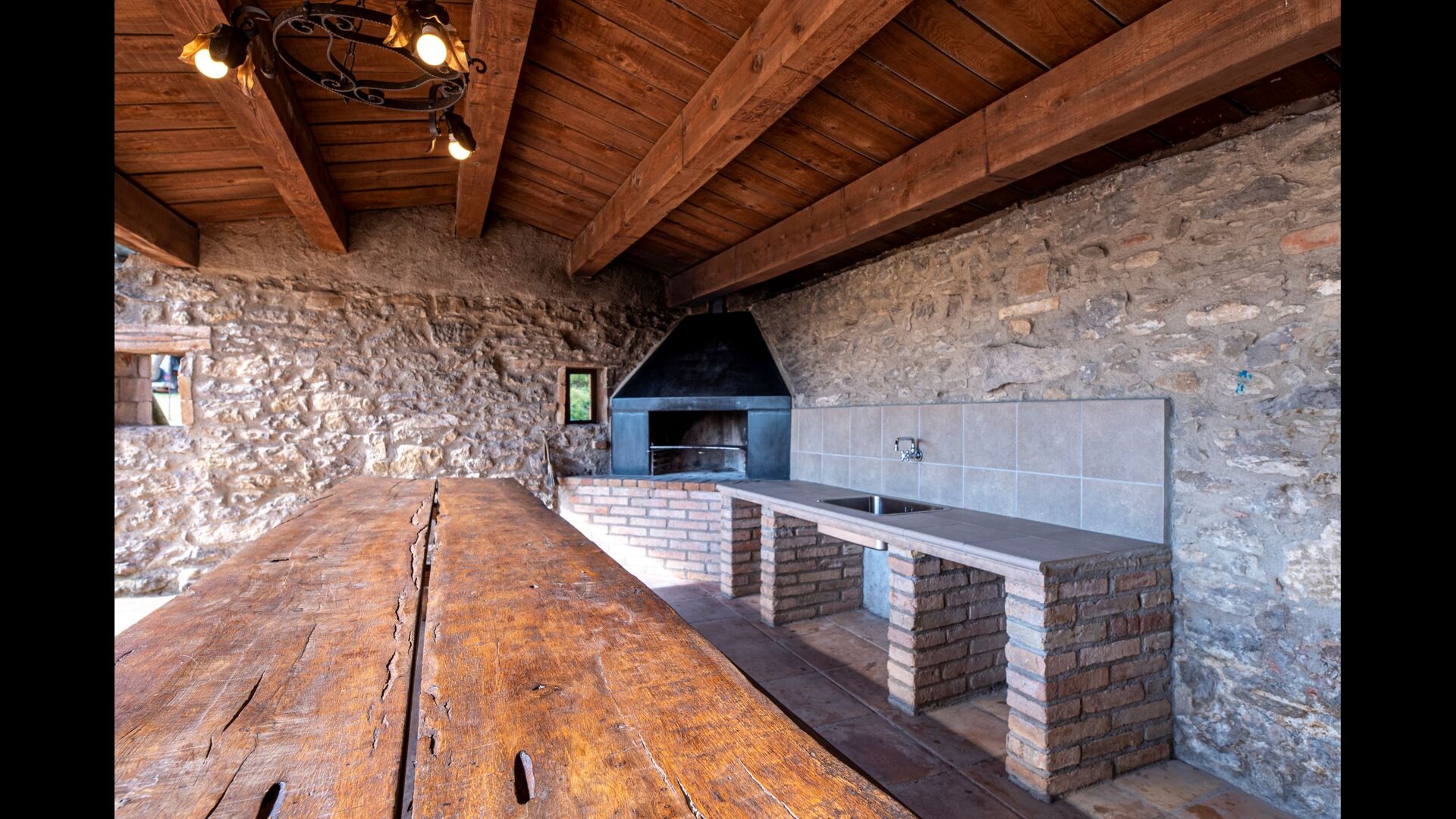 Dehors, il y a des balançoires, une salle d'activités avec tennis de table et des jouets pour les plus petits. La maison dispose d'une terrasse couverte où vous pourrez prendre vos repas et peut-être un verre de vin lors des chaudes soirées catalanes. Au-dessous de la maison, la piscine avec pelouse, chaises longues et la piscine adaptée aux enfants constitue le point de départ idéal pour se détendre en journée. La vue sur la forêt et les montagnes est excellente.