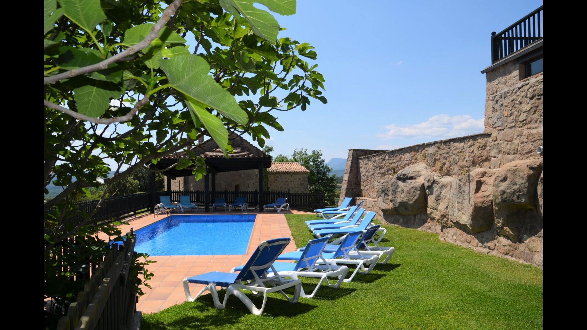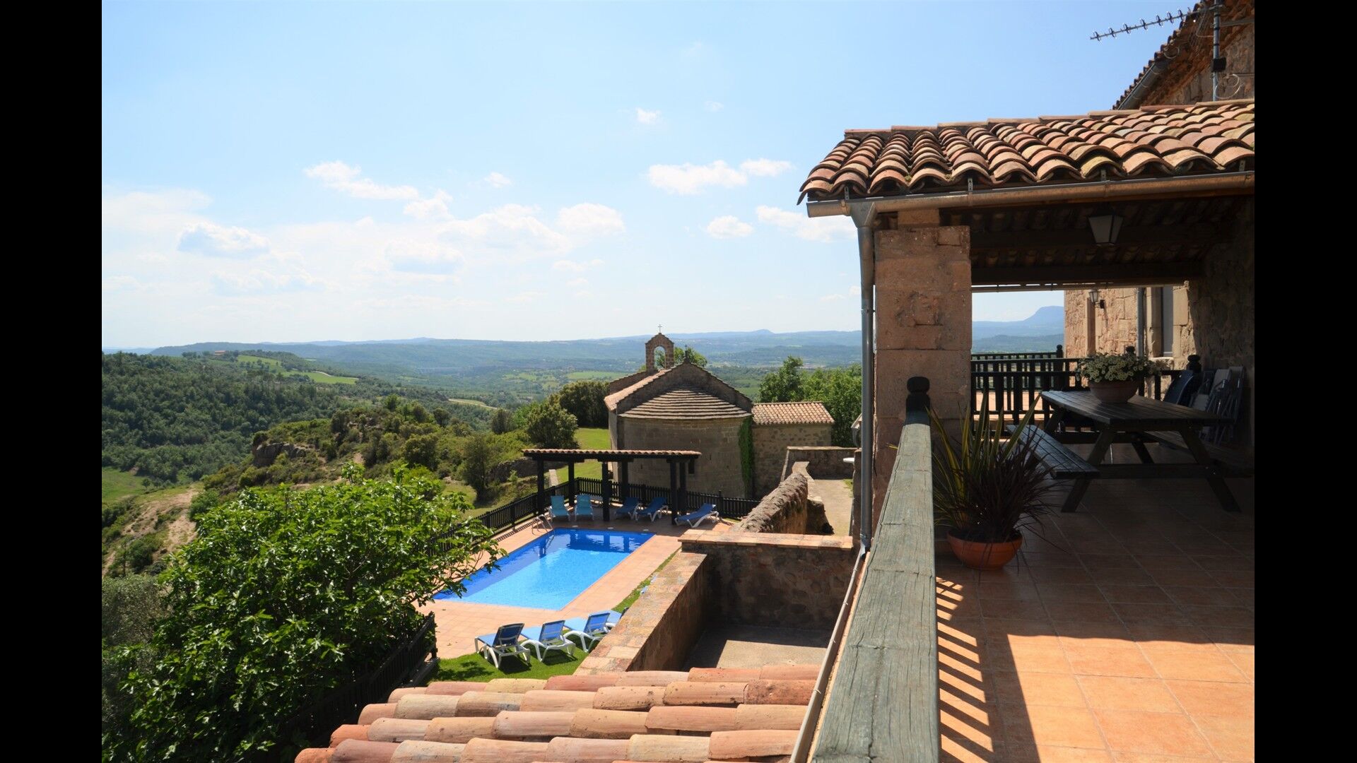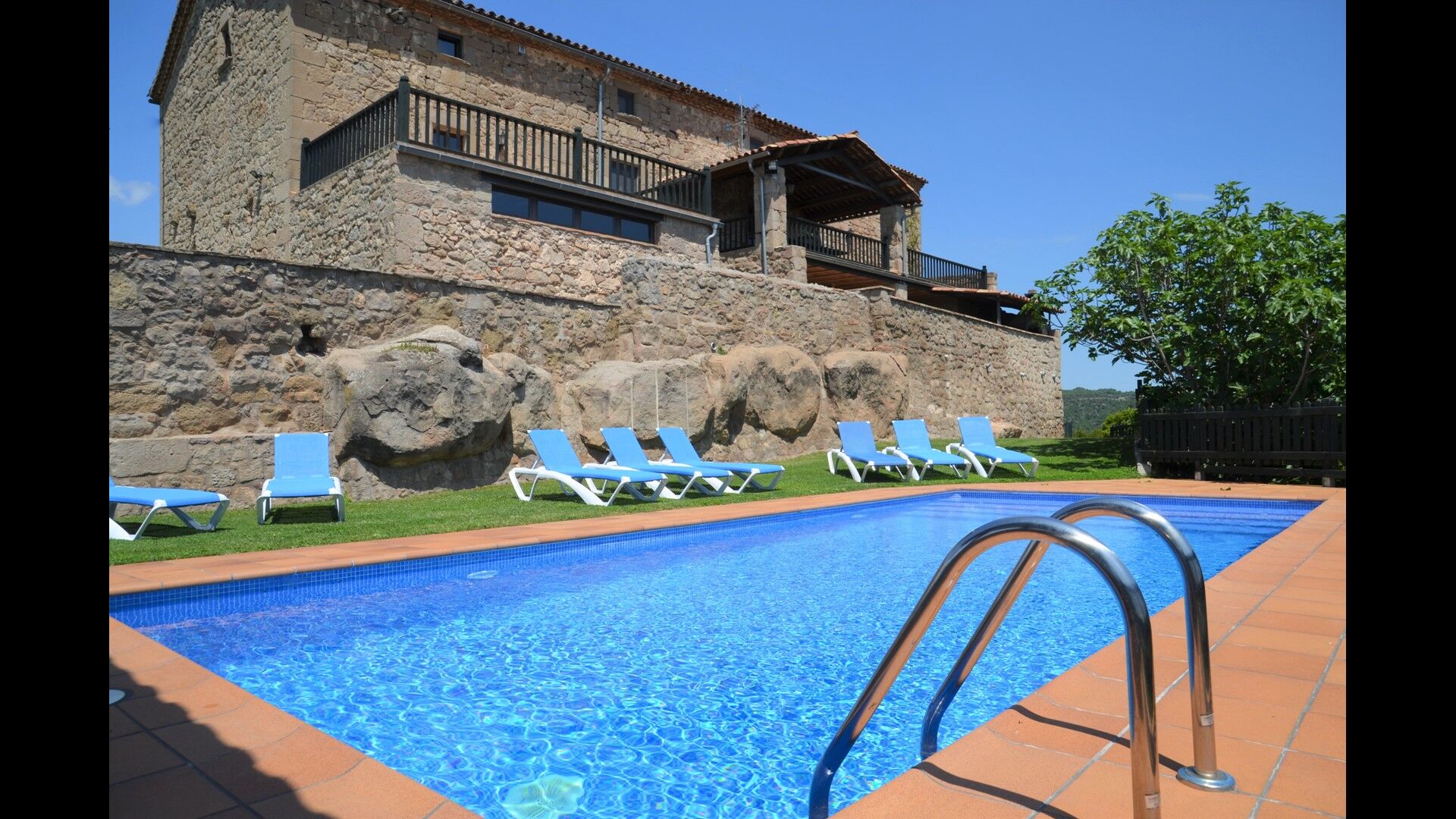 L'espace piscine de la maison de vacances se démarque. Premièrement, la piscine est grande avec une taille inférieure à 32 m2, et deuxièmement, la vue est indescriptible, car la piscine est égale au bord du plateau. Une clôture a été installée pour des raisons de sécurité. De plus, il y a des chaises longues pour tous les invités de la maison. Juste à côté de la piscine se trouve une terrasse couverte, qui sera probablement le point de rencontre des vacances. Il y a aussi une autre terrasse avec accès direct à la cuisine. Ici, vous pourrez déguster des plats faits maison pendant les longues et chaudes soirées catalanes.
