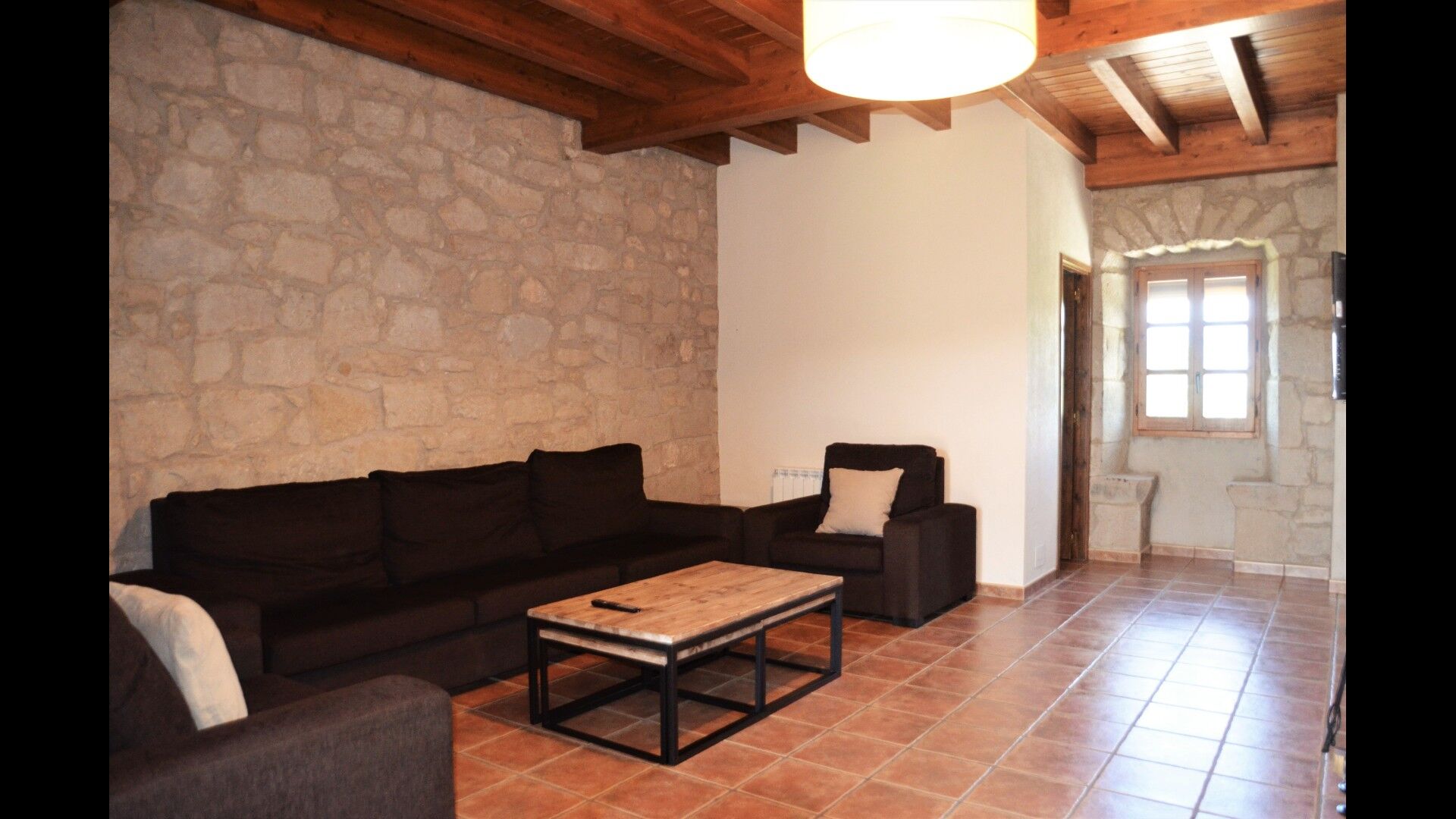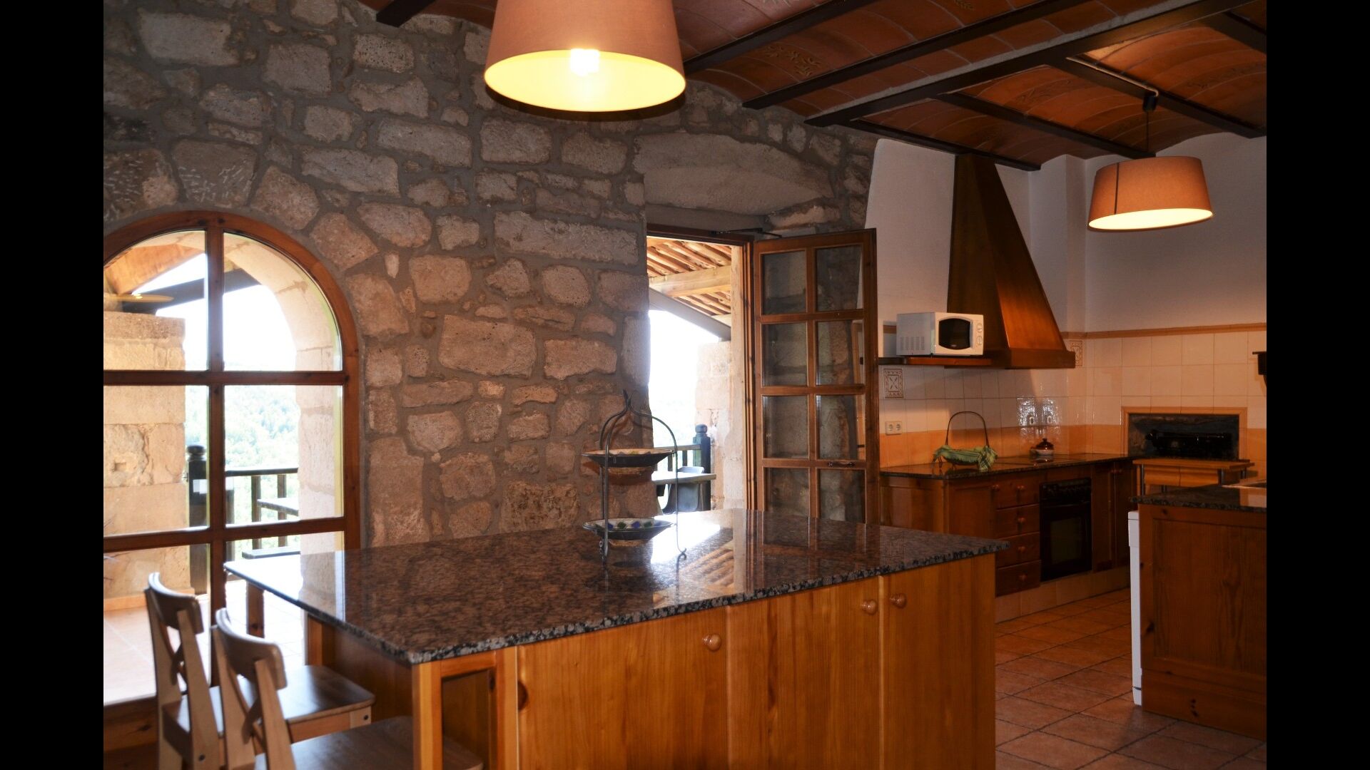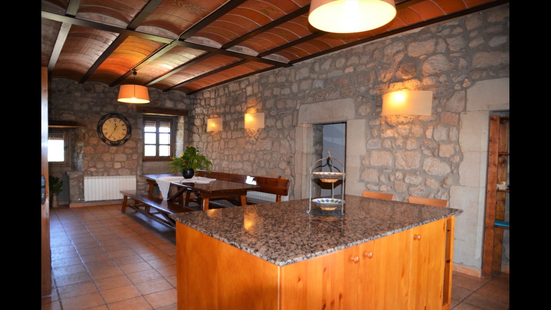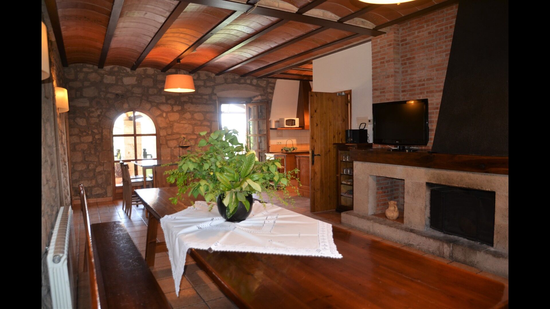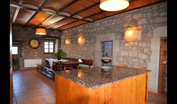 La belle cuisine bien équipée comprend entre autres un micro-ondes, un lave-vaisselle, un four et bien plus encore. Il est même possible de réserver un chef privé un soir - c'est fortement recommandé. Reliée à la cuisine, il y a une grande et classique table longue catalane, où vous pourrez déguster la nourriture. Dans la même pièce, il y a un petit coin salon avec des canapés moelleux.