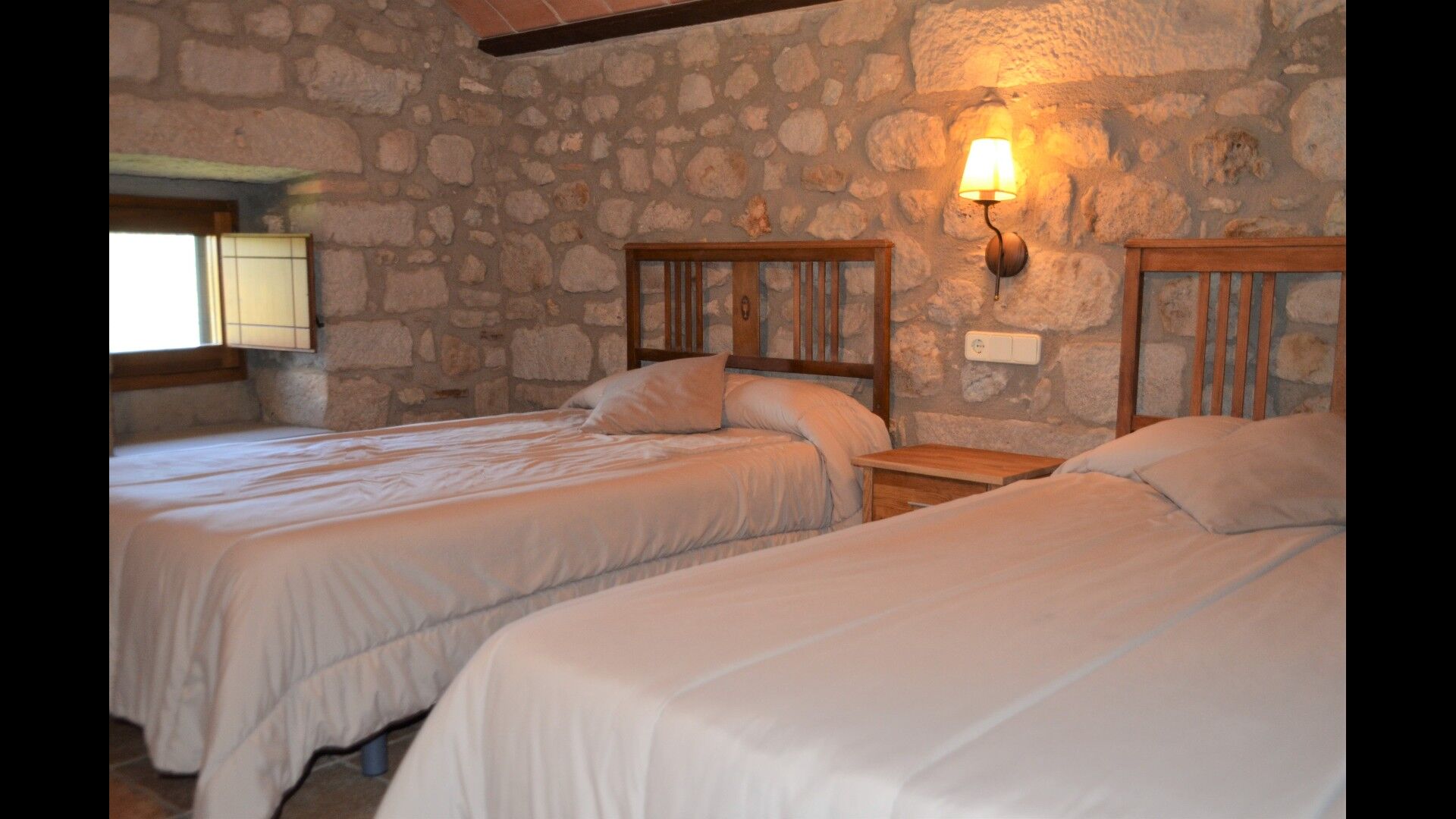 Ildeux chambres au premier étage, où vous trouverez également la cuisine, la salle à manger et la terrasse supérieure. Une chambre a un lit double et une chambre a deux lits simples. Ils partagent une salle de bain.