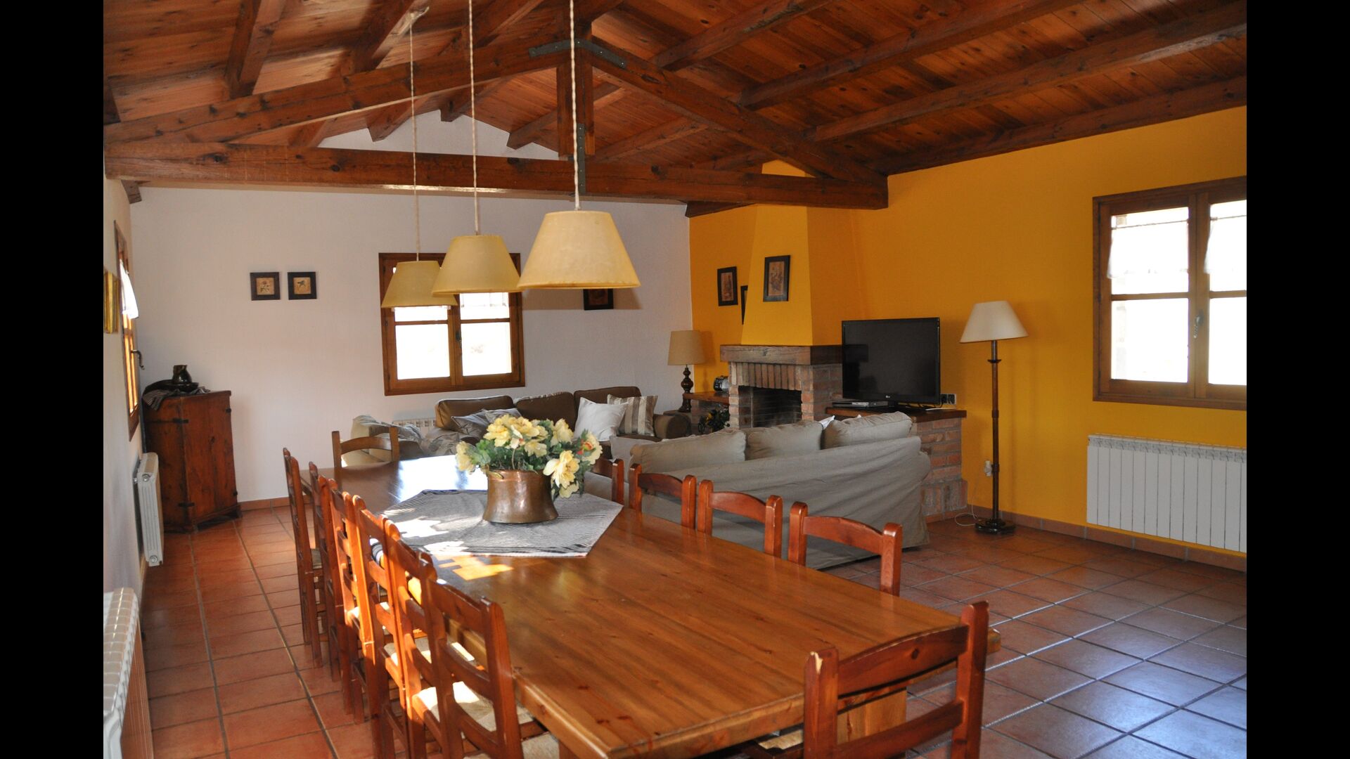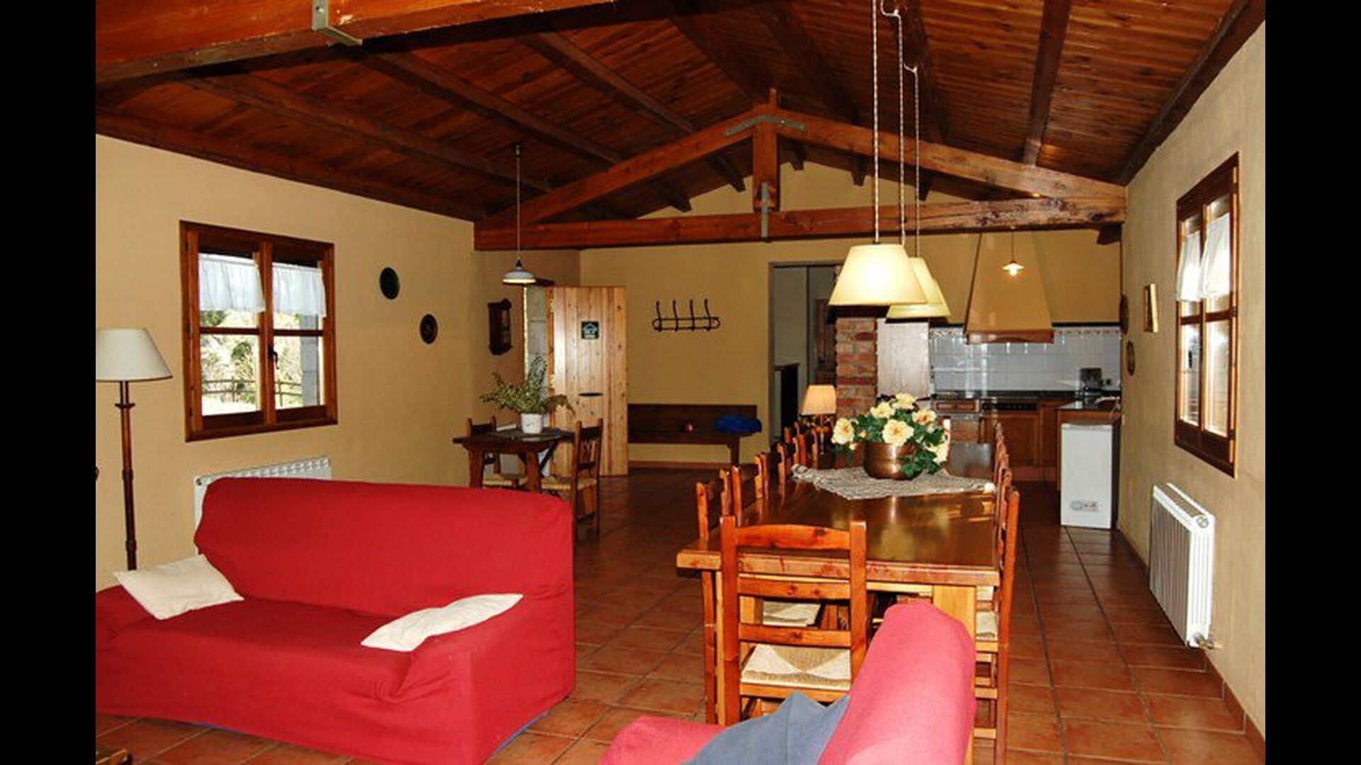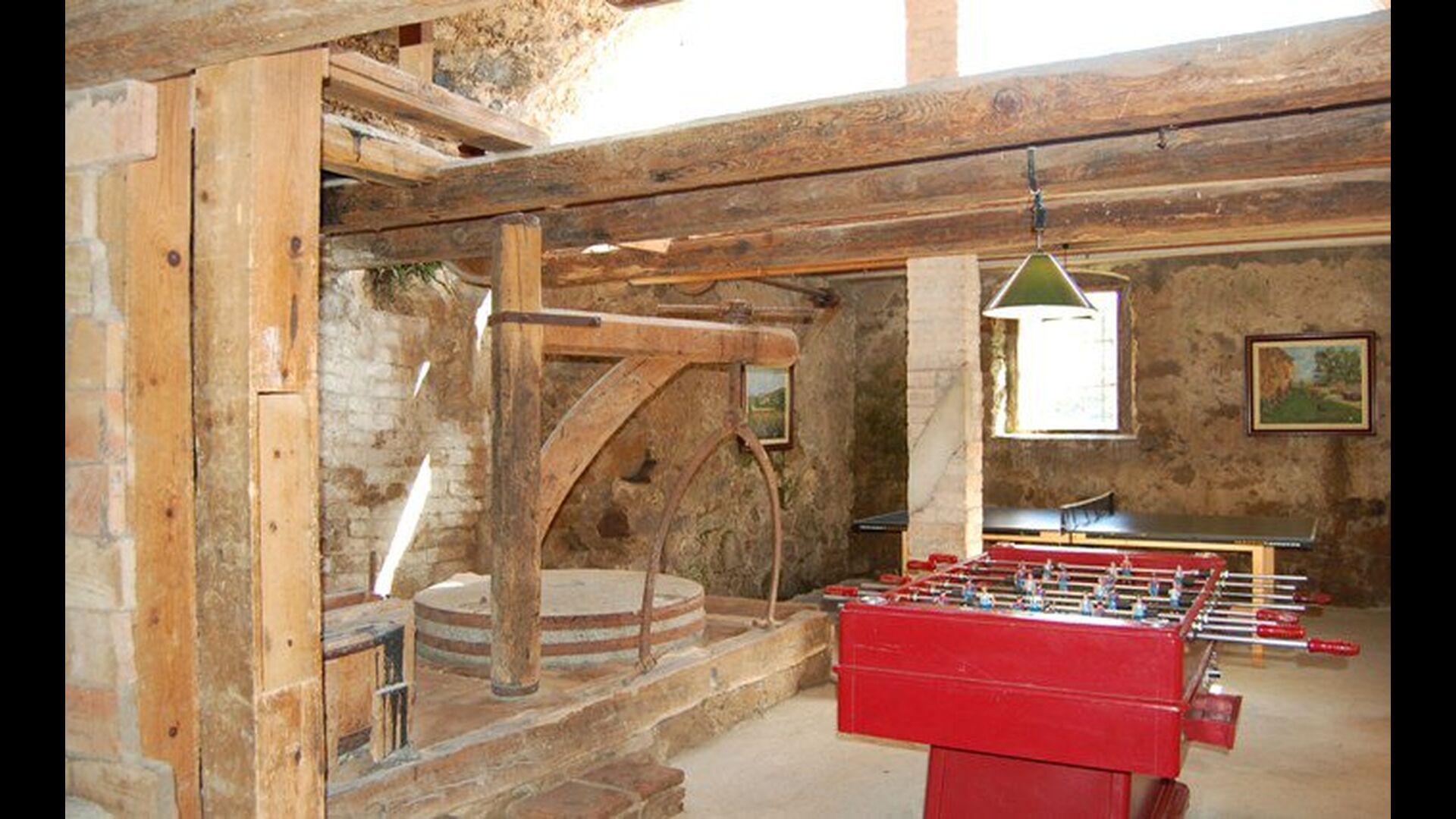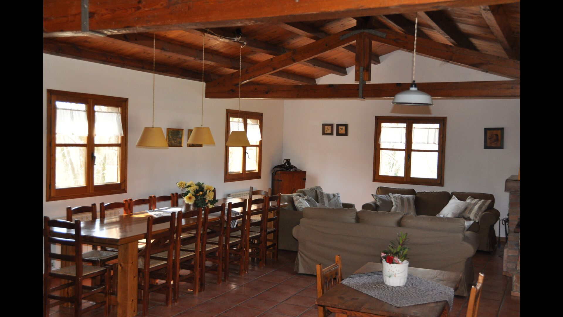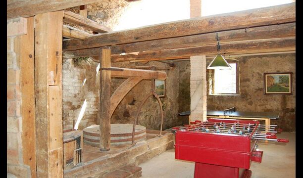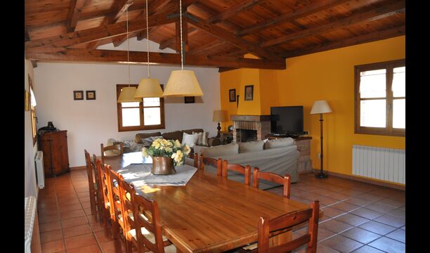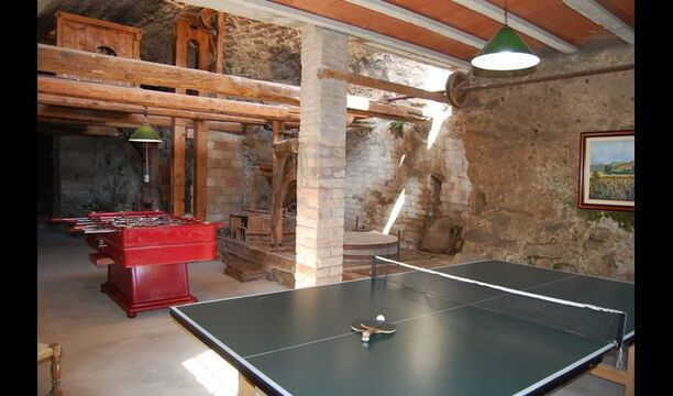 Les espaces intérieurs sont très agréables à l’extérieur. Après la très charmante entrée principale, vous êtes accueilli par la grande salle familiale de l'immeuble. Il y a tout d'abord une très belle et moderne cuisine catalane dotée d'un four, d'un lave-vaisselle, d'un micro-ondes et bien plus encore. Plus loin, il y a une longue et élégante table à manger pouvant accueillir tous les habitants de la maison. Juste à côté, il y a trois canapés rouges qui forment un coin très confortable. Le plafond dans toute la maison est très joli avec des poutres en bois. Les chambres sont comme le reste de la maison très grandes et spacieuses. Les 5 chambres doubles sont très grandes et élégantes, tandis que la chambre pour 4 personnes est parfaite pour une chambre pour enfants. Il y a 4 salles de bain très soignées et joliment décorées. Au dernier étage, vous trouverez une salle de jeux avec baby-foot et tennis de table.