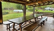 Lorsque la propriété est louée ensemble, la terrasse de la grande maison est aménagée pour que tout le groupe puisse manger ensemble et s'amuser ensemble.