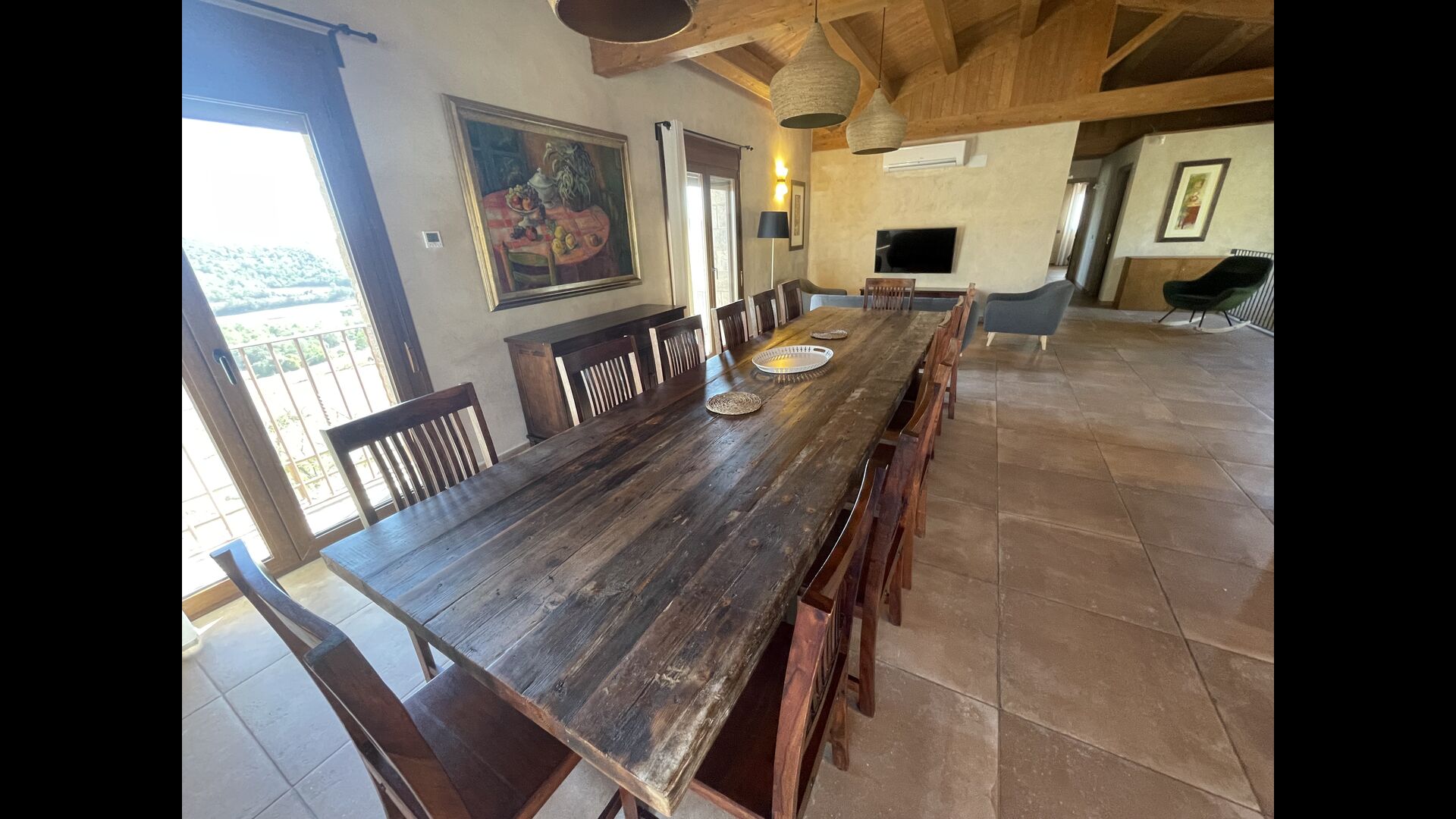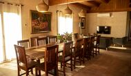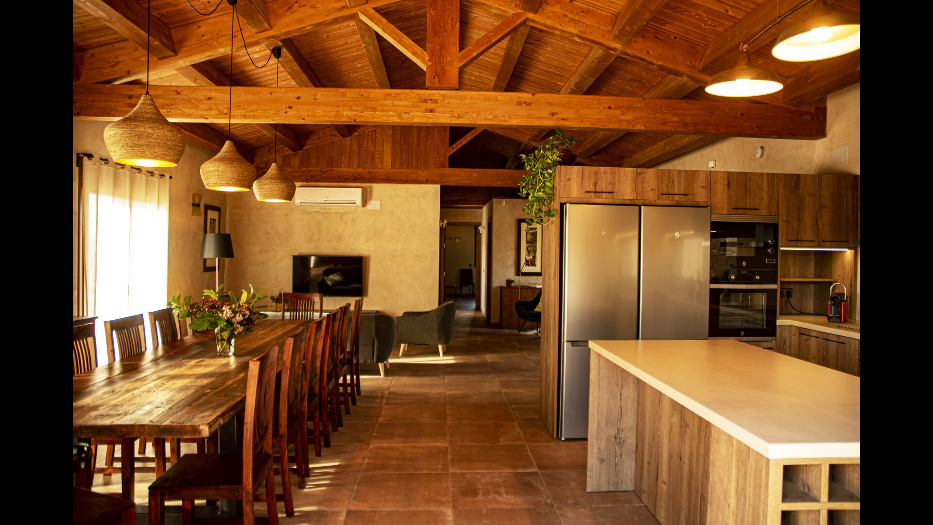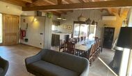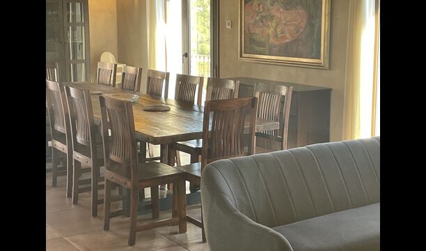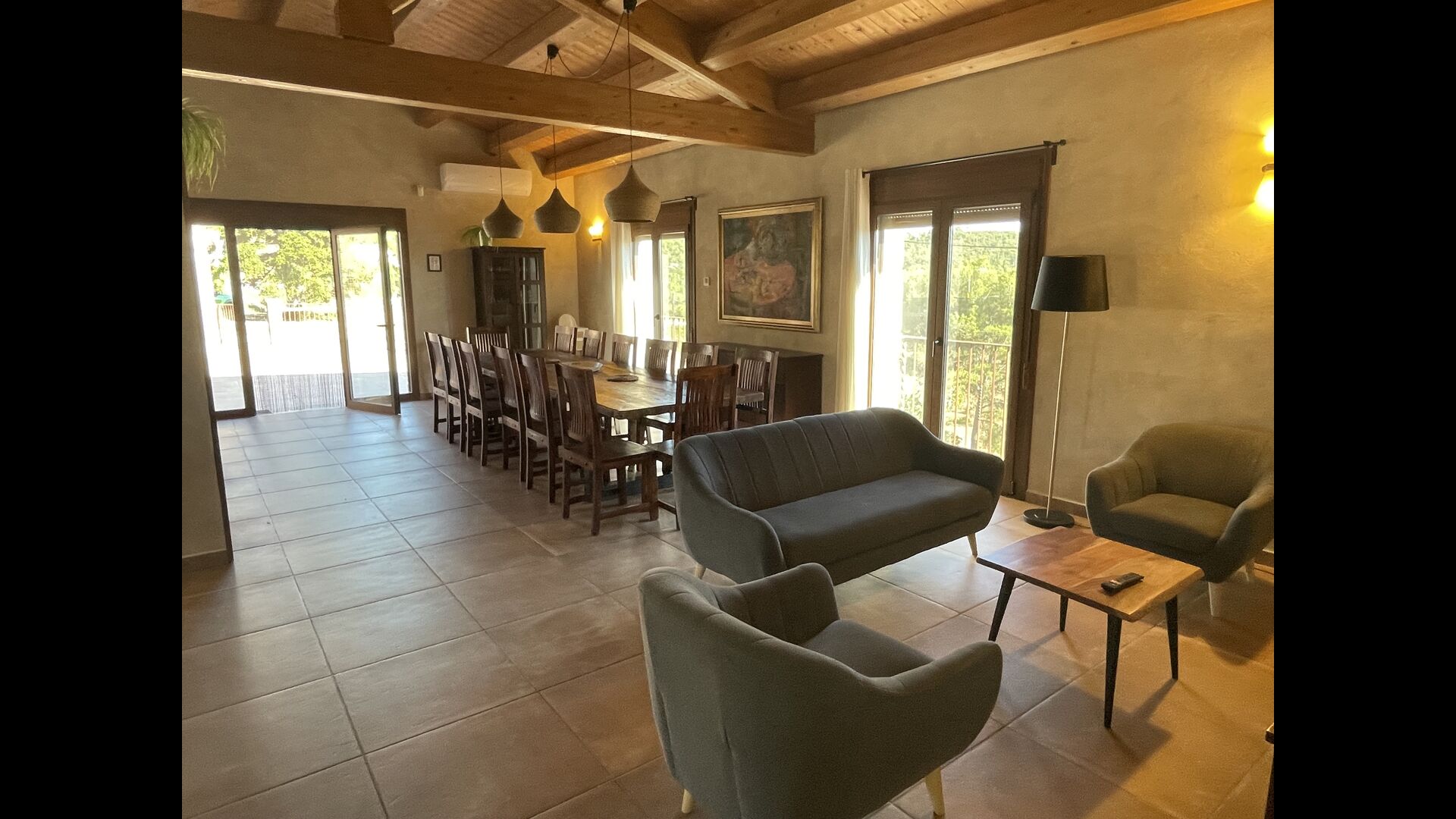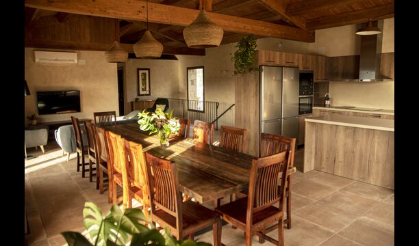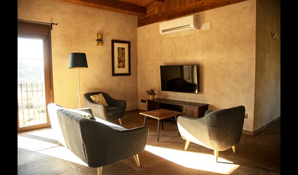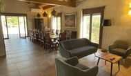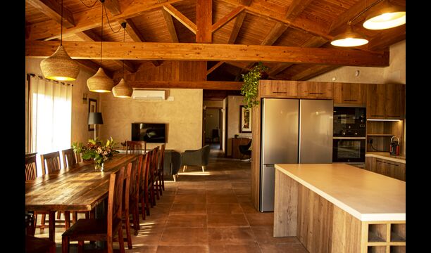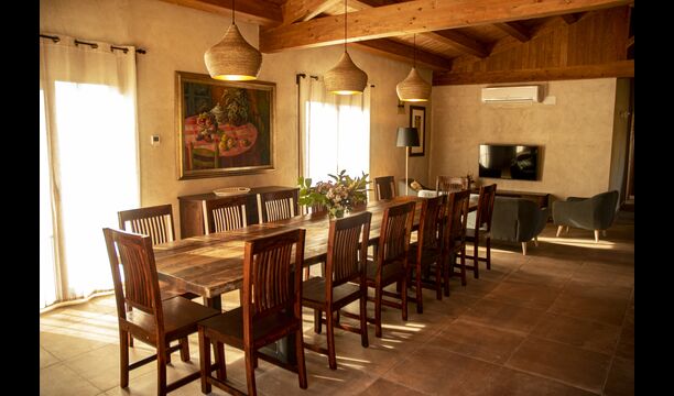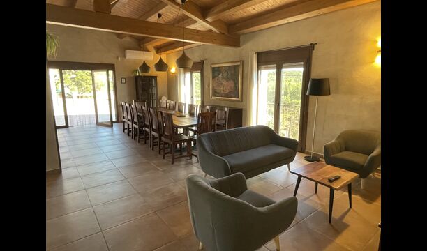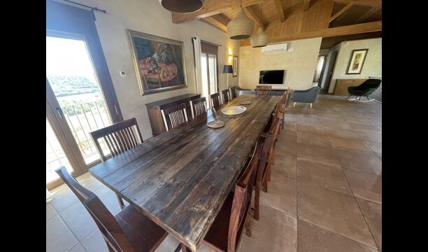 Le hall/salon principal, beau et tranquille, contient une grande et longue table à dîner en bois, et - une salle à manger. directement conjoint à cette zone - est la cuisine modernisée et de haute qualité avec 2 réfrigérateurs (avec congélateurs), un four et tout le nécessaire ustensiles de cuisine. Les deux zones sont baignées par les rayons chauds du soleil, ce qui en fait un endroit belle et attrayant pour prendre vos petits-déjeuners, déjeuners et dîners. Derrière la salle à manger se trouve le salon commun, équipé d'une cheminée, de confortables canapés, d'une table basse et d'une télévision. . La pièce est également climatisée, donc si la chaleur vous envahit, c'est l'endroit idéal pour vous allonger pendant les heures les plus chaudes de la journée.