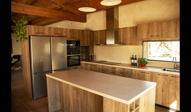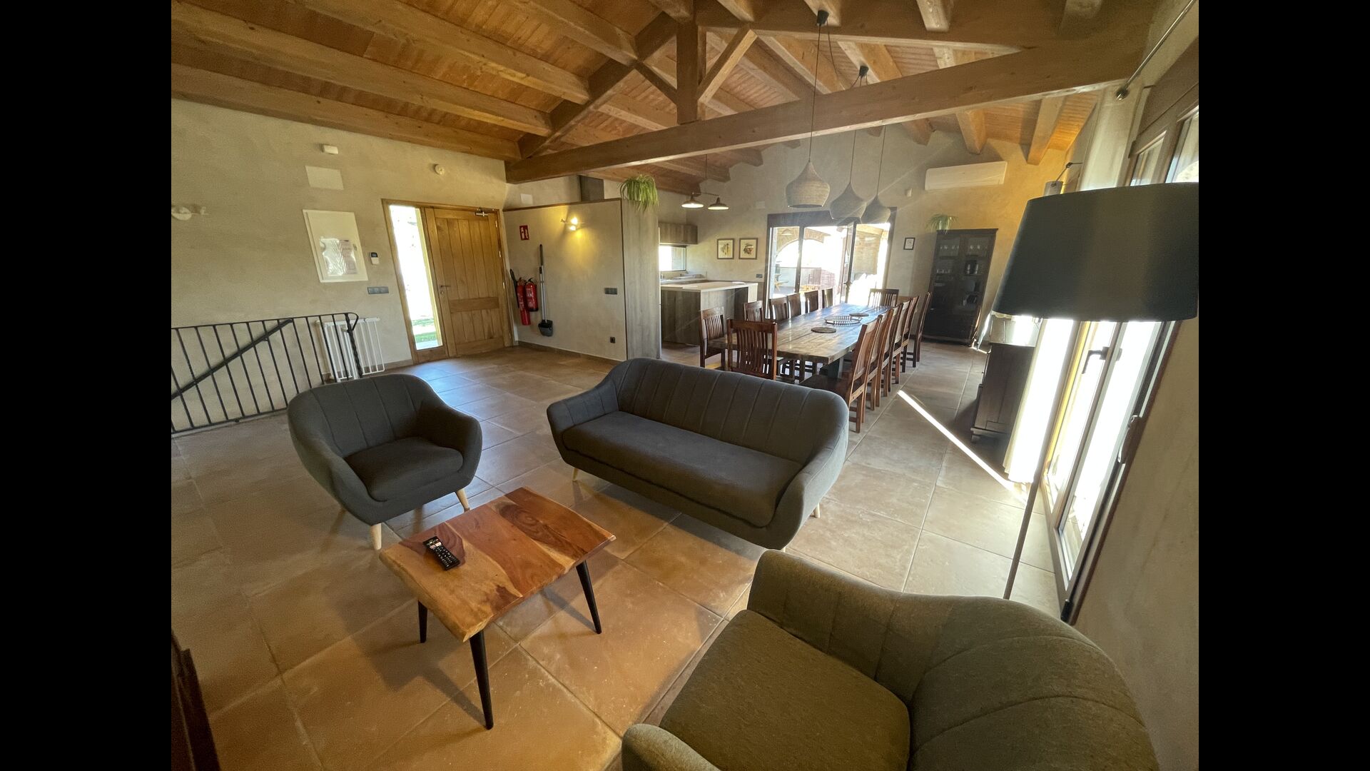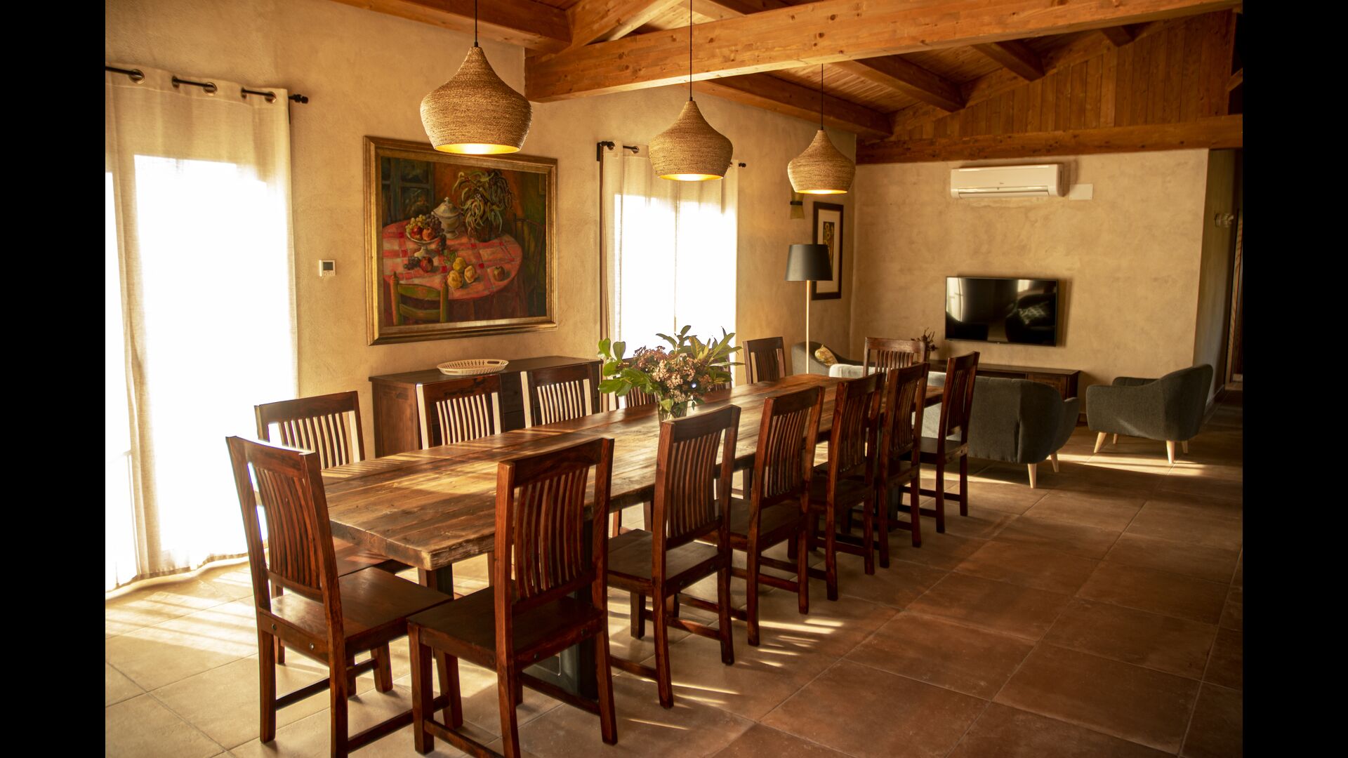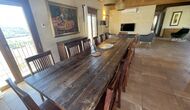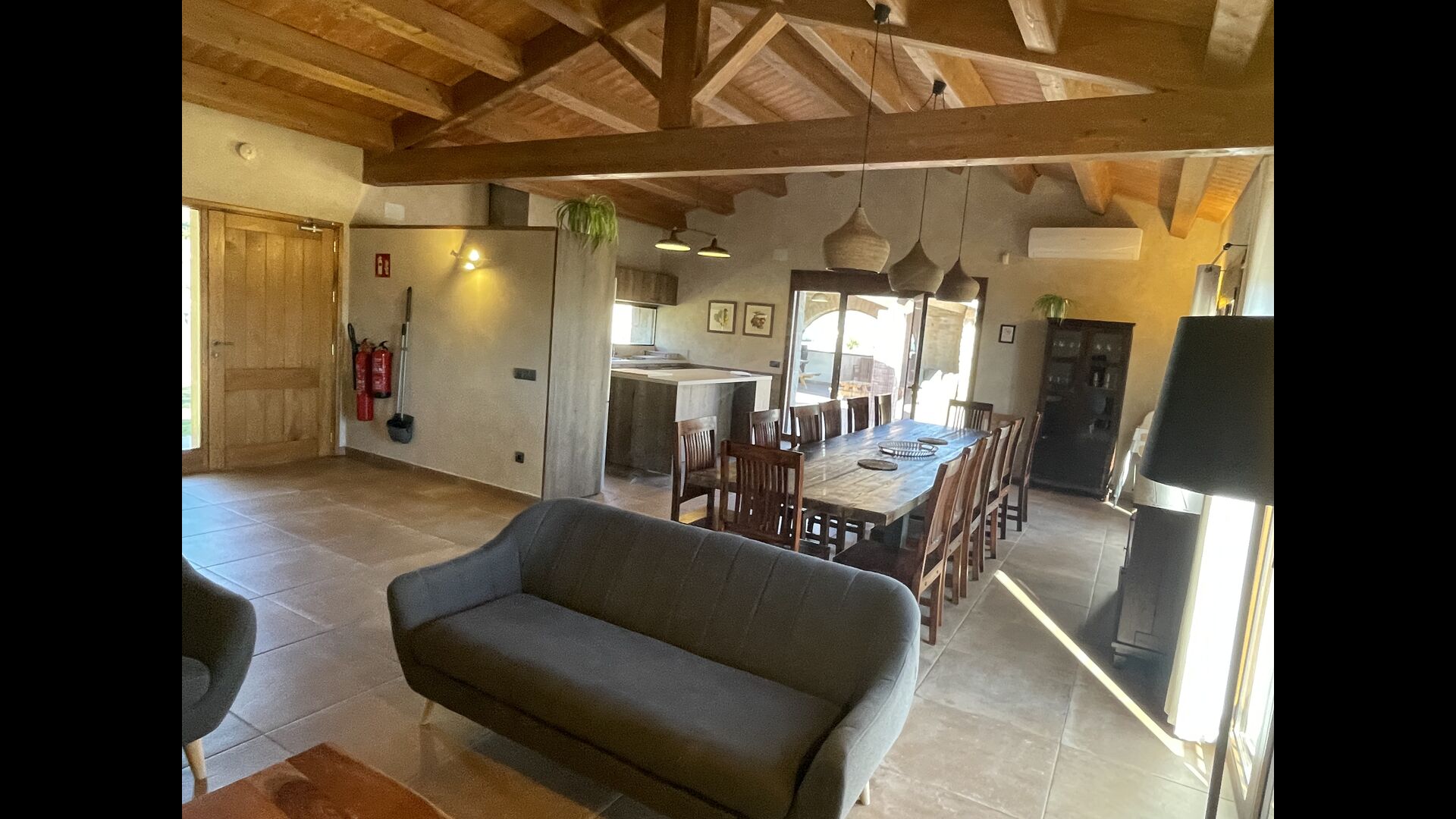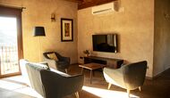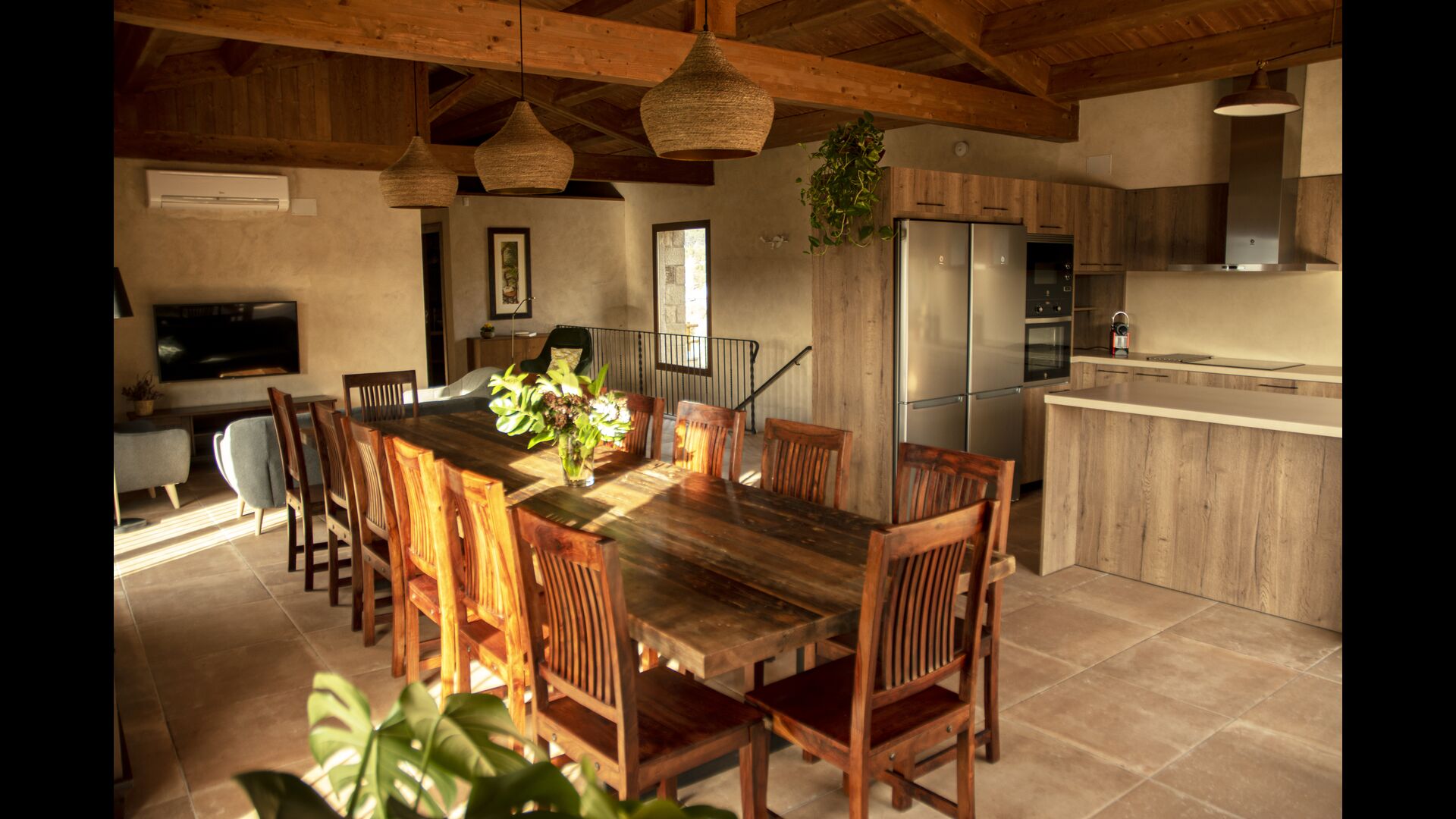Le hall/salon principal, beau et tranquille, contient une grande et longue table à dîner en bois, et - une salle à manger. directement conjoint à cette zone - est la cuisine modernisée et de haute qualité avec 2 réfrigérateurs (avec congélateurs), un four et tout le nécessaire ustensiles de cuisine. Les deux zones sont baignées par les rayons chauds du soleil, ce qui en fait un endroit belle et attrayant pour prendre vos petits-déjeuners, déjeuners et dîners. Derrière la salle à manger se trouve le salon commun, équipé d'une cheminée, de confortables canapés, d'une table basse et d'une télévision. . La pièce est également climatisée, donc si la chaleur vous envahit, c'est l'endroit idéal pour vous allonger pendant les heures les plus chaudes de la journée.