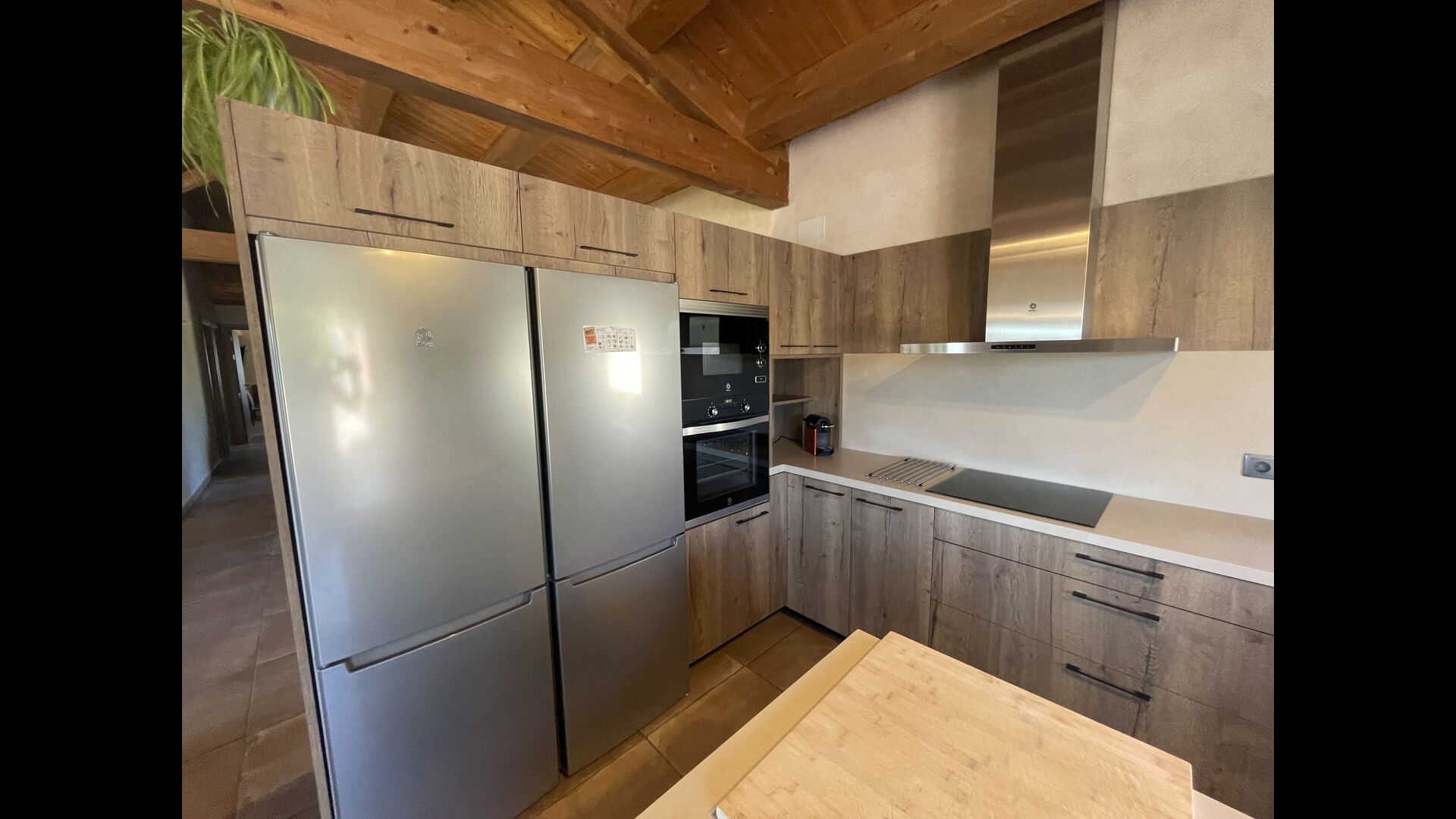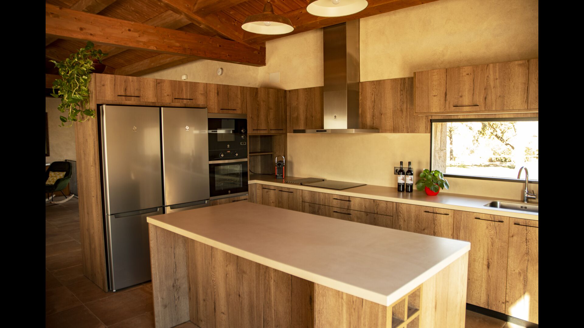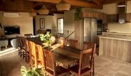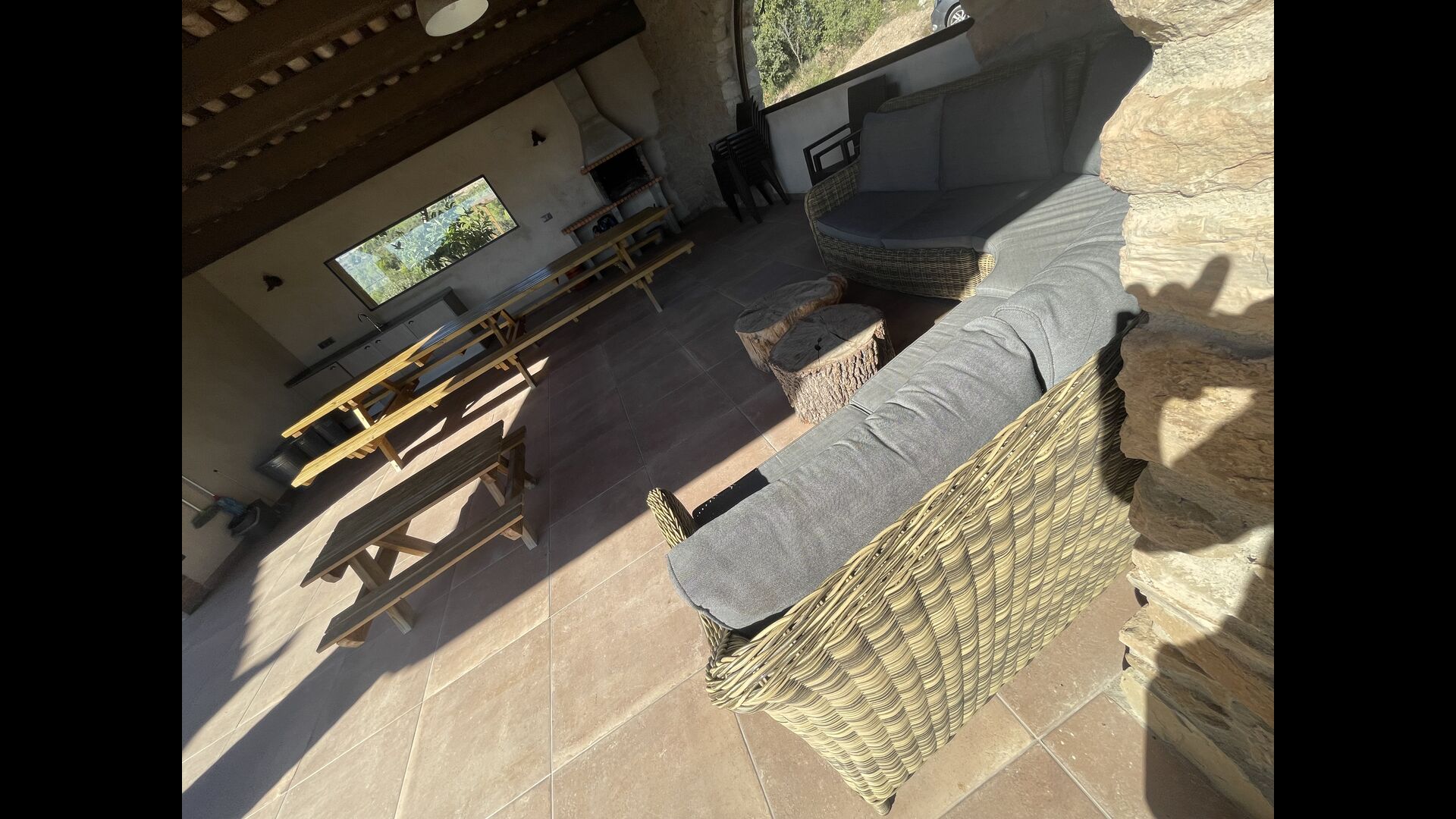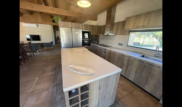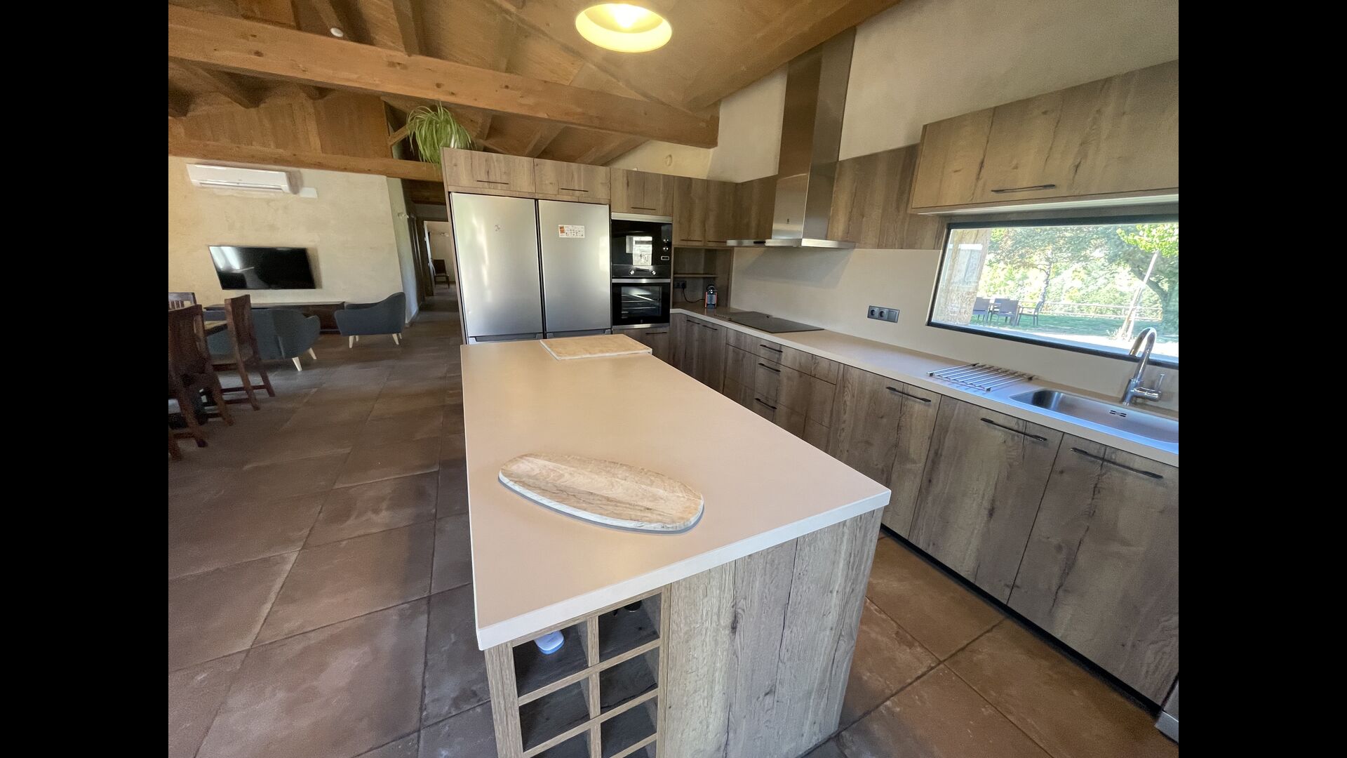 Le hall/salon principal, beau et tranquille, contient une grande et longue table à dîner en bois, et - une salle à manger. directement conjoint à cette zone - est la cuisine modernisée et de haute qualité avec 2 réfrigérateurs (avec congélateurs), un four et tout le nécessaire ustensiles de cuisine. Les deux zones sont baignées par les rayons chauds du soleil, ce qui en fait un endroit belle et attrayant pour prendre vos petits-déjeuners, déjeuners et dîners. Derrière la salle à manger se trouve le salon commun, équipé d'une cheminée, de confortables canapés, d'une table basse et d'une télévision. . La pièce est également climatisée, donc si la chaleur vous envahit, c'est l'endroit idéal pour vous allonger pendant les heures les plus chaudes de la journée.