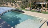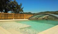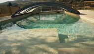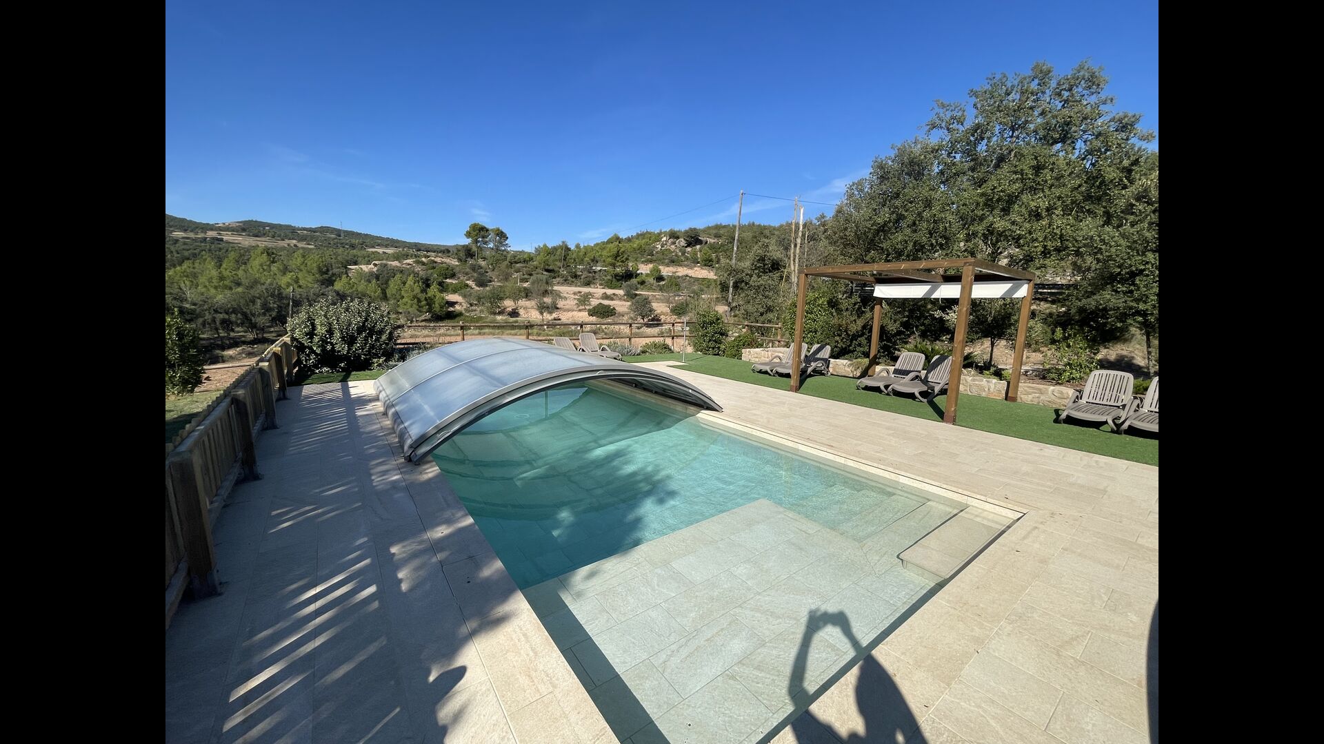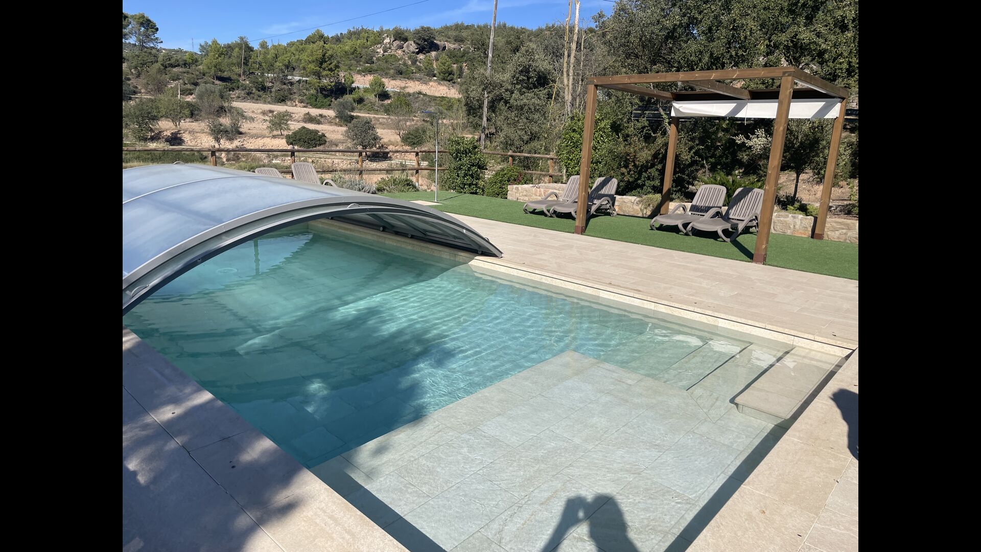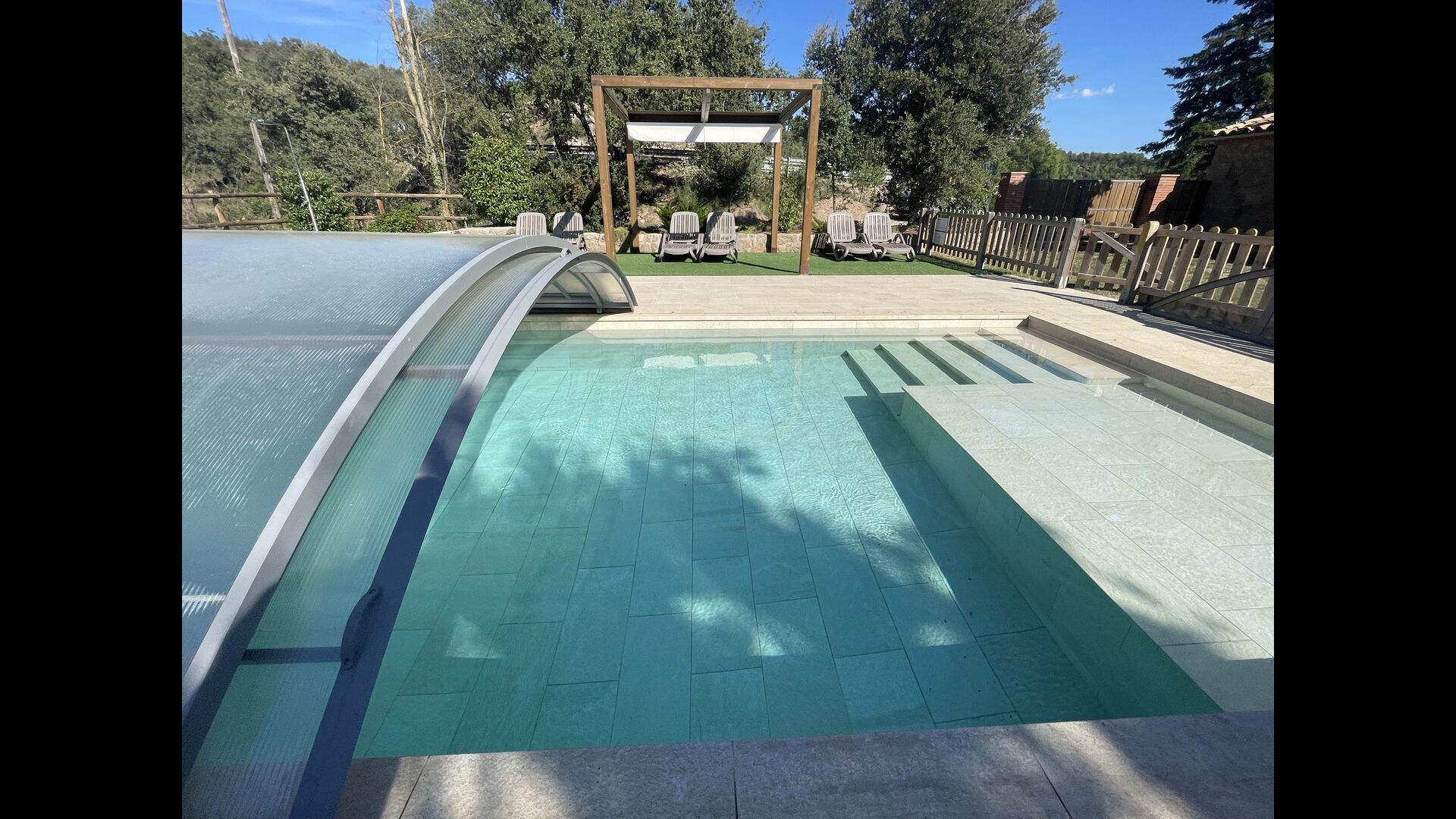 La merveilleuse zone piscine clôturée dispose de nombreux fauteuils inclinables, d'un mini-patio à toit ouvert (que vous pouvez couvrir pour l'ombrage) pour se détendre à l'ombre. La piscine elle-même est grande et spacieuse – avec des marches allant jusqu'au fond de la piscine, ce qui la rend plus sûre pour les enfants et les personnes âgées, et elle dispose également d'une section couverte et transparente d'un côté.