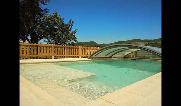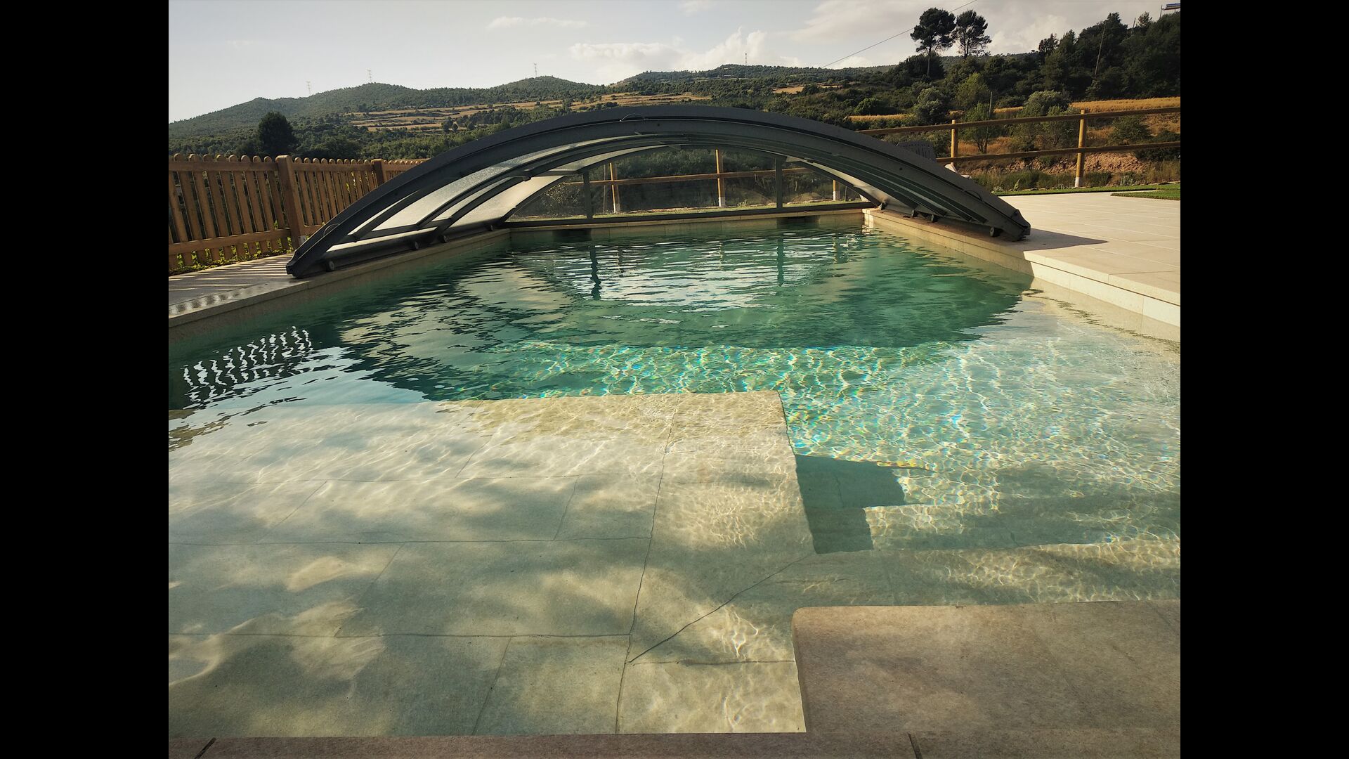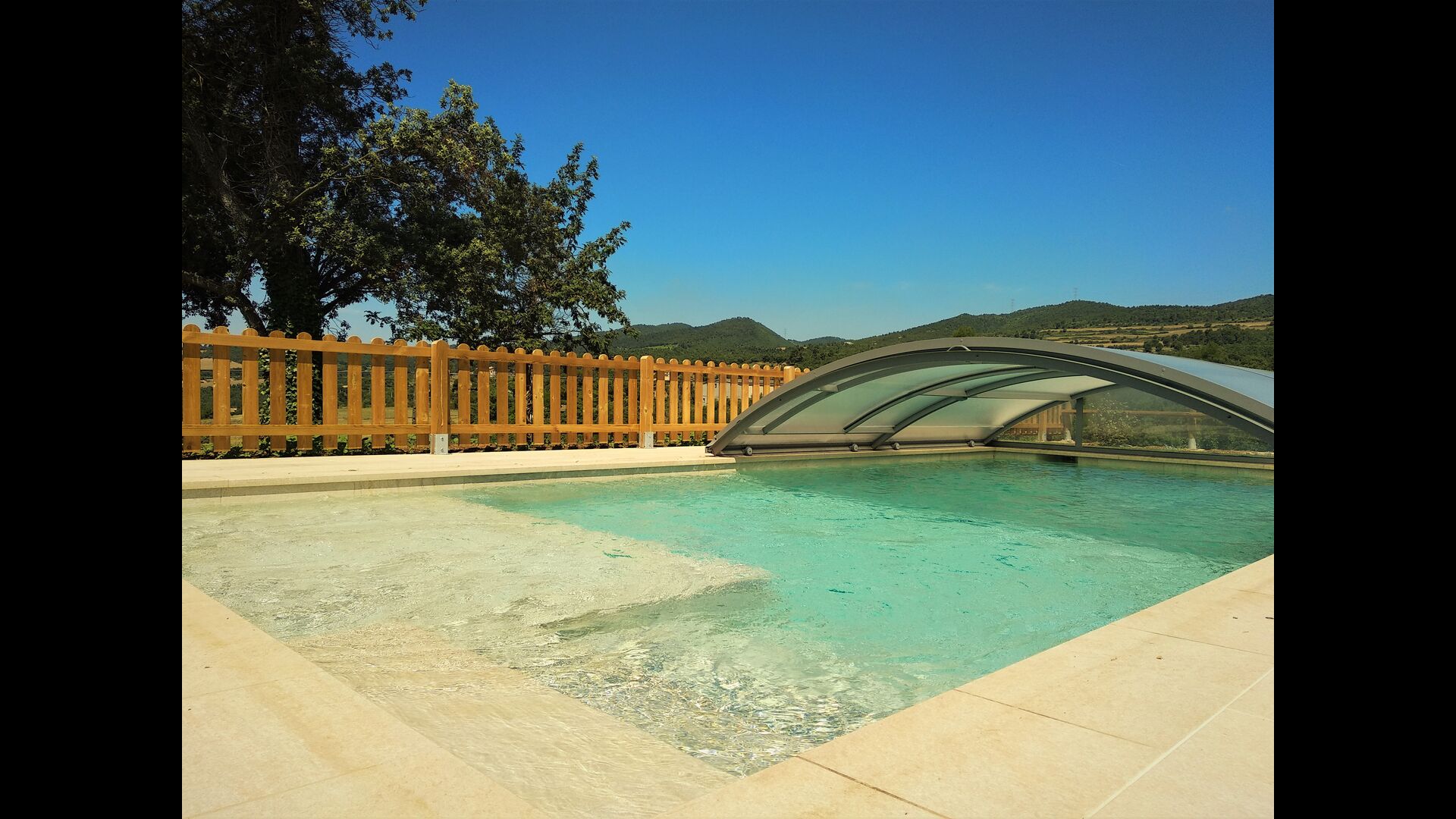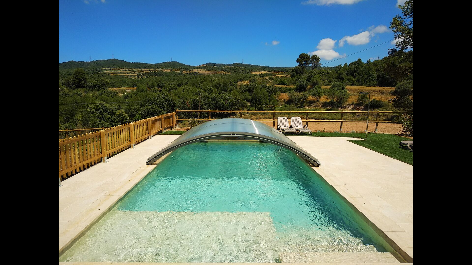 La merveilleuse zone piscine clôturée dispose de nombreux fauteuils inclinables, d'un mini-patio à toit ouvert (que vous pouvez couvrir pour l'ombrage) pour se détendre à l'ombre. La piscine elle-même est grande et spacieuse – avec des marches allant jusqu'au fond de la piscine, ce qui la rend plus sûre pour les enfants et les personnes âgées, et elle dispose également d'une section couverte et transparente d'un côté.