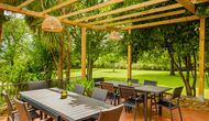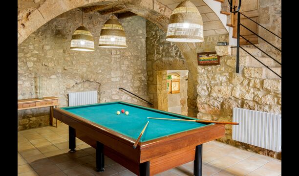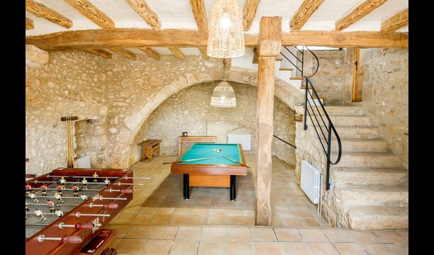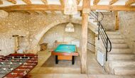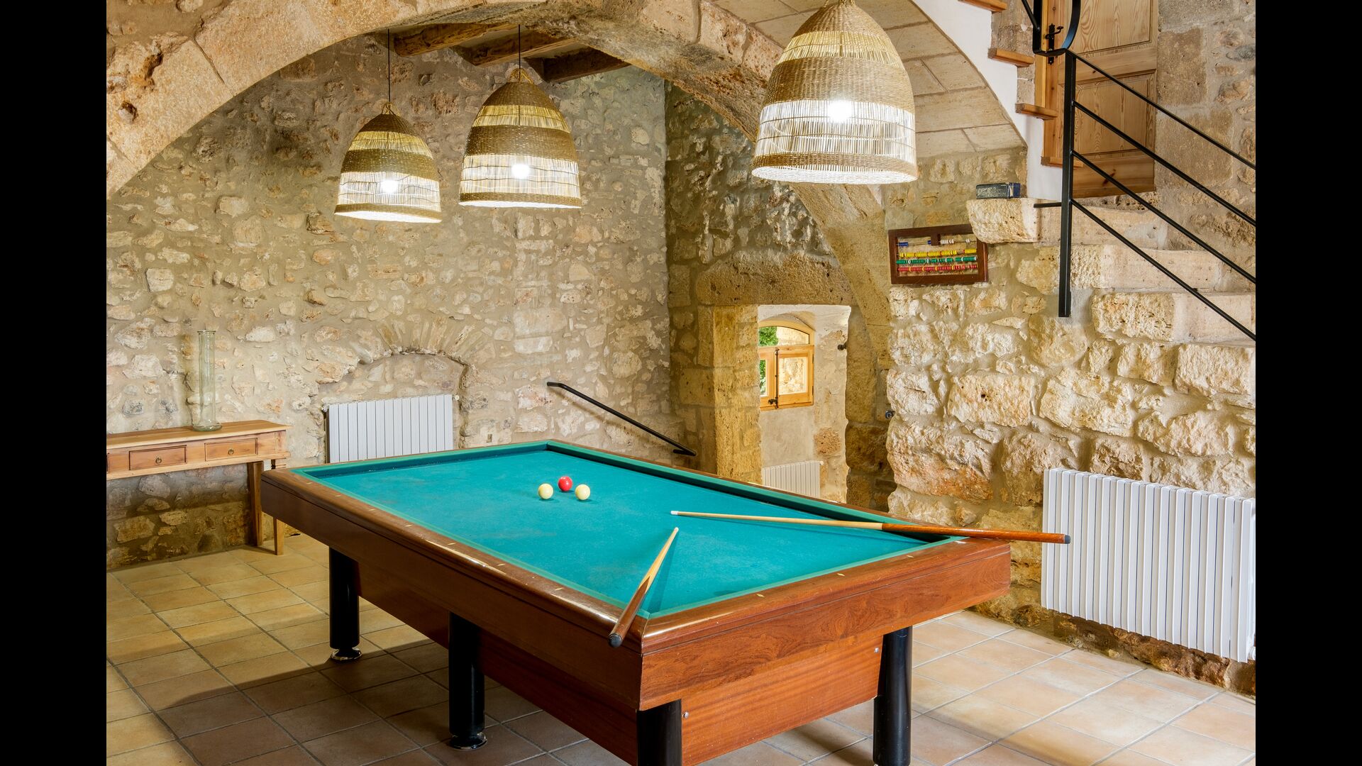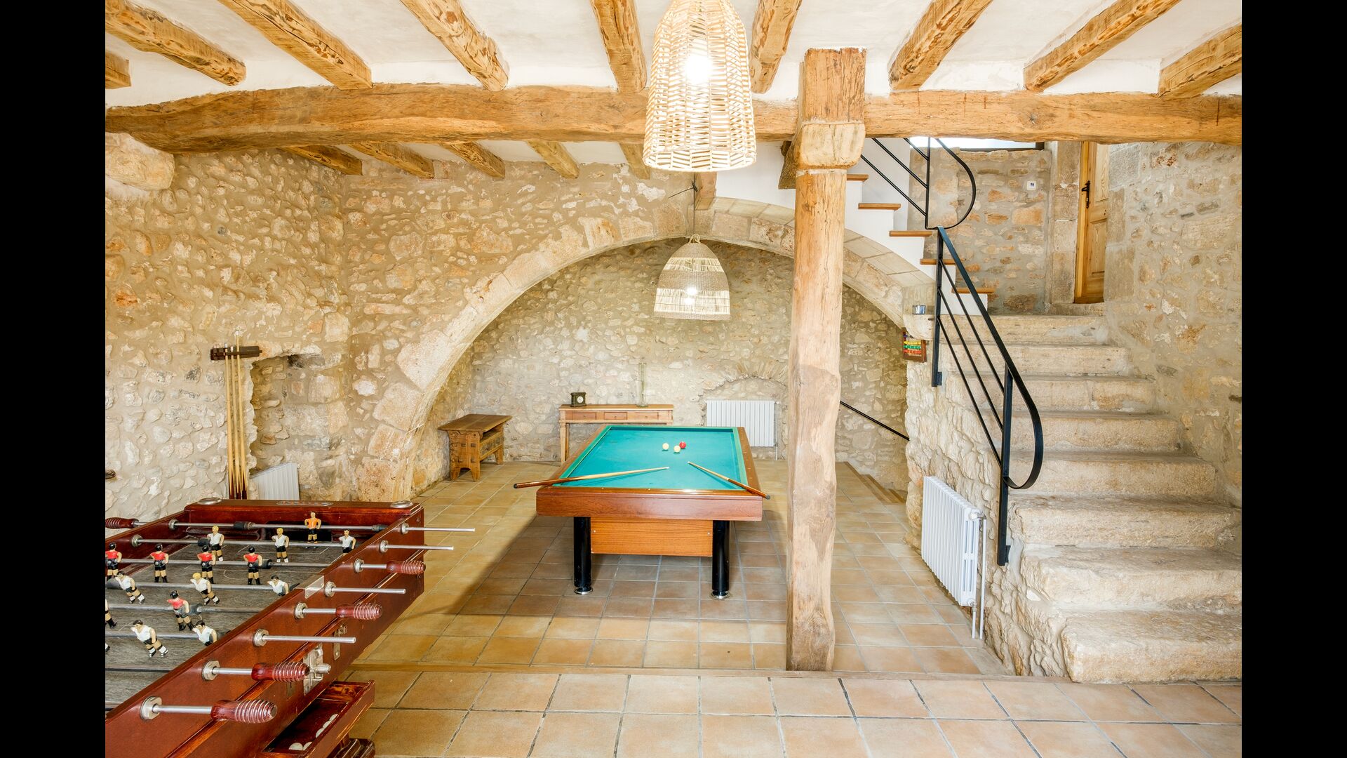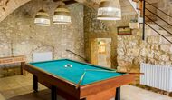 En entrant par l'entrée principale de la maison à l'arrière du bâtiment, au rez-de-chaussée, vous entrerez dans un grand hall. À quelques pas de là, vous trouverez un billard et un baby-foot – parfait pour les soirées jeux entre amis ou en famille ! En bas à droite se trouve une autre salle, avec plusieurs tables et bancs de taille moyenne, ainsi que deux canapés de taille moyenne et une large table basse. De plus, vous pouvez accéder directement au jardin à partir d'ici, et c'est un endroit idéal pour se retirer à l'intérieur lorsque vous souhaitez vous éloigner du chaud soleil.