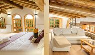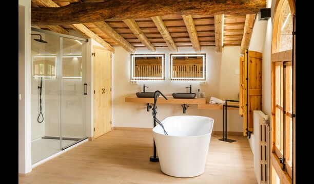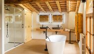 Au deuxième étage, vous trouverez les chambres et salles de bains restantes. Les chambres sont toutes spacieuses – avec une pièce ayant une salle de bain directement reliée à la chambre et une baignoire à ciel ouvert ! Derrière le lit de cette chambre, il y a aussi un coin canapé pour se détendre et regarder la télévision !