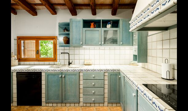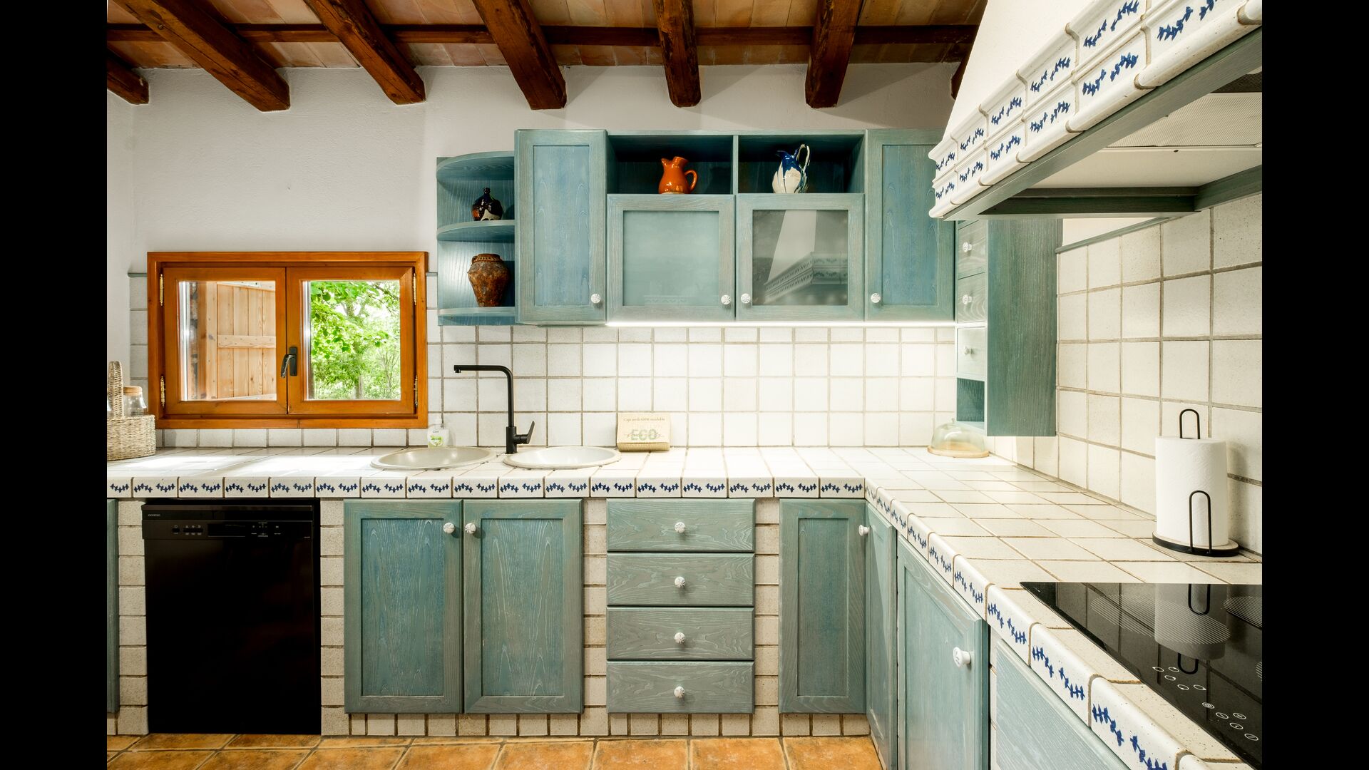 Au premier étage se trouve également la cuisine, avec tous les équipements attendus d'une maison de vacances moderne (ustensiles, casseroles/poêles, réfrigérateur, lave-vaisselle, four ) – ainsi qu'un congélateur, grille-pain, cafetière, micro-ondes, bouilloire électrique et cuiseur à riz. La terrasse de la maison est accessible directement depuis la cuisine, vous permettant facilement de prendre votre nourriture à l'extérieur pour dîner au coucher du soleil, avec vue sur le cadre soleil, le jardin et la belle campagne plus loin (et si vous avez envie d'une soirée barbecue, tout l'équipement nécessaire pour les grillades se trouve de l'autre côté de la maison, sous un autre couvert terrasse). Vous trouverez également 2 chambres et salles de bains au premier étage.