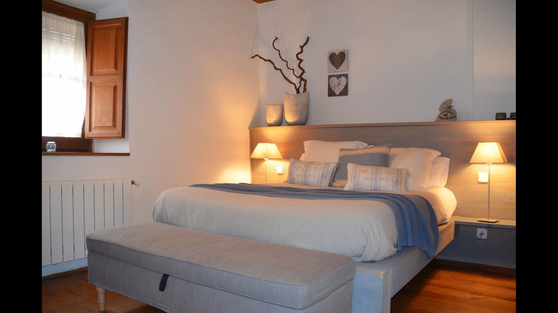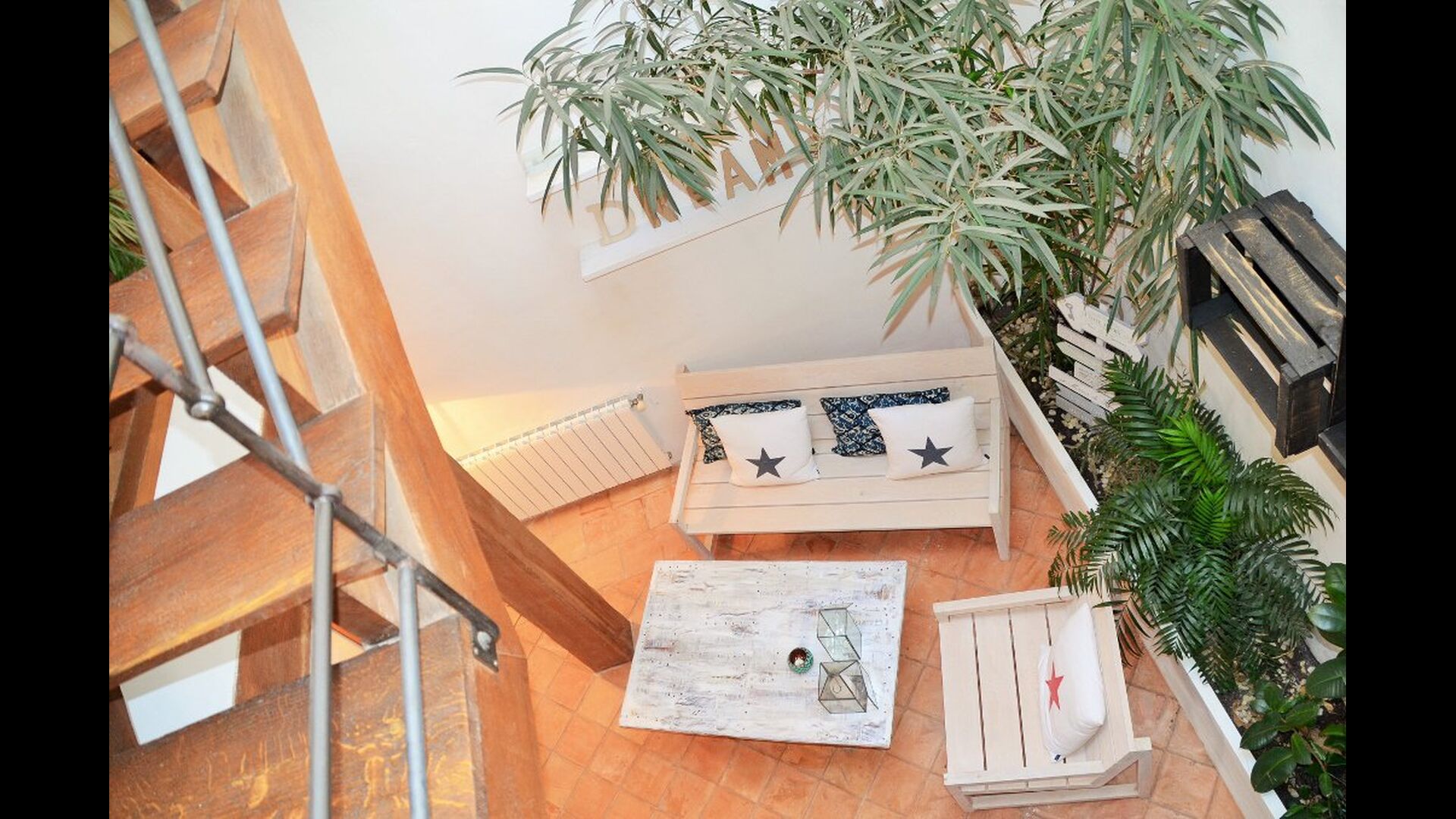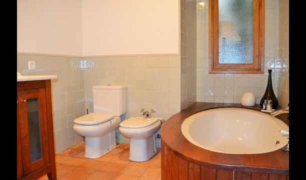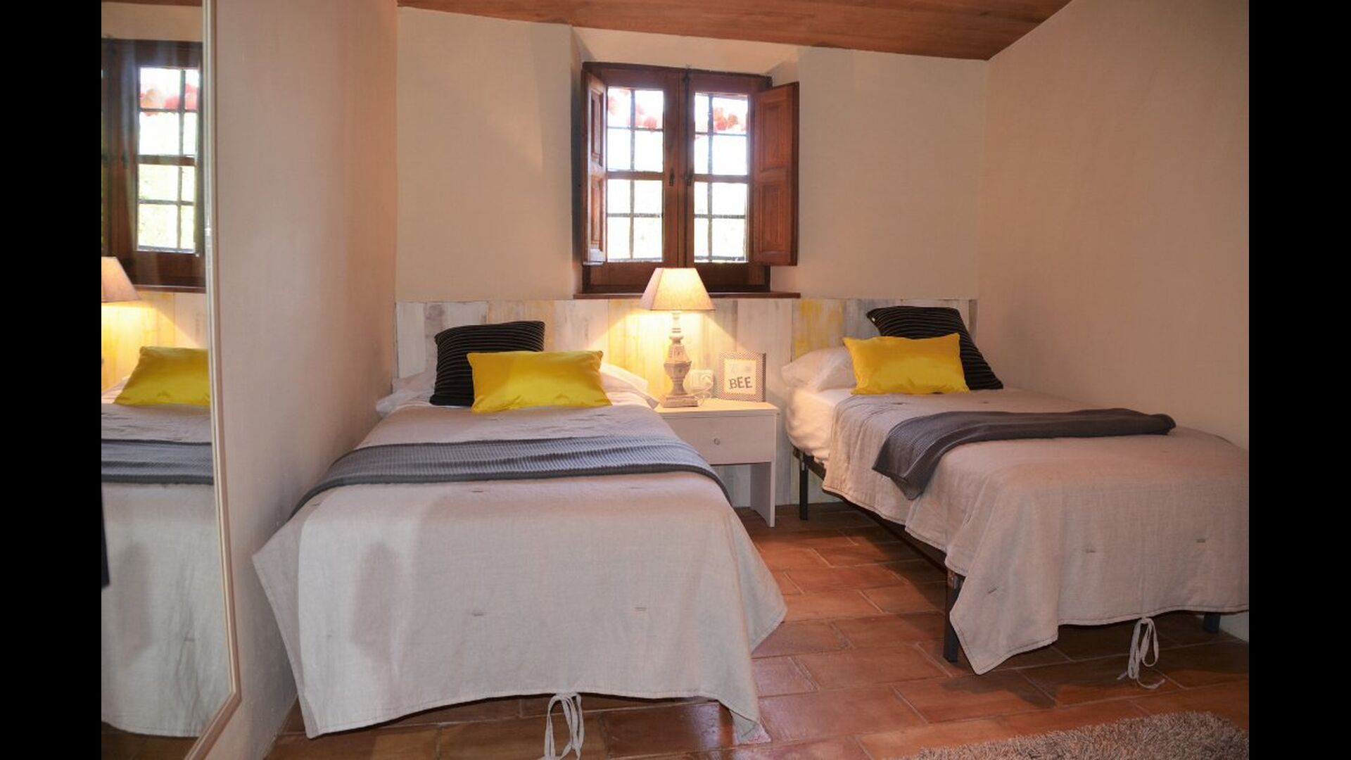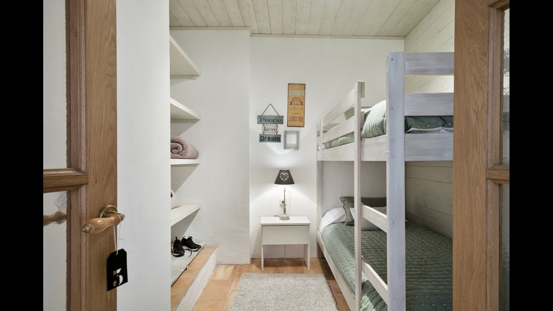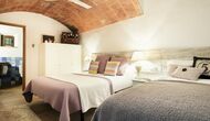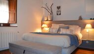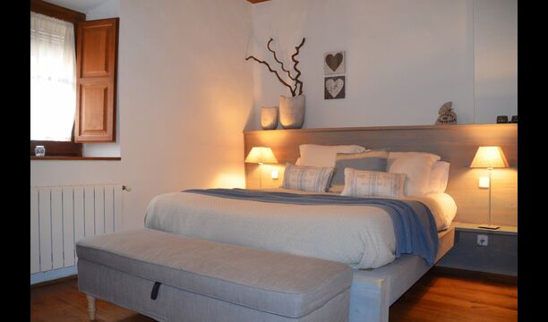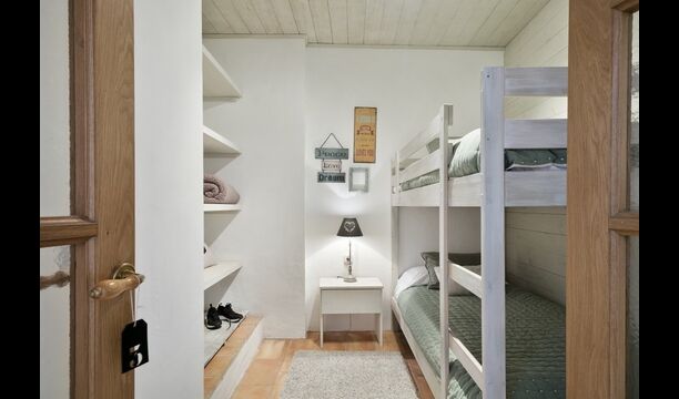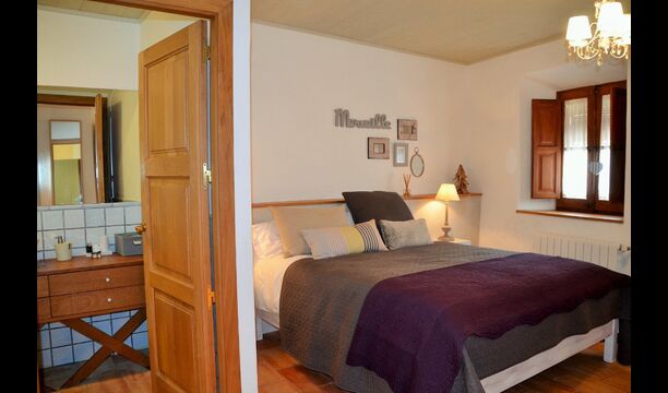 En entrant, vous trouverez une chambre à votre gauche et une autre à votre droite; tous deux arrangés à la perfection. Elles disposent toutes deux d'une salle de bains privative (une avec baignoire), d'une télévision à écran plat et d'une décoration moderne et confortable. Plus loin dans le couloir, vous trouverez les deux dernières chambres au premier étage. La première dispose d'un lit double et d'un lit simple, ainsi que d'une salle de bains privative. La seconde a un lit superposé et convient aux enfants. De même, ces deux sont organisés dans un style très moderne et confortable. Quatre des cinq chambres sont situées au premier étage et la dernière au deuxième étage, qui offre deux lits simples, avec bien sûr la possibilité de les réunir en un lit double. Le premier étage se termine par une zone de détente aménagée avec un toit ouvert jusqu'au troisième étage.
