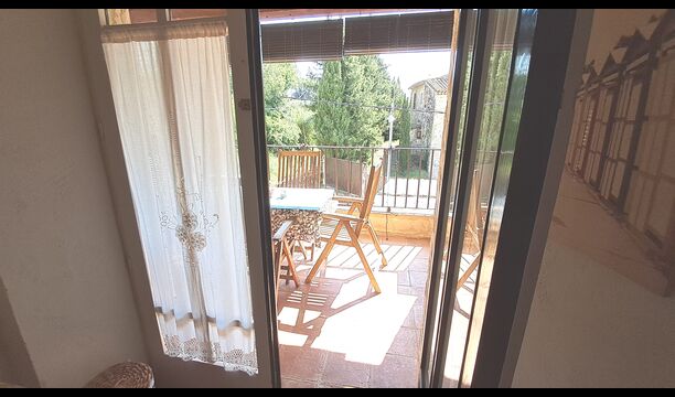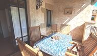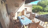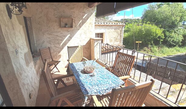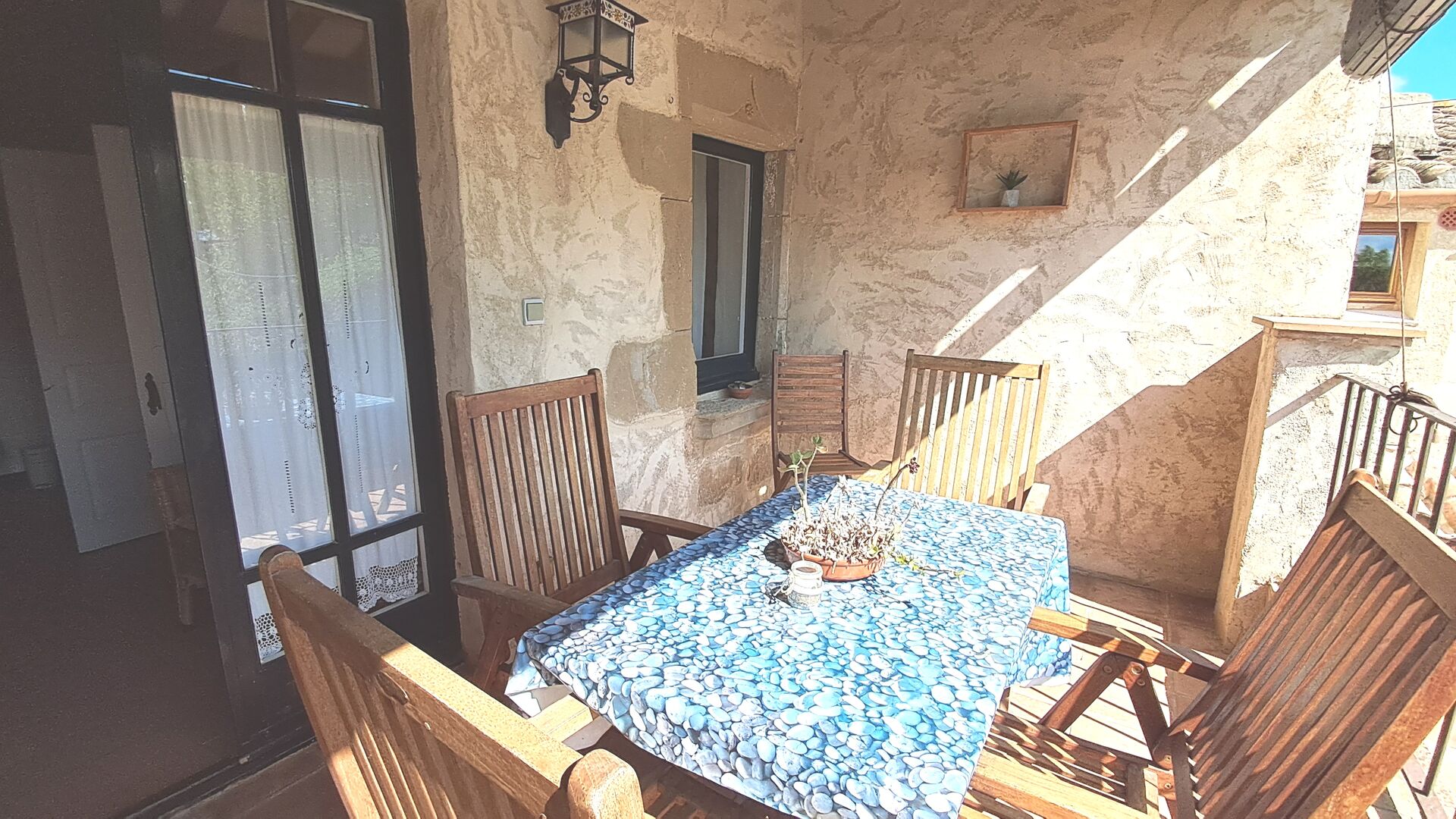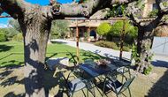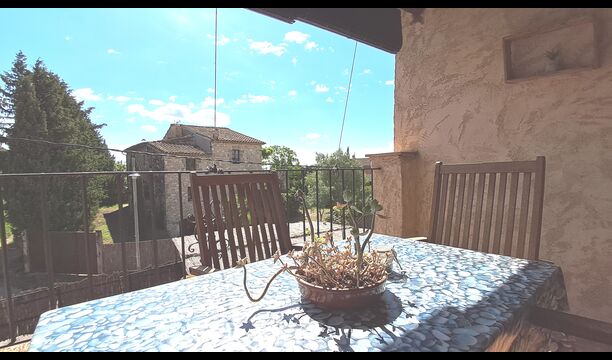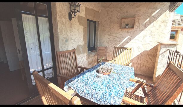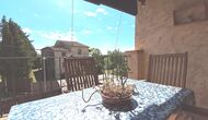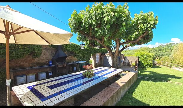 Il y a aussi la terrasse couverte, avec des chaises, une petite table et – plus en arrière - un canapé en pierre fixé au mur. Dans le jardin, vous trouverez également une installation de tennis de table et un petit terrain de football.