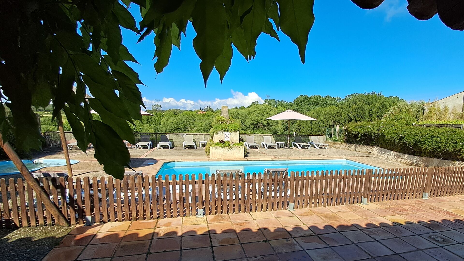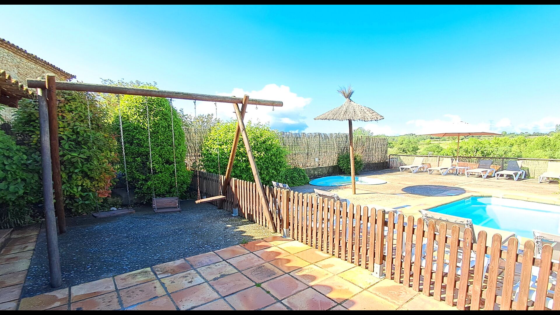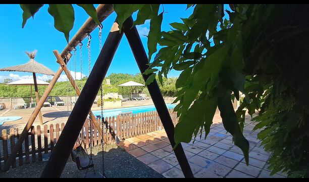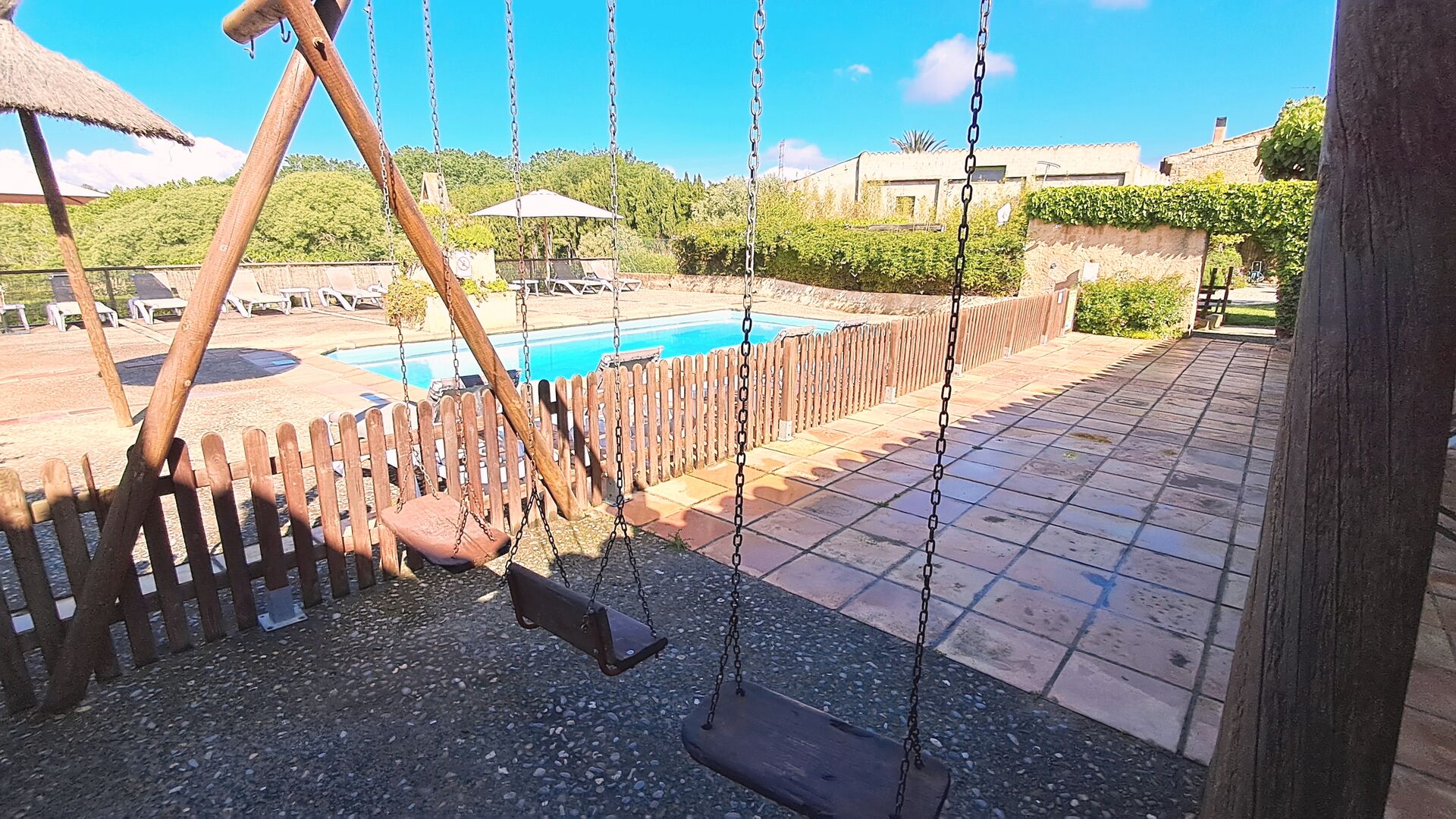L'une est lapiscine commune partagée, avec une piscine ronde séparée pour les enfants. Les deux piscines se trouvent dans la même zone, qui est clôturée. Il y a plusieurs chaises longues pour vous allonger et vous détendre également. De l'autre côté de la clôture, il y a une balançoire pour les enfants.