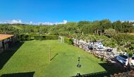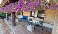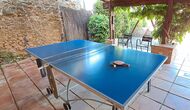 Il y a aussi la terrasse couverte, avec des chaises, une petite table et – plus en arrière - un canapé en pierre fixé au mur. Dans le jardin, vous trouverez également une installation de tennis de table et un petit terrain de football.