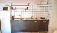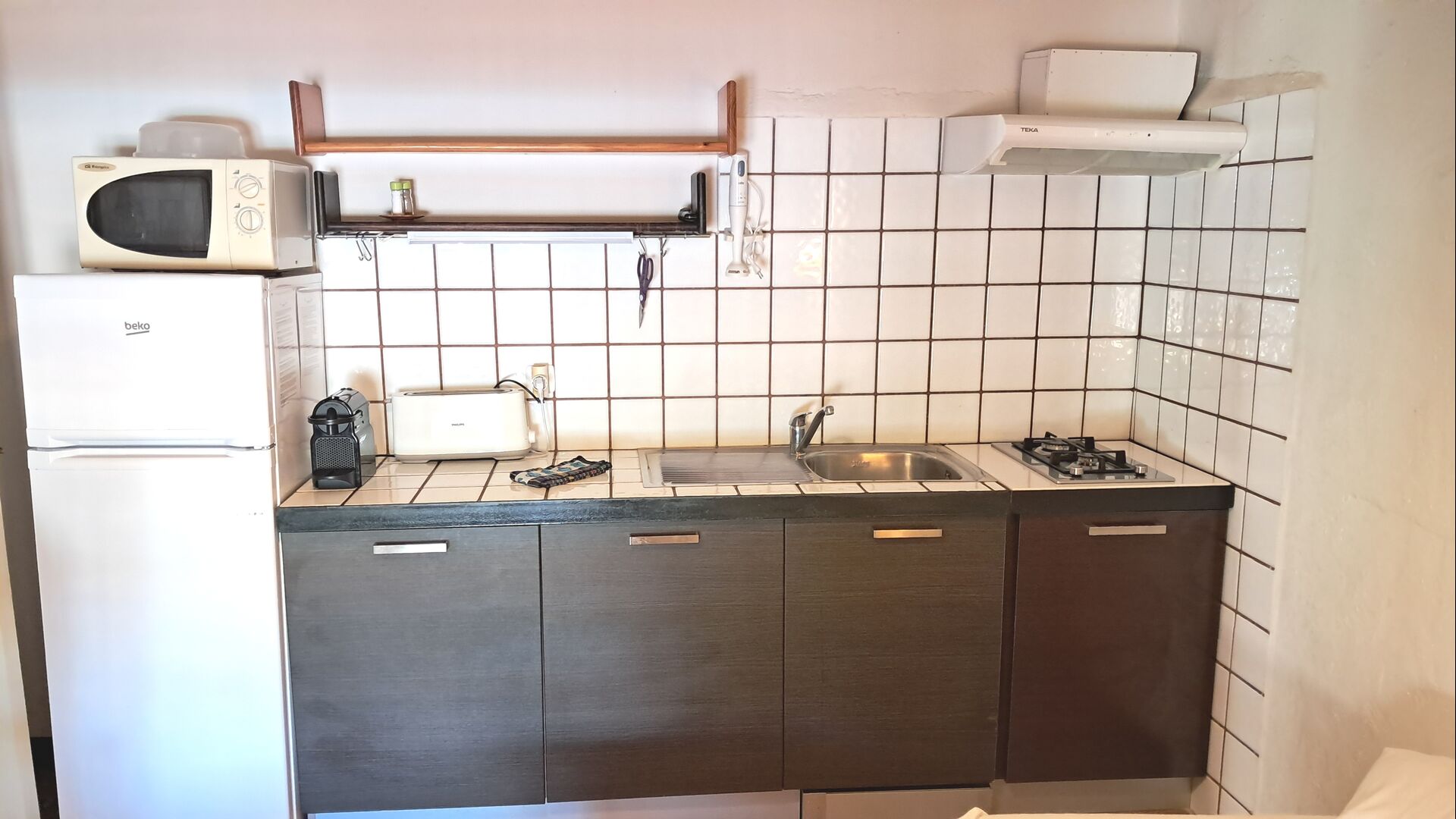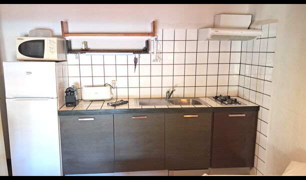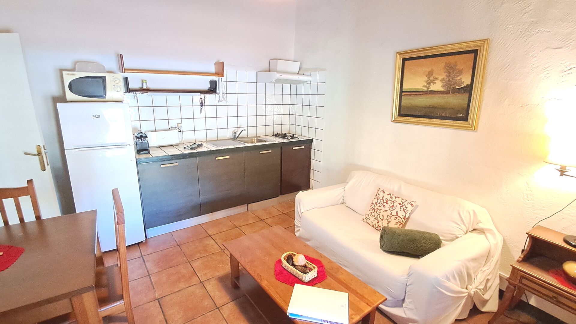 La cuisine est intégrée à la salle commune. Ilest bien équipé avec lave-vaisselle, réfrigérateur-congélateur, grille-pain, cafetière à capsules Nespresso, micro-ondes et plaque vitrocéramique.